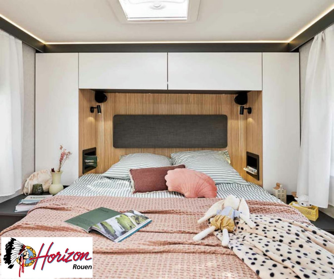 LES ÉQUIPEMENTS INCLUS :• Motorisation 2,2 L - 140 ch - boîte automatique.• Châssis Fiat 3,5 T.• Cabine noire. NOUVEAU• PACK JANTES : jantes alliage 16”, volant en simili, aérateurs gris aluminium.• PACK MÉDIA 7” : autoradio 7” Pioneer® , DAB, AppleCar / Android Auto, caméra de recul, hautparleursdans la cabine et la cellule.• Batterie lithium 210 Ah et 2 panneaux solaires 100 W monocristallin TOPCon hauteperformance. NOUVEAU• Booster pour une charge rapide de la batterie• Chauffage hybride Truma® D 6E (Diesel / 230 V). NOUVEAU• Réfrigérateur à compression Thedford® 150 ou 158 l, selon modèle. NOUVEAU• Store banne.• Tiroir bas de caisse.• Douchette eau froide/chaude dans la soute arrière.• Lit pavillon électrique avec sommier à lattes.• Sellerie bi-ton et bi-matière simili et tissu «Sand». NOUVEAU• Ambiance Pyla