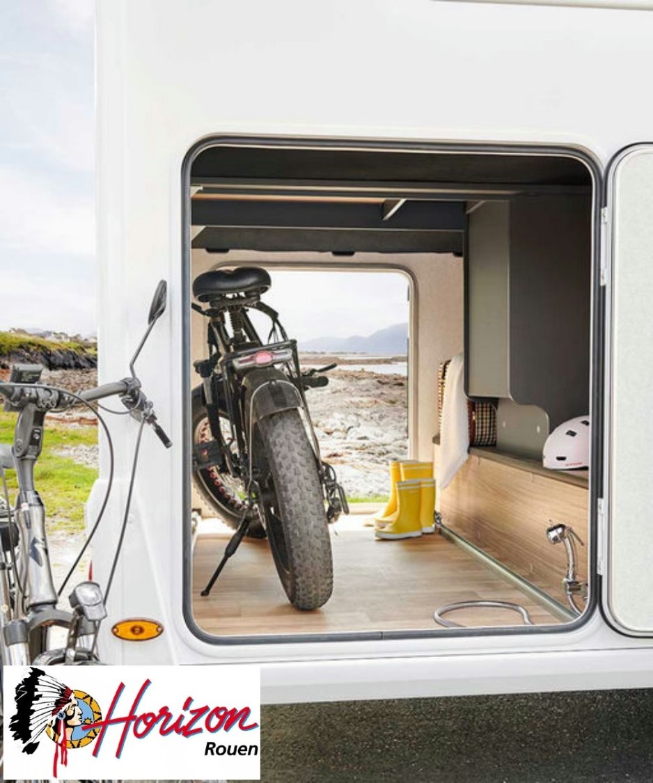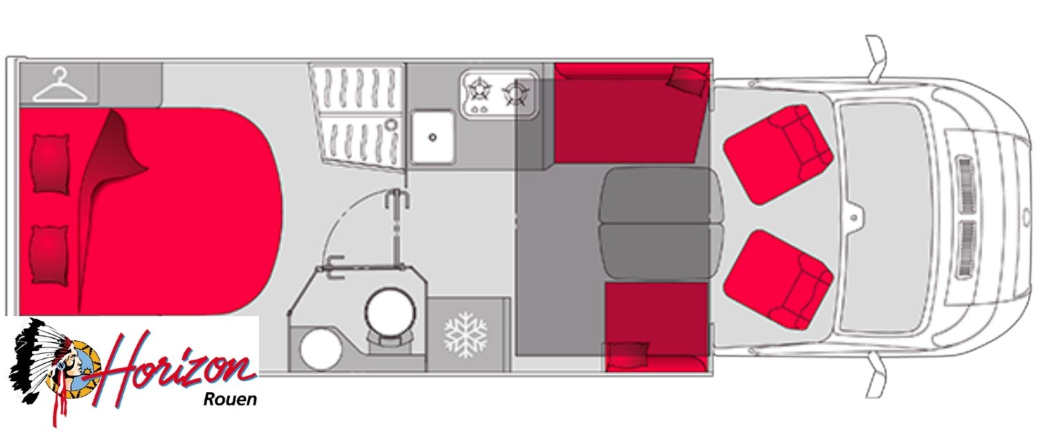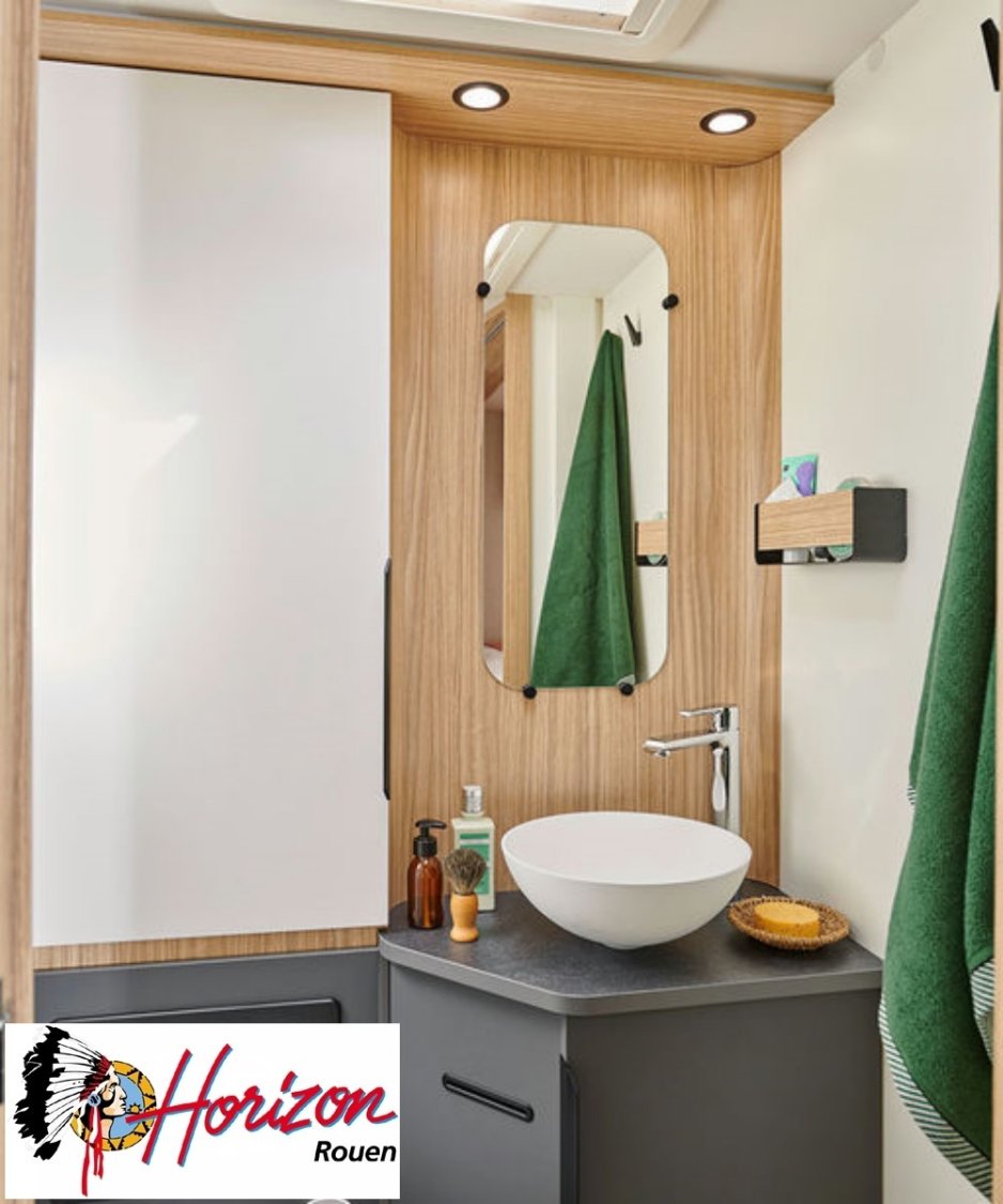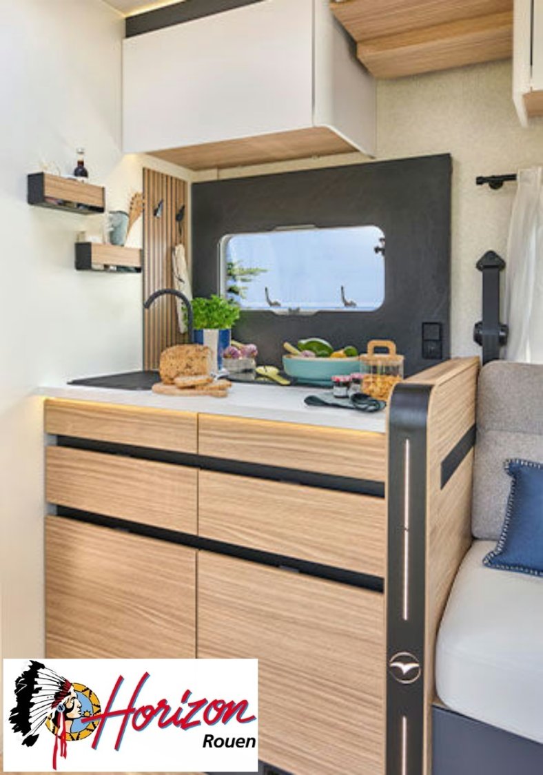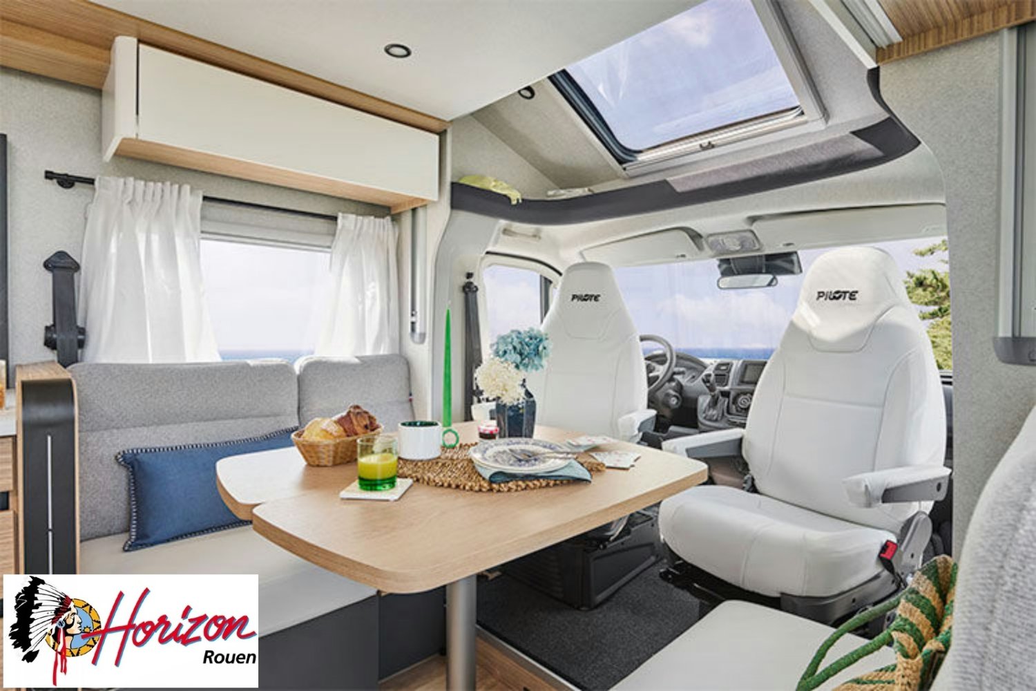 • Motorisation 2,2 L - 140 ch - boîte automatique. • Châssis Fiat 3,5 T. • Cabine noire. NOUVEAU • PACK JANTES : jantes alliage 16”, volant en simili, aérateurs gris aluminium. • PACK MÉDIA 7” : autoradio 7” Pioneer® , DAB, AppleCar / Android Auto, caméra de recul, hautparleurs dans la cabine et la cellule. • Batterie lithium 210 Ah et 2 panneaux solaires 100 W monocristallin TOPCon haute performance. NOUVEAU • Booster pour une charge rapide de la batterie • Chauffage hybride Truma® D 6E (Diesel / 230 V). NOUVEAU • Réfrigérateur à compression Thedford® 150 ou 158 l, selon modèle. NOUVEAU • Store banne. • Tiroir bas de caisse. • Douchette eau froide/chaude dans la soute arrière. • Lit pavillon électrique avec sommier à lattes. • Sellerie bi-ton et bi-matière simili et tissu «Sand». NOUVEAU • Ambiance Pyla.