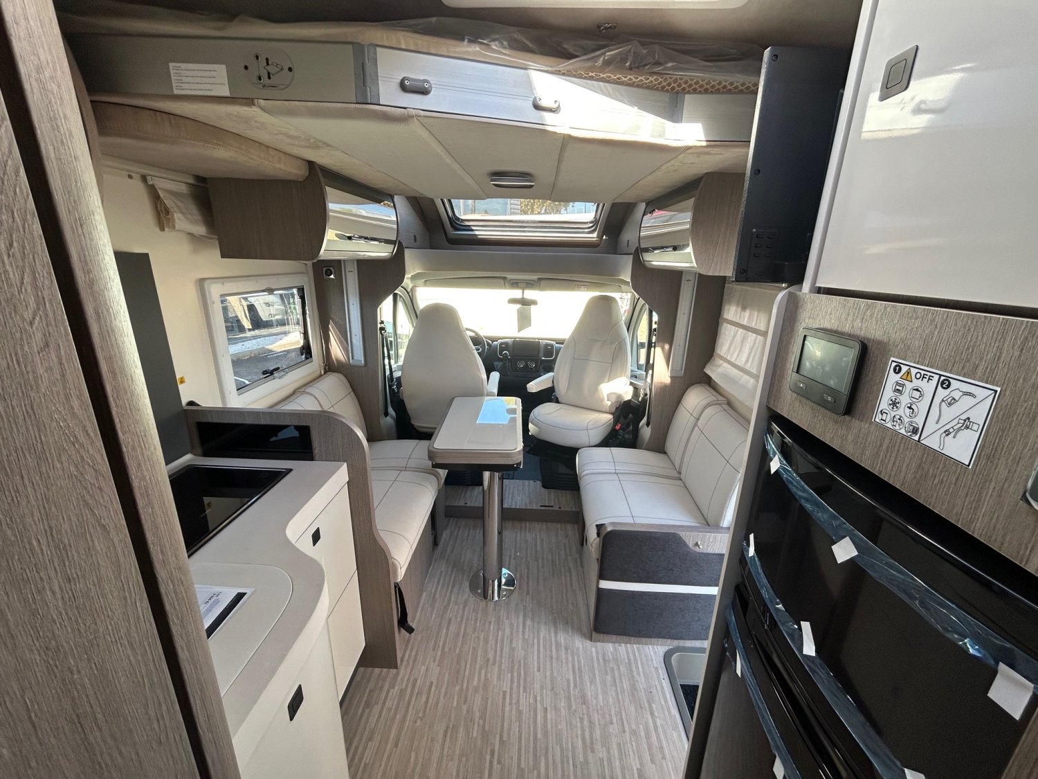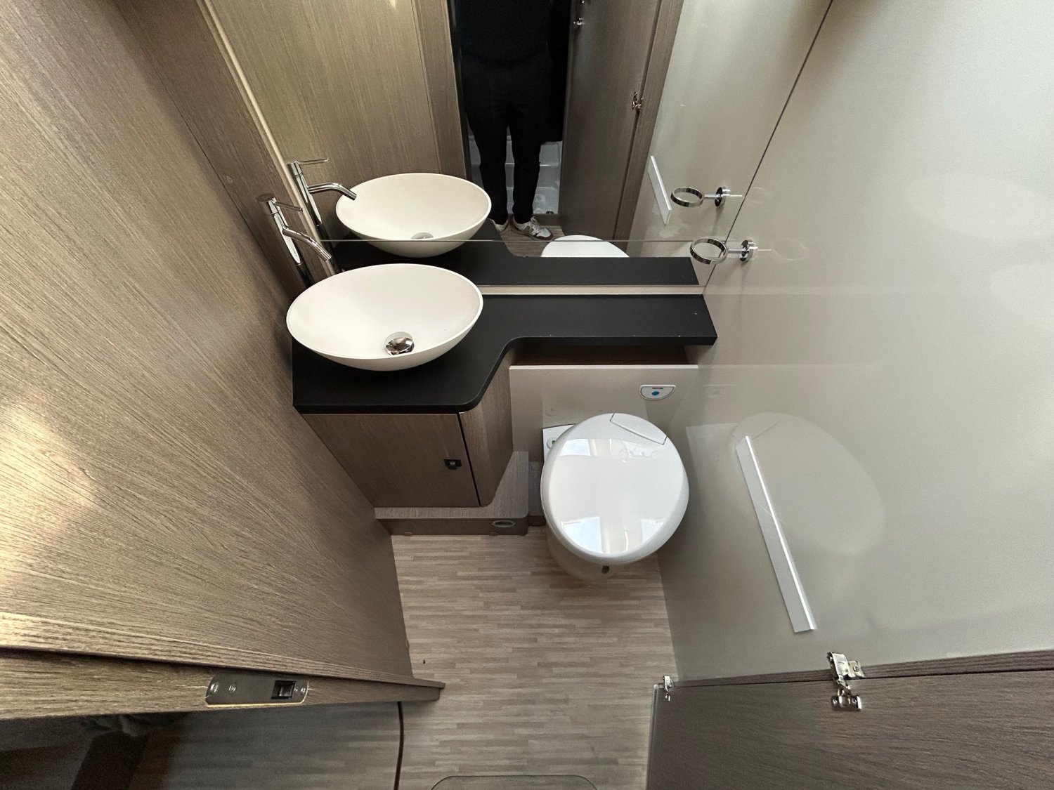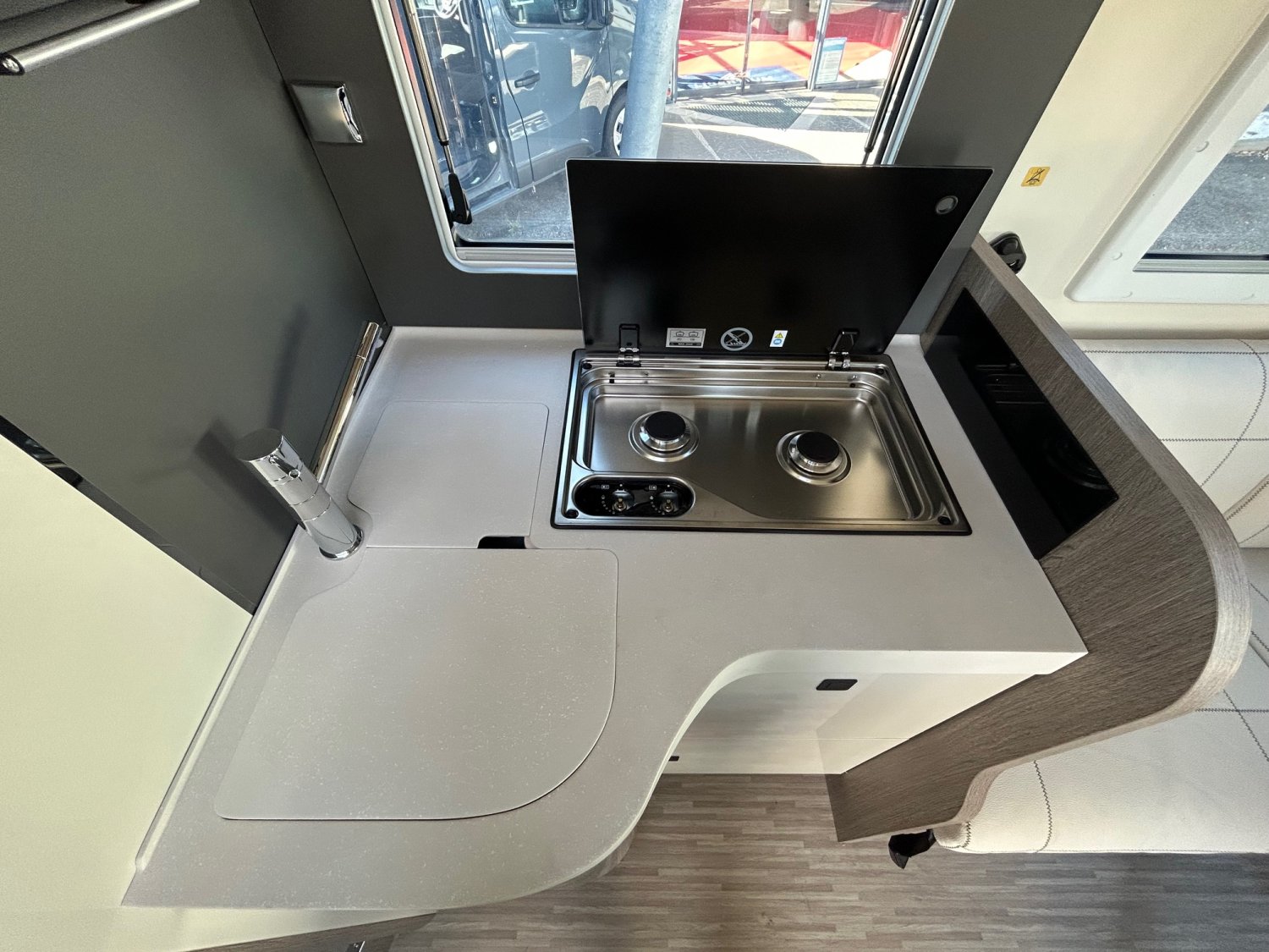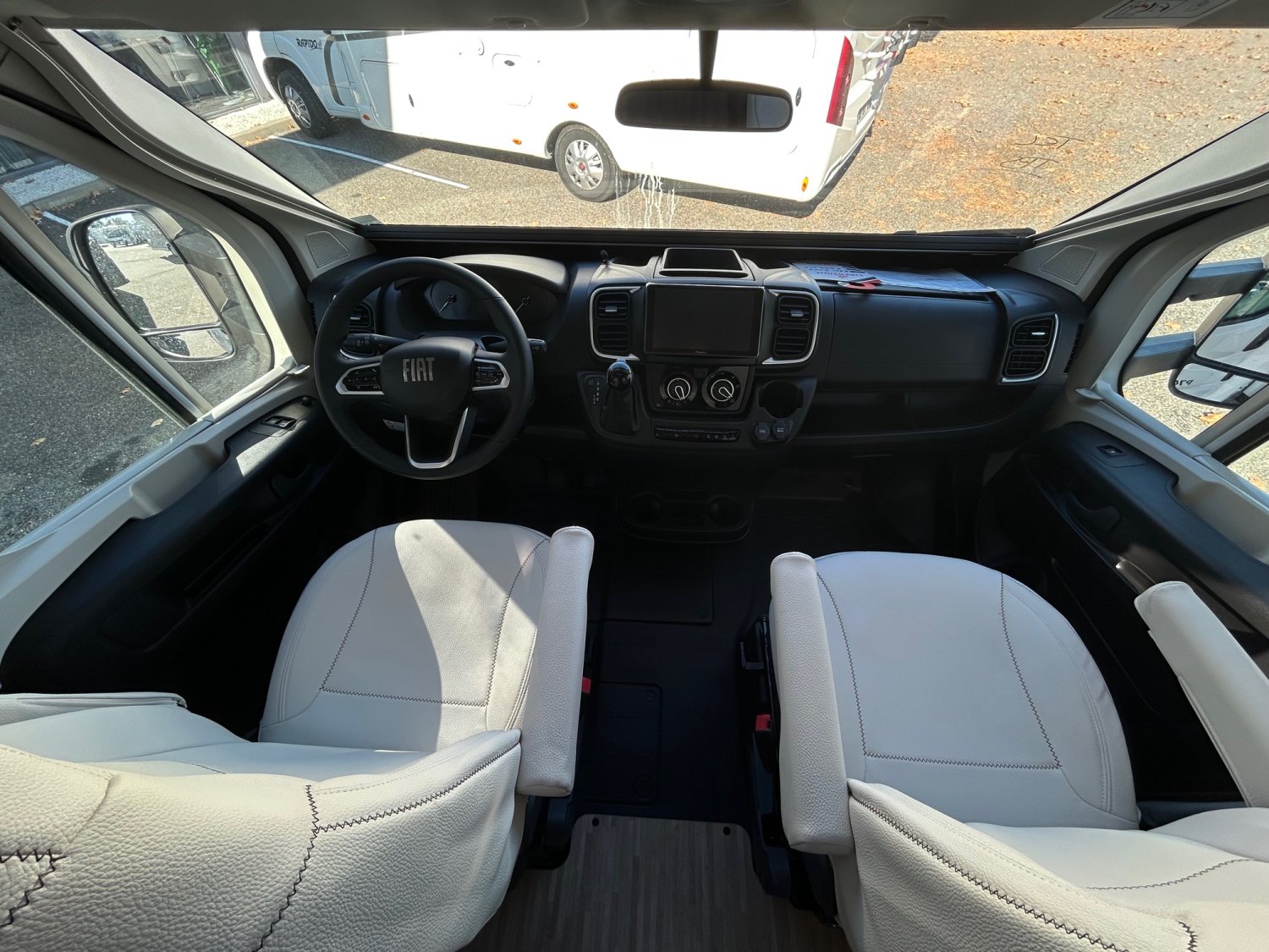 Profilé familial premium (7,47 m) – 4 places carte grise / 4 couchages. Motorisation 2,2 L – 140 ch sur porteur FIAT. Grand salon face-à-face, lits jumeaux « maxi dimensions » convertibles en lit central, cuisine équipée haut de gamme, salle d’eau complète séparée, chauffage habitable, grands réservoirs (eaux propres ~120 L / eaux usées ~110 L)Design intérieur contemporain, isolation renforcée, équipements « Pack Ready to Go » ultra-complets (panneau solaire 200 W, jantes alliage, store extérieur, TV, etc.)