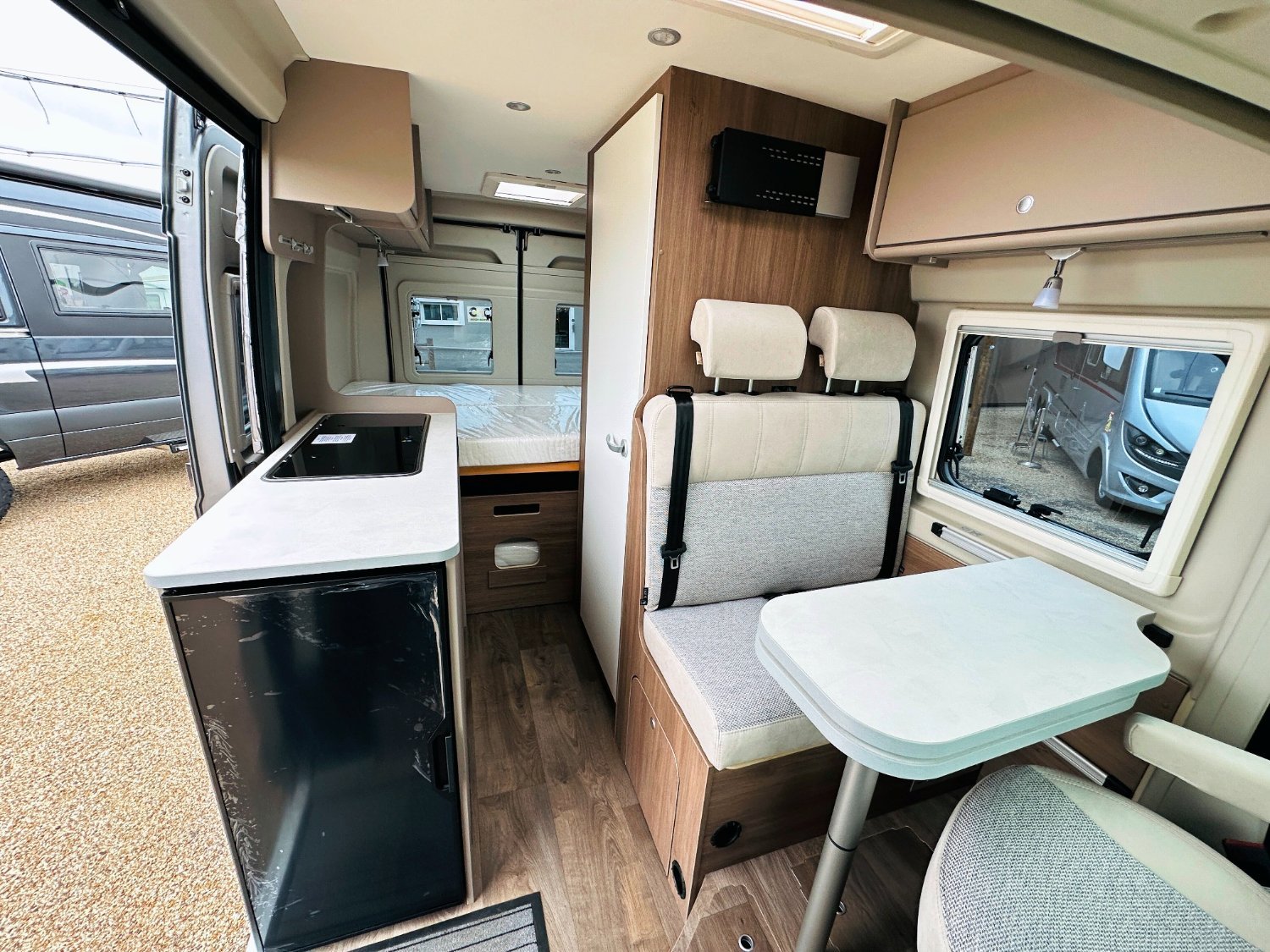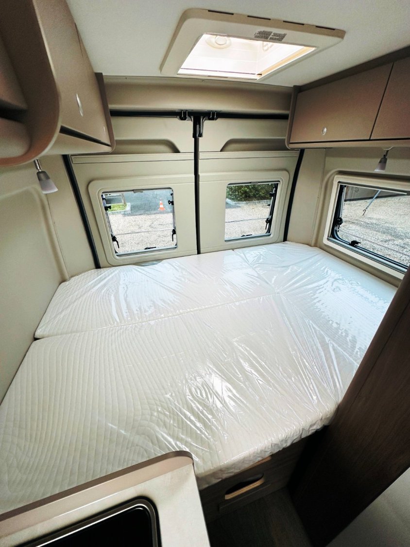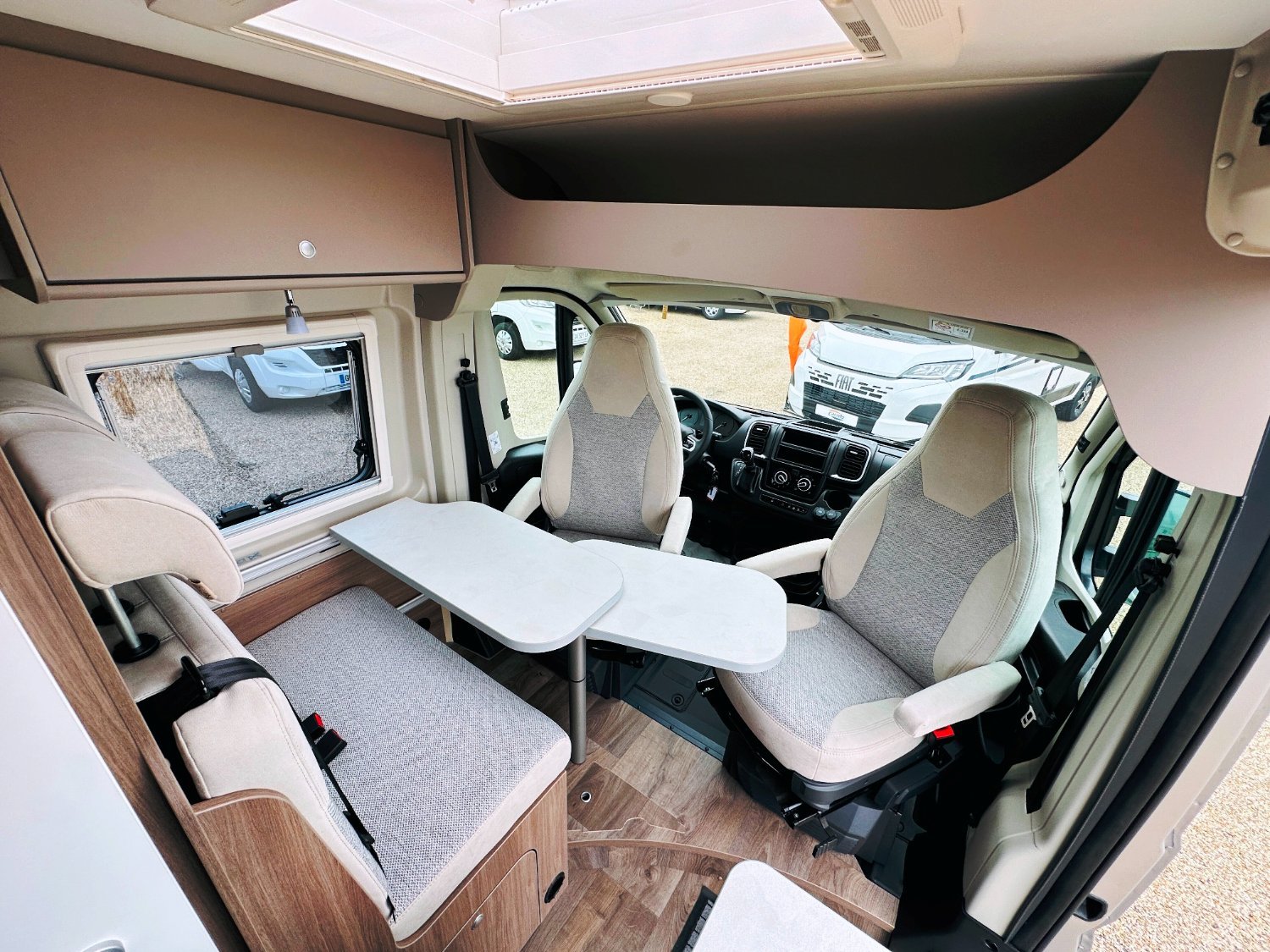 CARADO CV 540 PRO, collection 2026, 5.40 M, 3 couchages, lit permanent arrière modulable (possibilité de dégager un vaste couloir), salle de bain avec douche intégrée et plan de travail, salon avant avec sièges pivotant. Cuisine droite équipée de nombreux rangements et d’un vaste plan de travail.