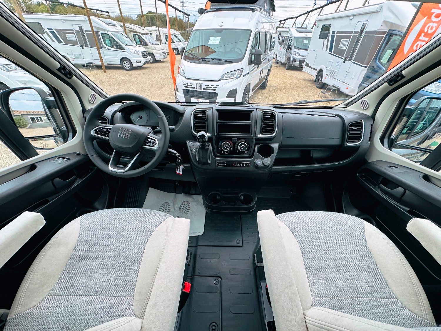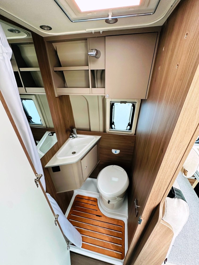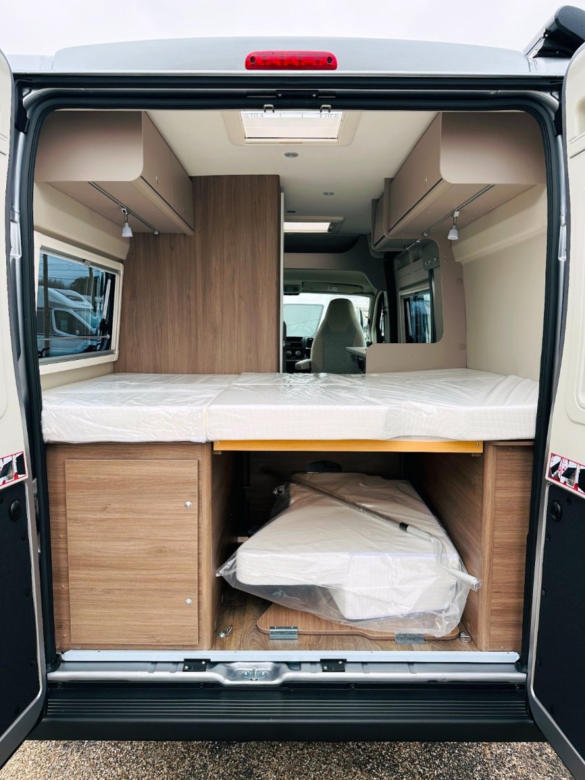 CARADO CV 540 PRO, collection 2026, 5.40 M, 3 couchages, lit permanent arrière modulable (possibilité de dégager un vaste couloir), salle de bain avec douche intégrée et plan de travail, salon avant avec sièges pivotant. Cuisine droite équipée de nombreux rangements et d’un vaste plan de travail.