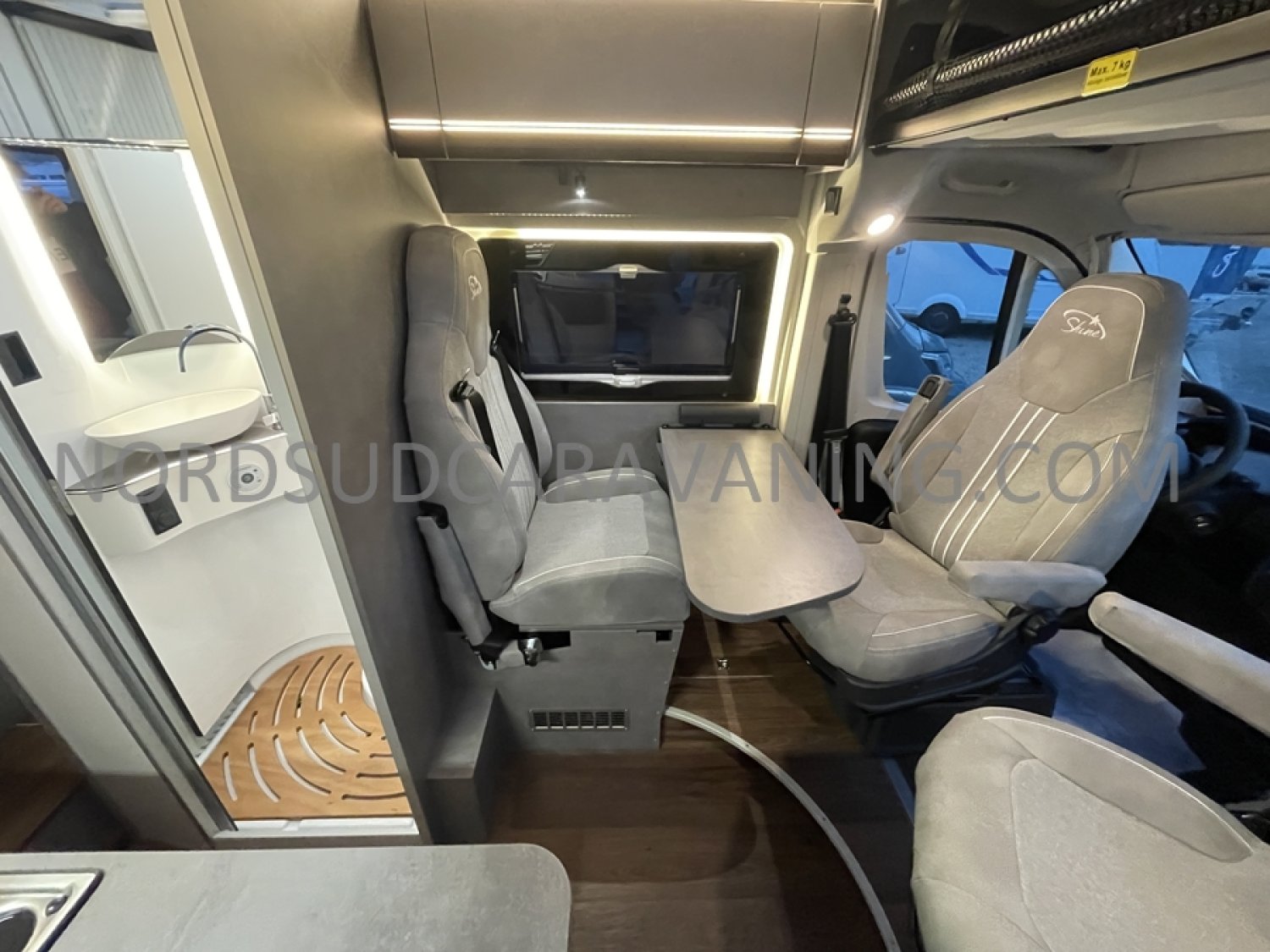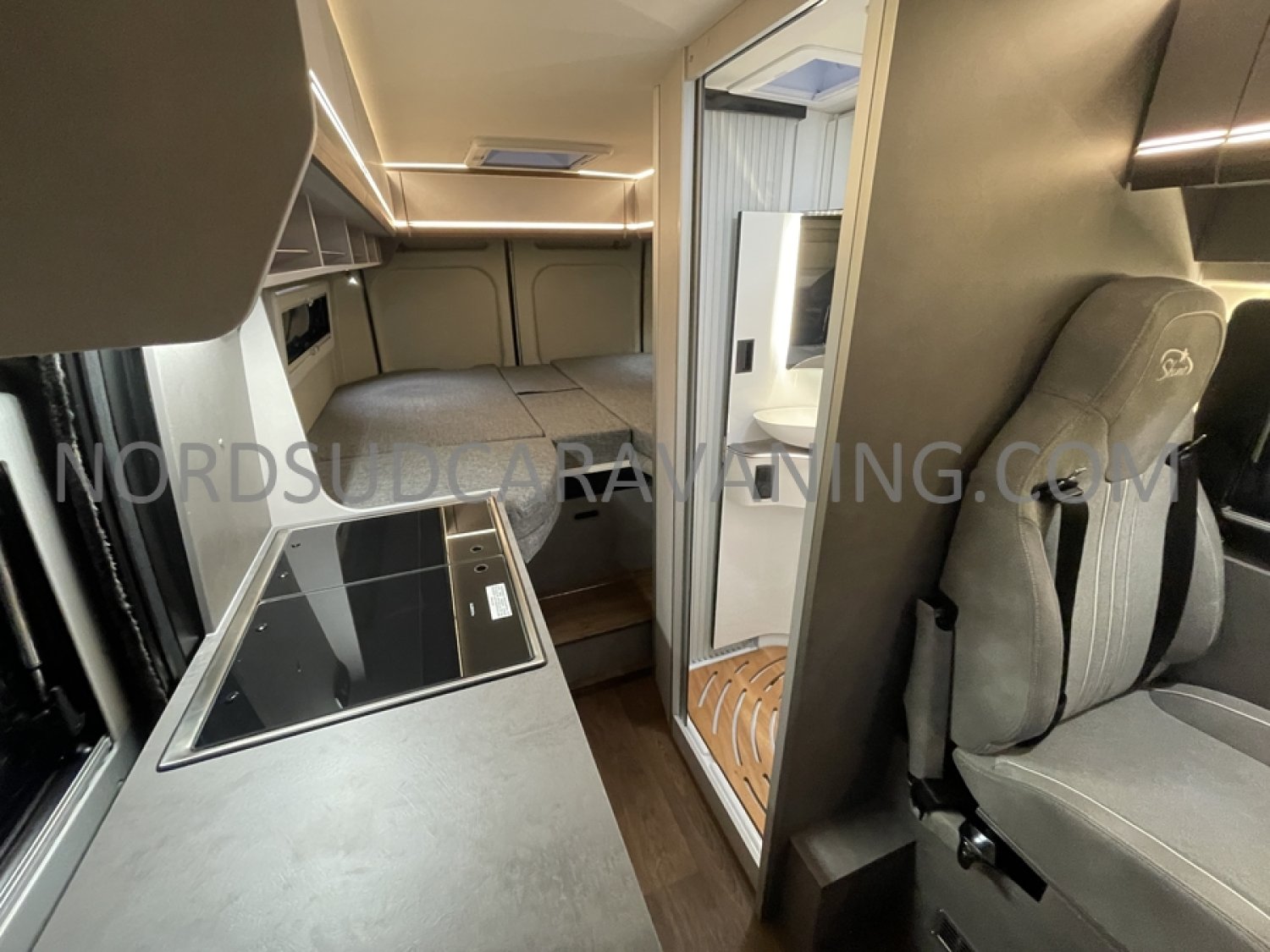 Long de 5.99 mètres, il offre à l’arrière une zone de nuit XXL avec lits jumeaux unifiables.