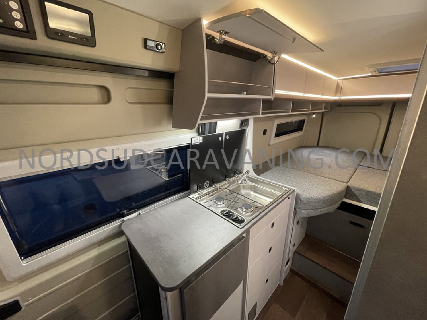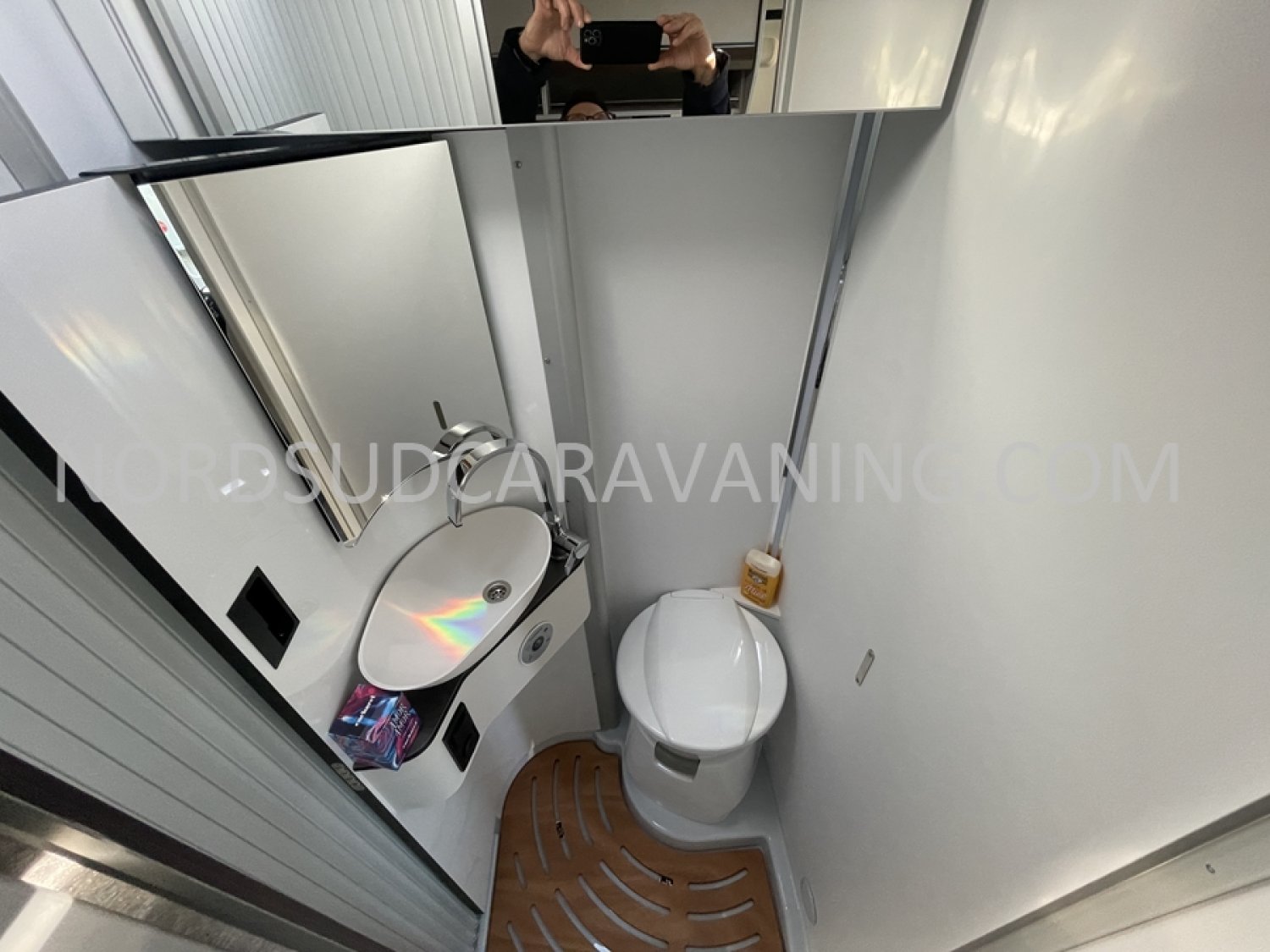 Sa dinette est agréable et lumineuse pour une ambiance conviviale. Sa cuisine latérale, pratique et fonctionnelle est équipée d’un réchaud 2 feux, évier et plan de travail rabattable. En face, une jolie salle de bain avec WC, lavabo et une douche vario spacieuse. Sans oublier ses nombreux rangements astucieux !