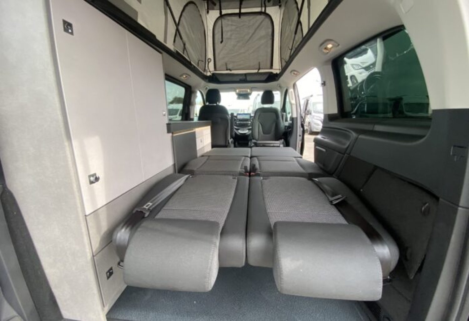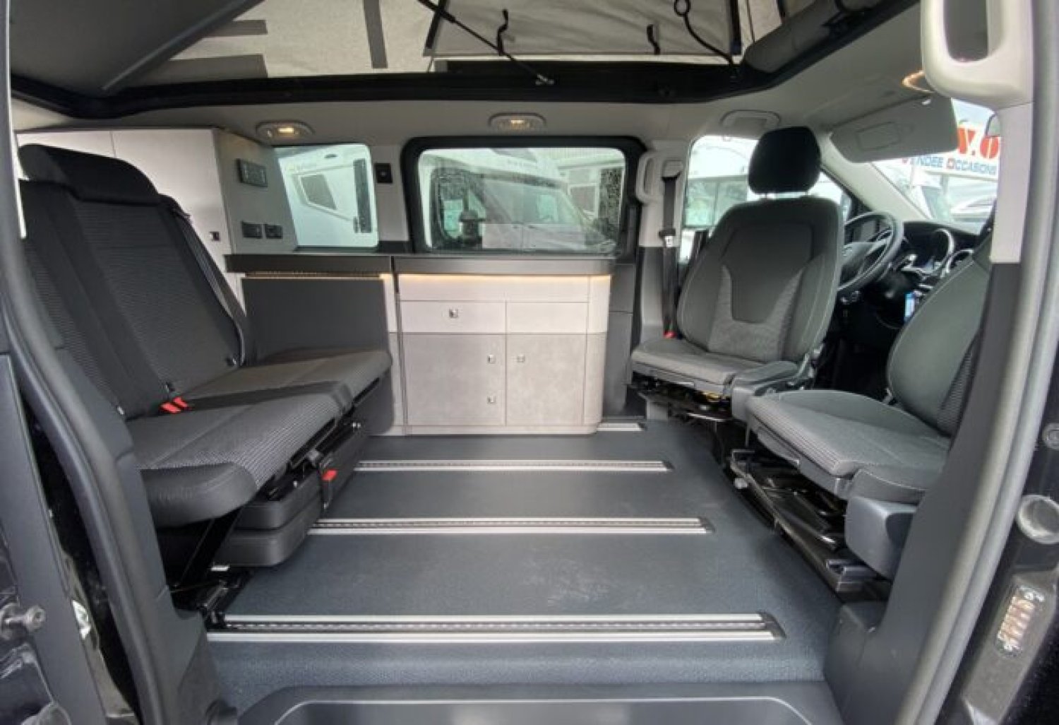 Start and Stop, allumage automatique des feux et essuie vitre avant, climatisation cabine automatique, double airbag, régulateur de vitesse, rétroviseurs rabattables électriques, deux portes latérales, sièges cabine rotatifs, BLOC CUISINE réchaud 2 feux gaz, évier avec réserve d’eau propre 10 l et eau usée 10 l et une prise externe de 230 V CEE. TOIT RELEVABLE comprenant un matelas tout confort.