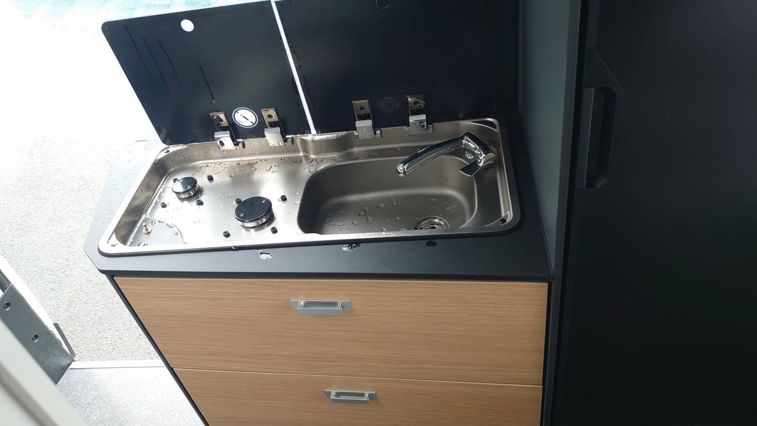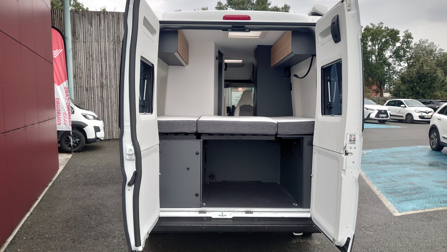 Son agencement intègre un lit transversal à l’arrière, un coin salon convertible, une cuisine fonctionnelle et une salle d’eau. Conçu pour 2 à 3 personnes, il se distingue par sa modularité, ses finitions modernes et un vrai compromis entre maniabilité et confort de vie à bord.