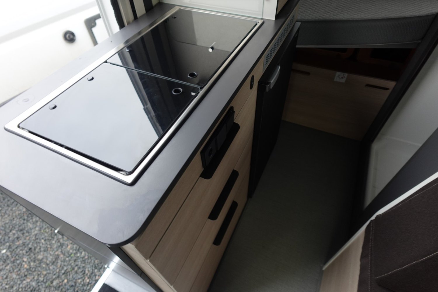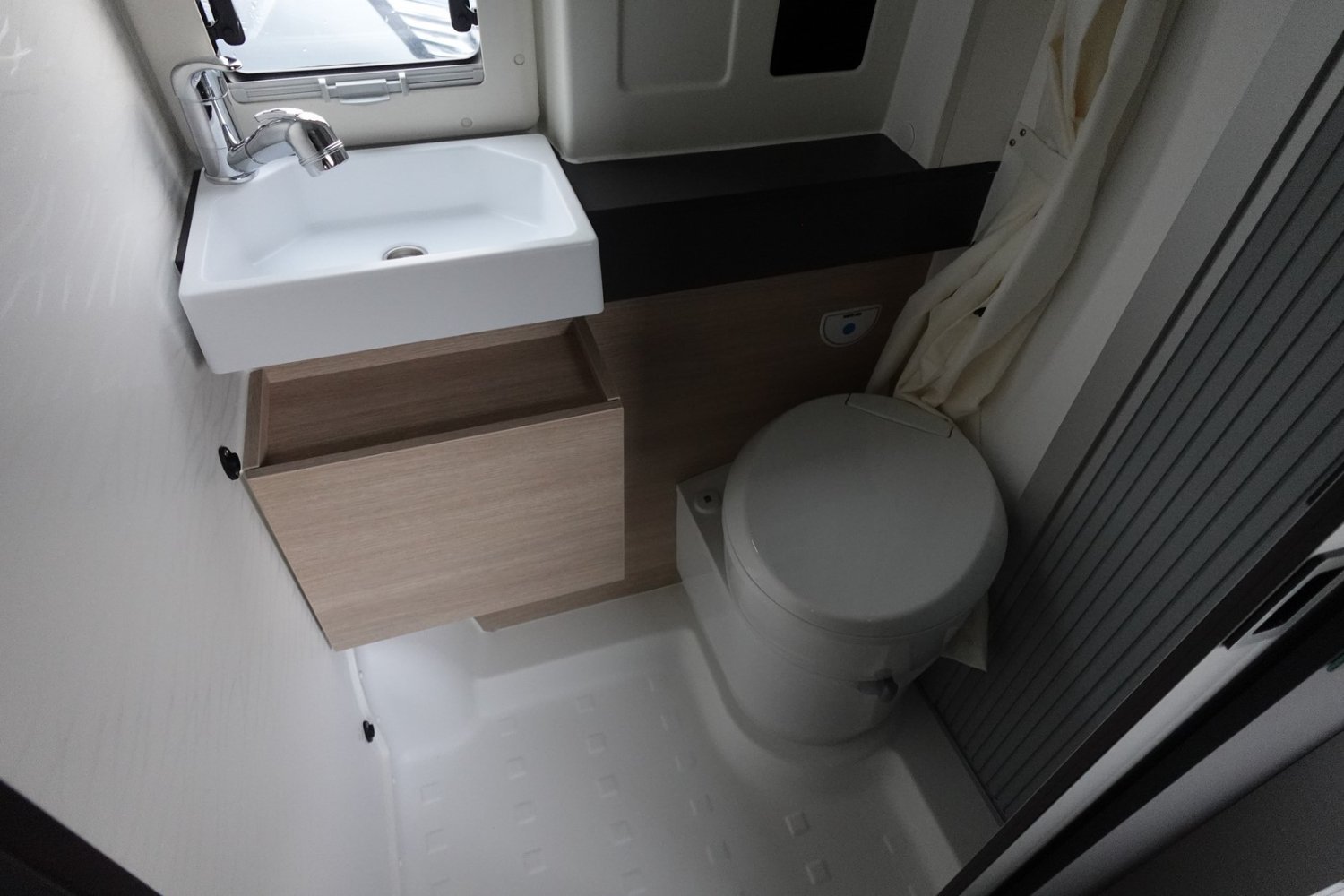 Fourgon aménagé comprenant un salon avant panoramique, une salle d’eau avec douche et WC, un lit arrière transversal, un lit 2 places dans toit relevable et une cuisine avec de nombreux rangements. Le tout en 5.41 m de long.