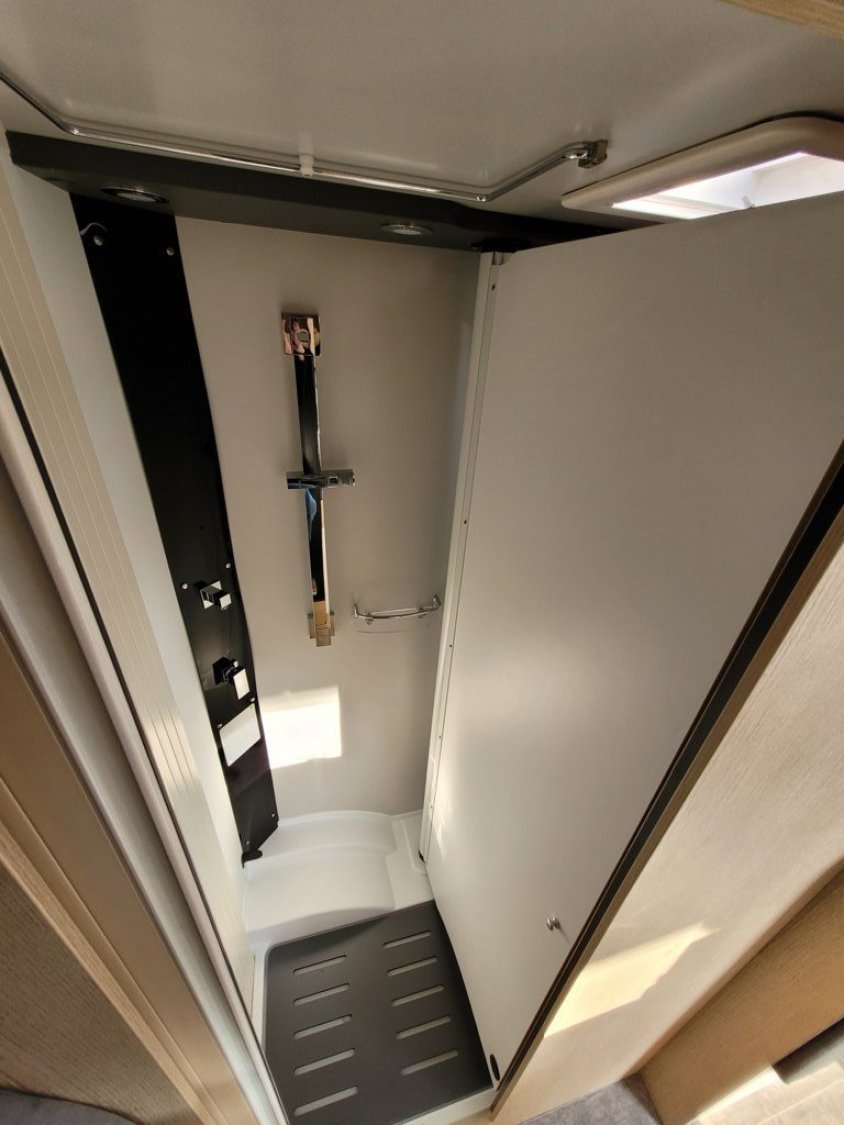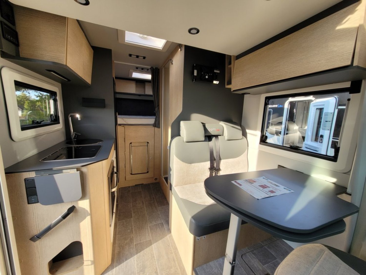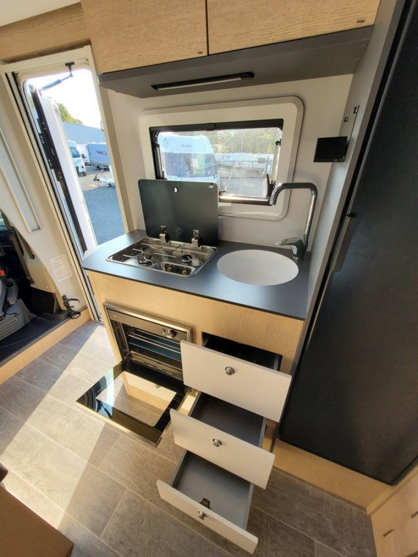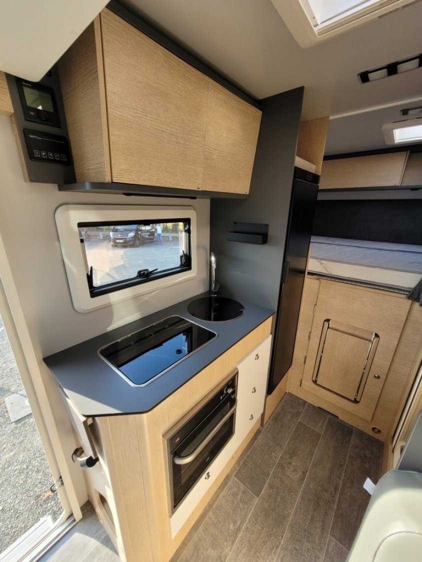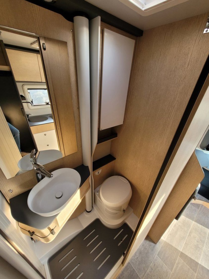 Cuisine en long, Douche à vario, Grande soute, Lit arrière transversal, Lit dînette avant, Maxi salon, Salon avant sièges pivotants, WC Cassette.