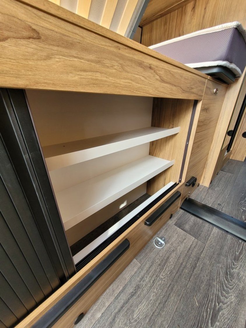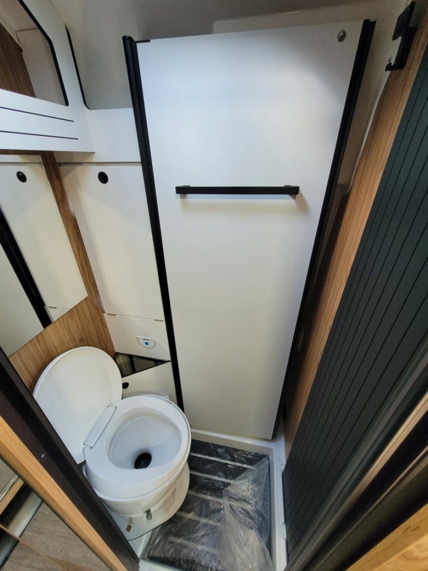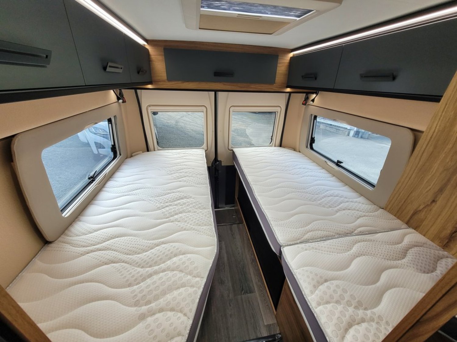 Cuisine en long, Douche modulable, Lit dînette avant, lit jumeaux, Salon avant sièges pivotants, WC Cassette.