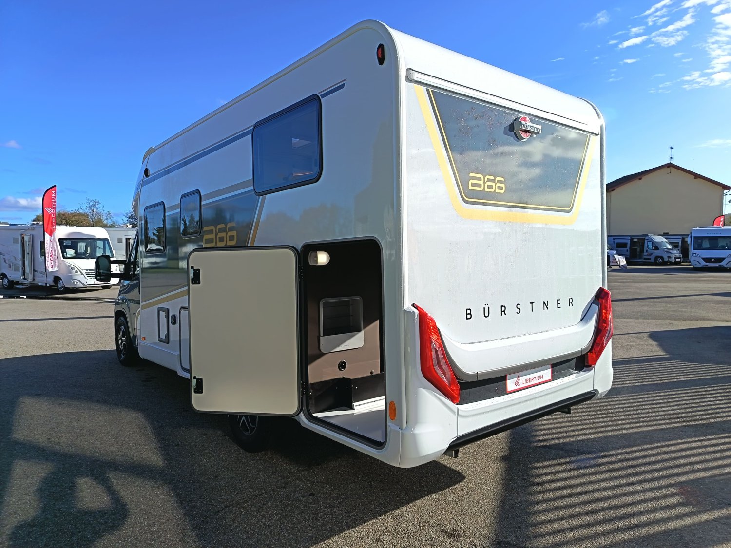 Série limitée BURSTNER avec lits jumeaux sur soute, lit de pavillon électrique 2 places, salle de bain vario et grande soute garage. Ce profilé haut de gamme possède un double plancher et niveau d'équipement de série très riche.