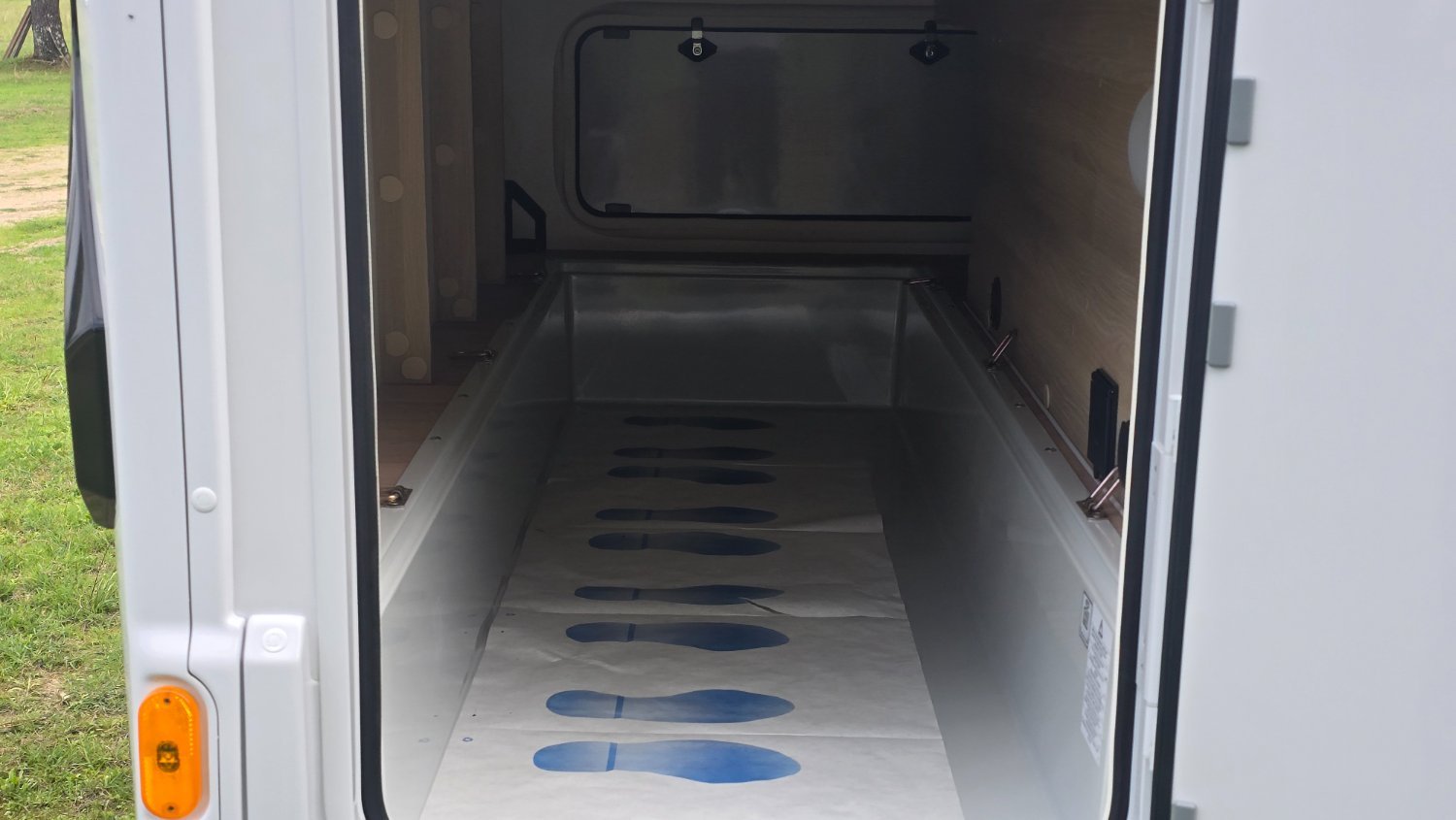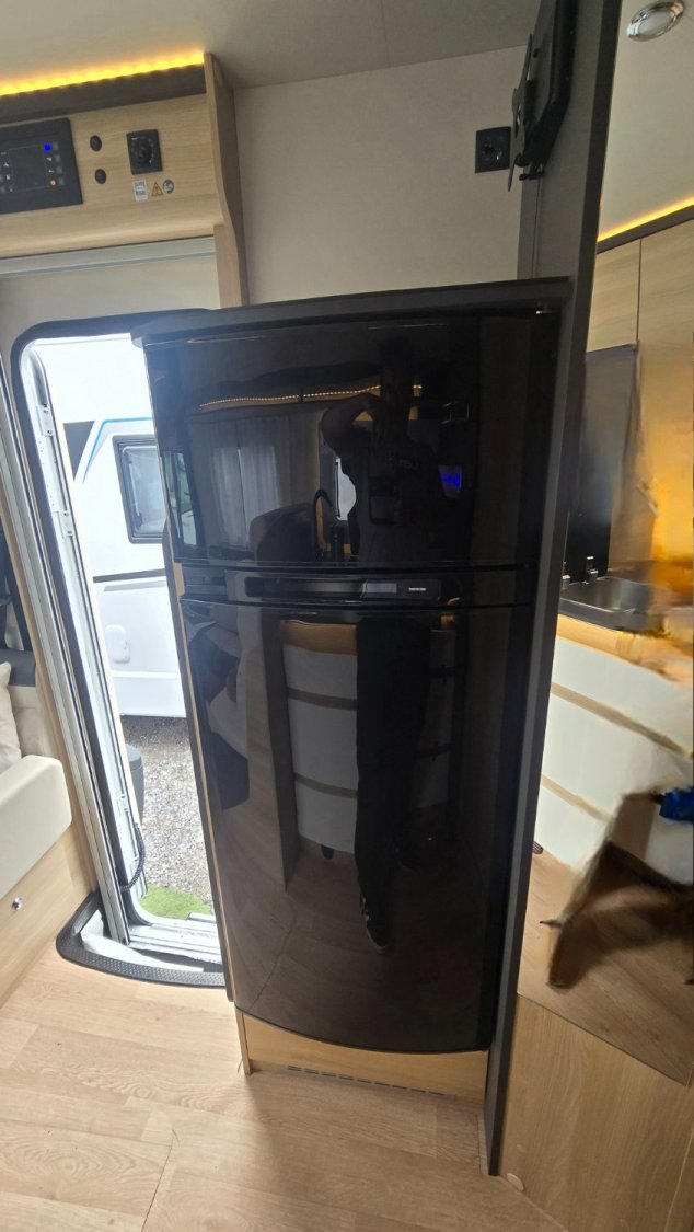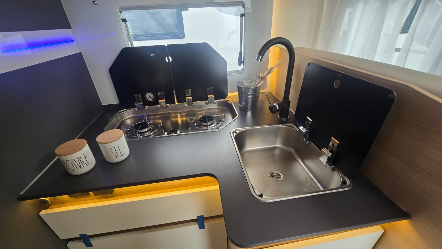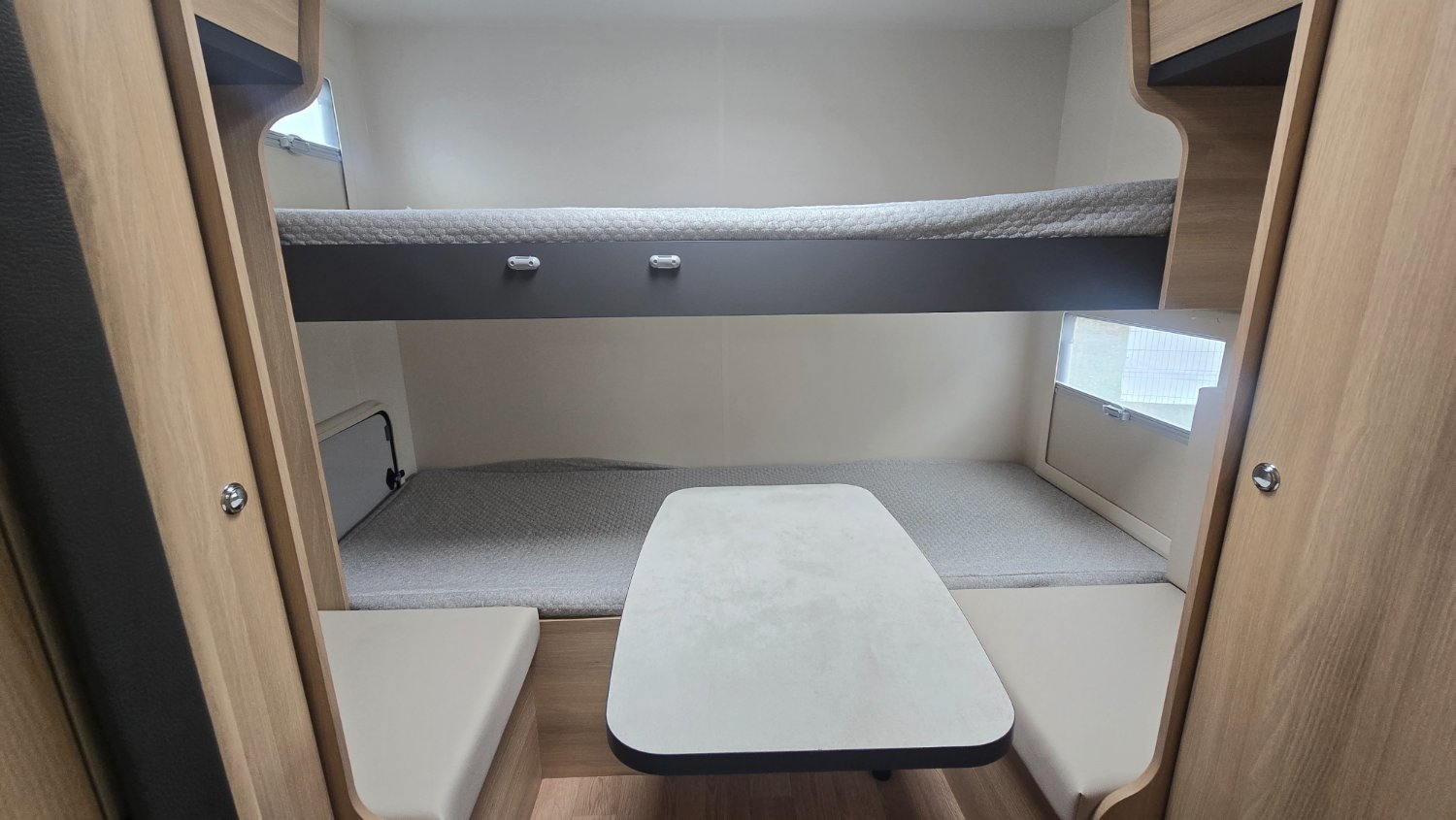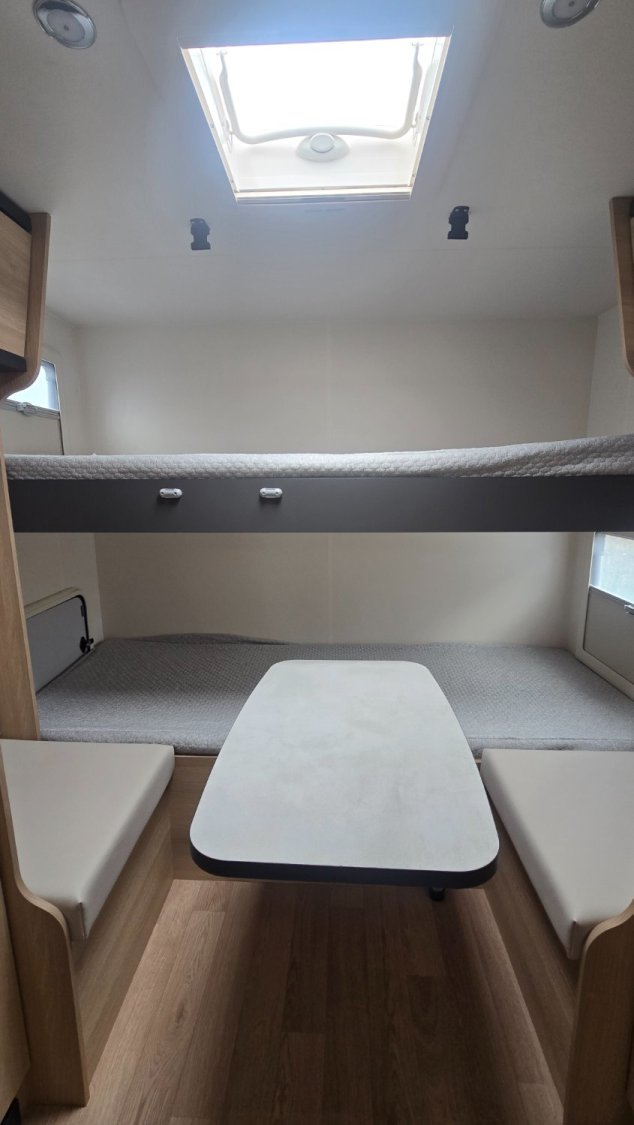 Chambre enfants avec 3 couchages, double penderie, douche séparée, évier inox avec grand plan de travail et réfrigérateur 145L et un grand salon.