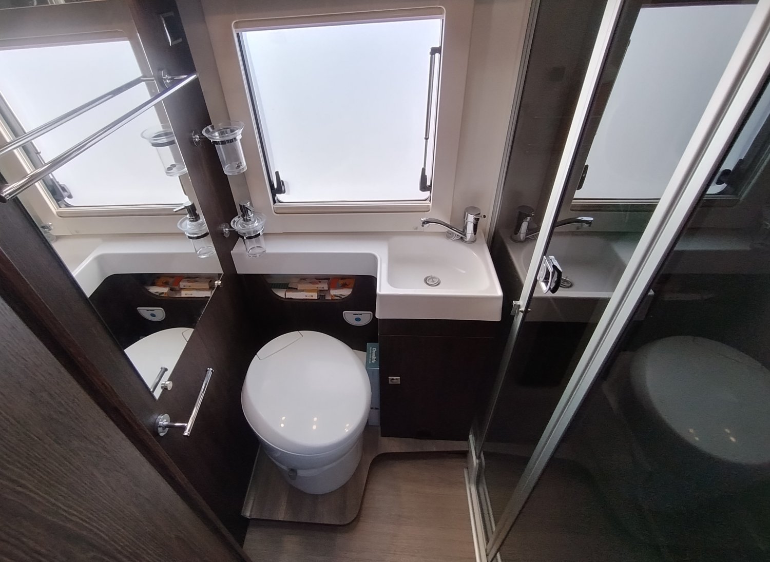 Une implantation idéale pour un couple et même une famille grâce à son lit transversale réglable en hauteur pour optimiser votre chargement en soute au besoin. A l’avant un lit pavillon électrique 1 personne et un lit en dinette complètent les couchages. Ce modèle dispose d’une douche séparée de l’espace toilettes.