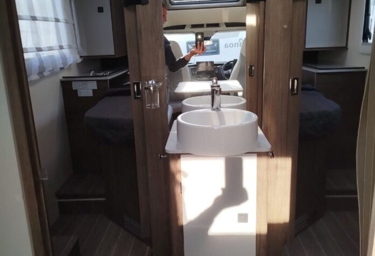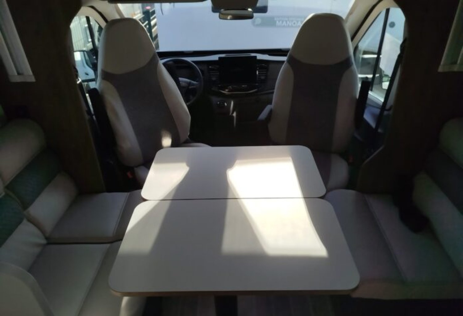 Pack ford : motorisation 165 CV, Store extérieur 4,5 mètres, feux diurnes, boites à gants avec serrure, habillage intérieur et tableau de bord finition « tren », pare chocs et bas de caisses latérales peints couleur carrosserie, porte Xl avec 2 points fermeture, fenêtre et fermeture centralisée, panneau solaire 200W avec régulateur MPPT, panneau de commande CP plus, skyroof, couvercle évier, housses de sièges cabine, store occultants plissées cabine prise gaz externe + douchette extérieure
