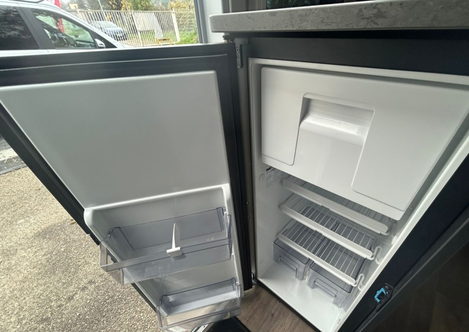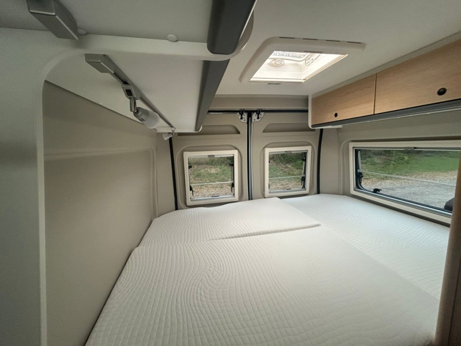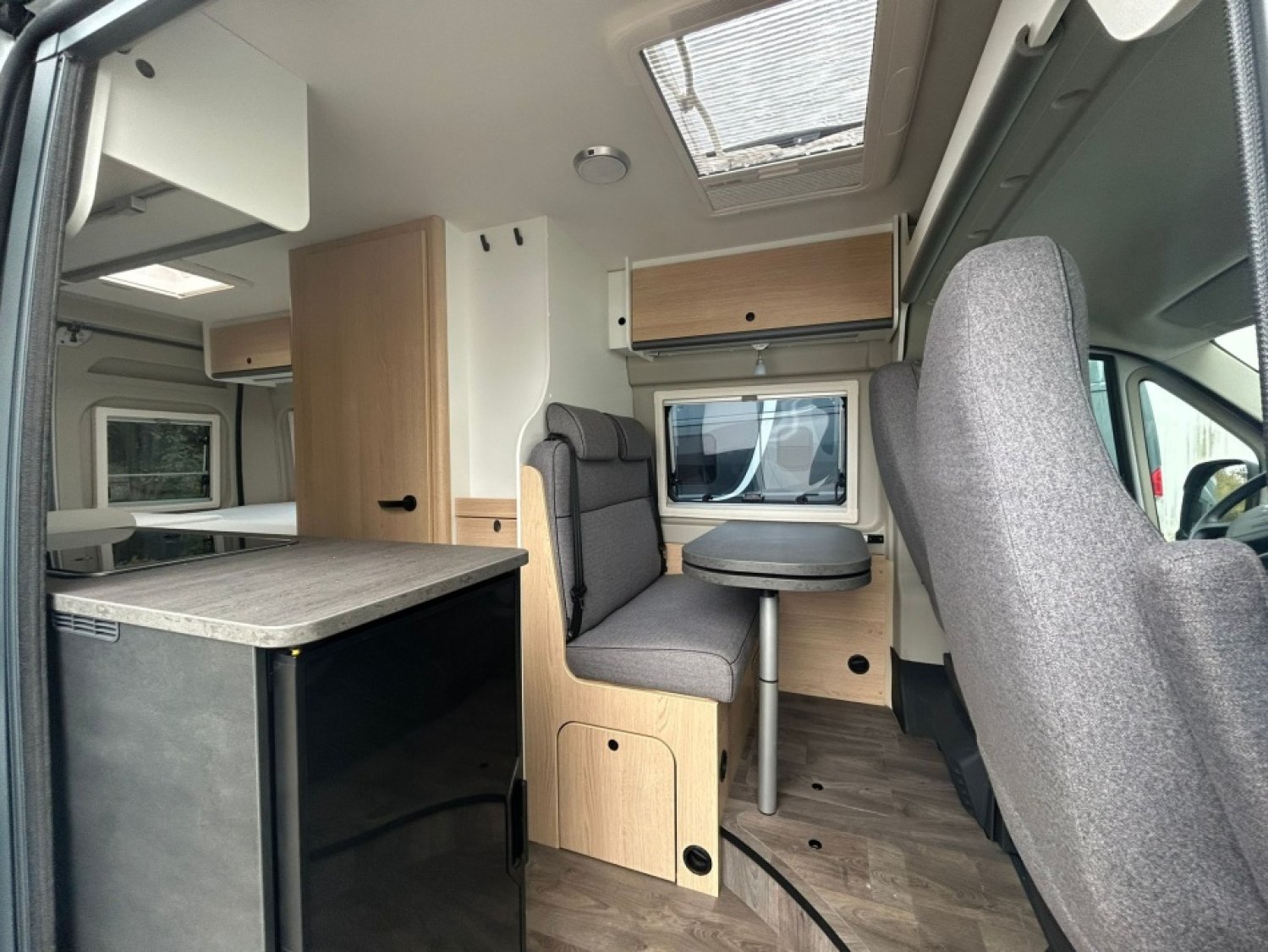 Voyagez confortablement dans ce petit fourgon au design élégant avec lit transversal arrière, cuisine et salle de bain modernes, salon spacieux, rangements modulables et réfrigérateur accessible de l’extérieur