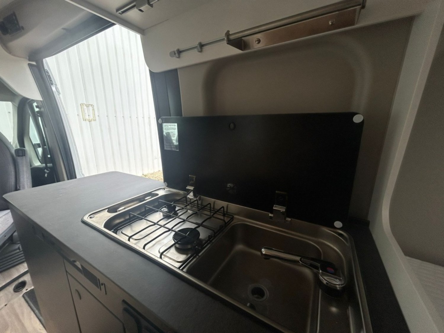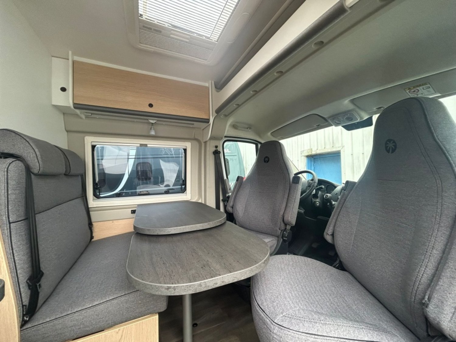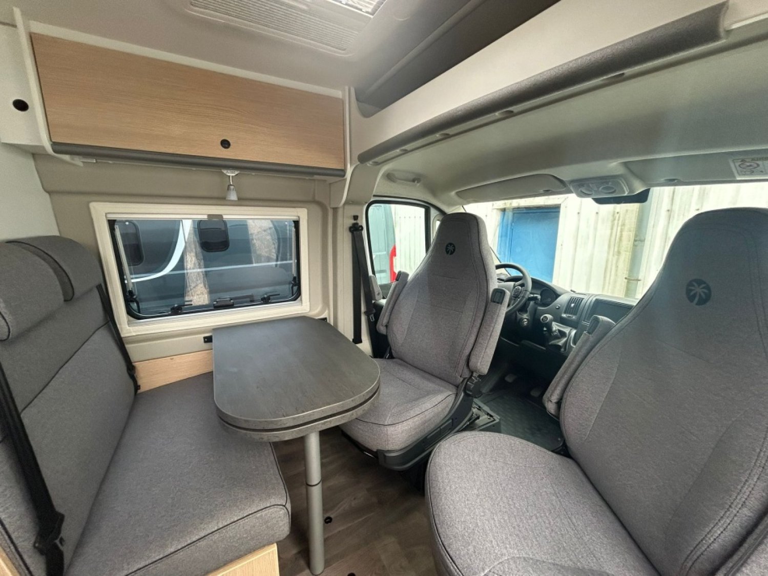 Voyagez confortablement dans ce petit fourgon au design élégant avec lit transversal arrière, cuisine et salle de bain modernes, salon spacieux, rangements modulables et réfrigérateur accessible de l’extérieur