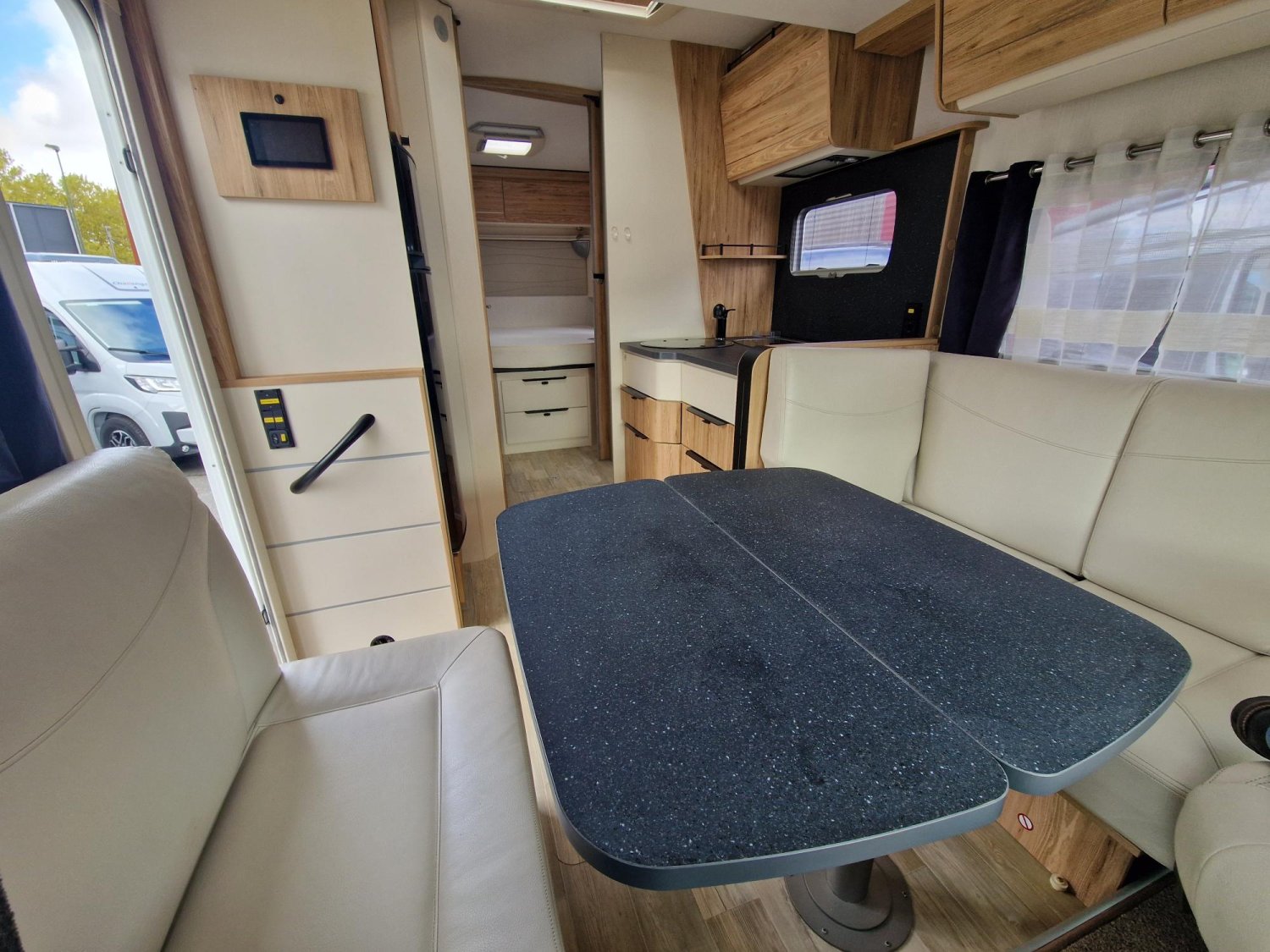 Profilé haut de gamme en lit central et lit de pavillon électrique 2 places, cuisine en "L" équipée d'un grand frigo, état proche du neuf, petit kilométrage, entretiens à jour, bien équipé sur une base Fiat 2.2 l / 140 CV en BVA.