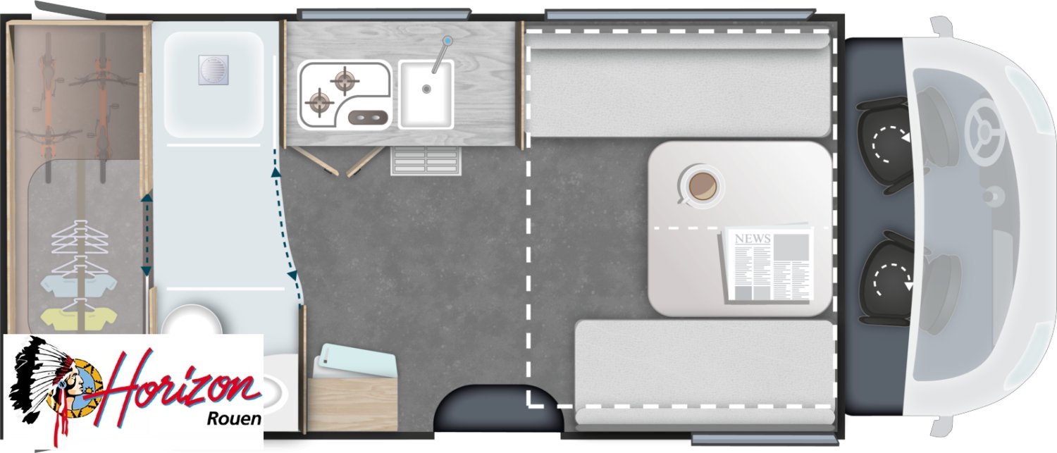 Pour ceux qui veulent de l’espace, beaucoup d’espace : Le 640 est incroyable. Seulement 6,99m : Maxi salon, maxi cuisine, maxi salle de bains, Garage à vélos ou scooter, dressing et lit largeur 1,60m, qui dit mieux ?