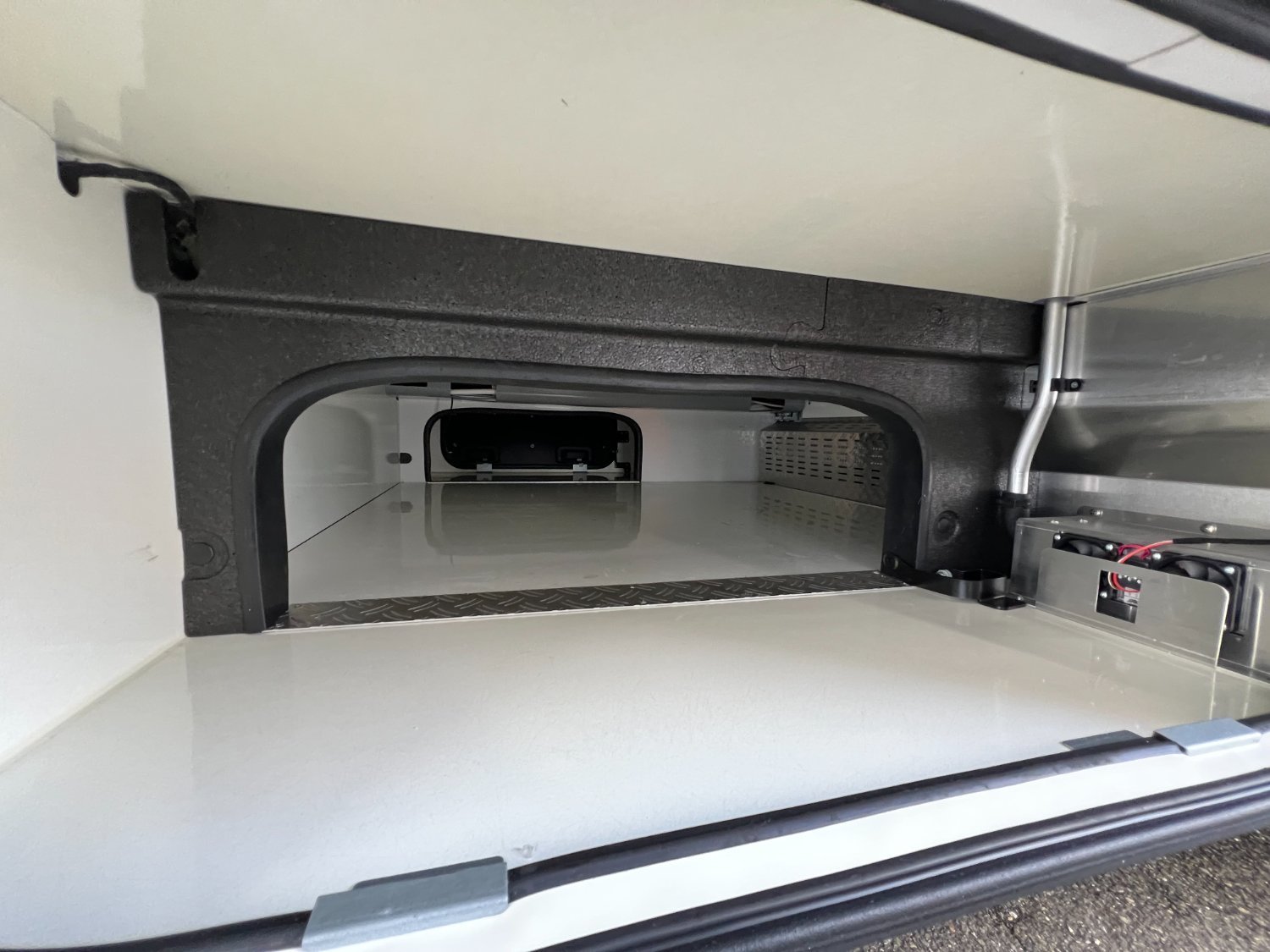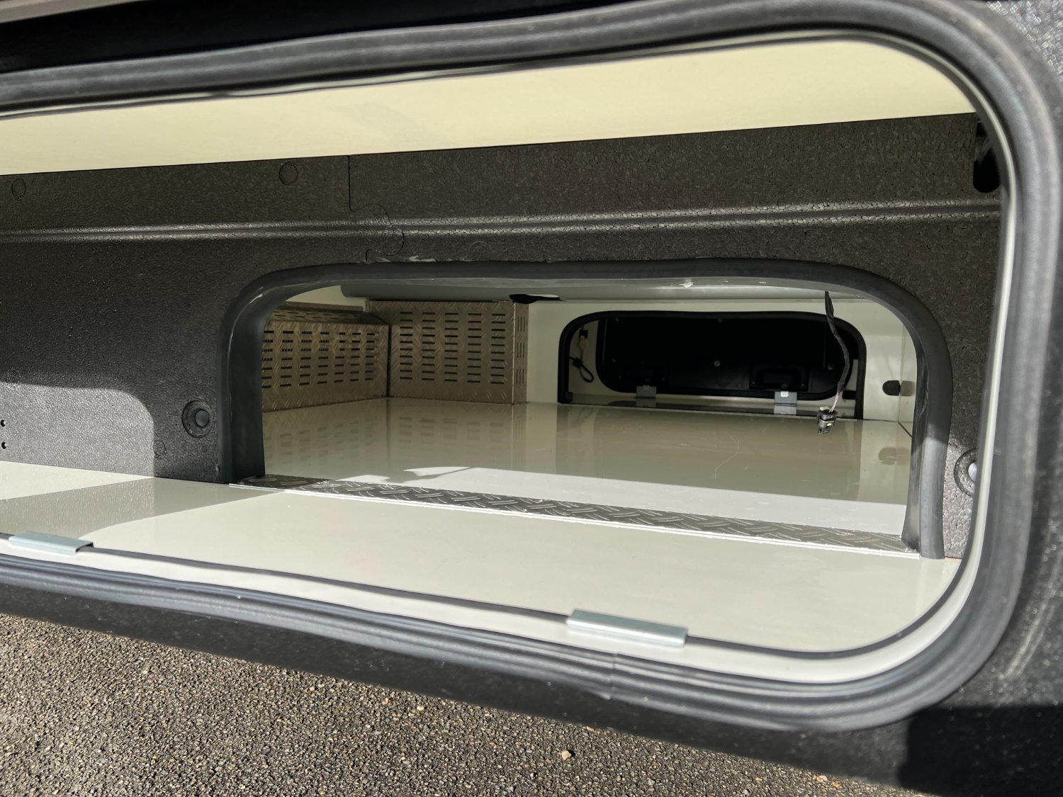 Fond du plancher en tôle, moquette et 2 rails d'arrimage supplémentaires dans le garage arrière