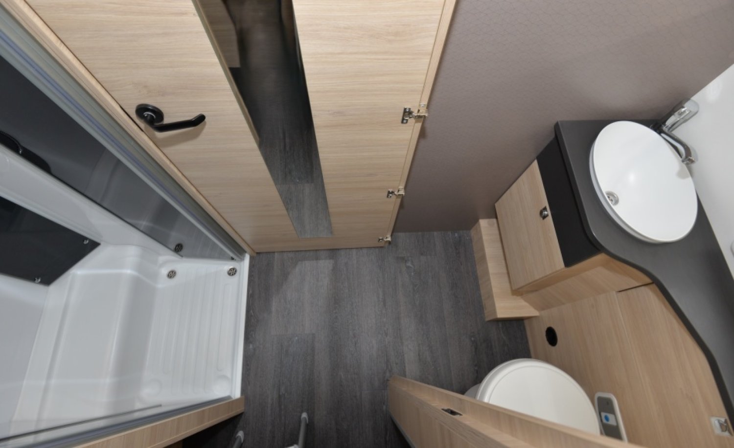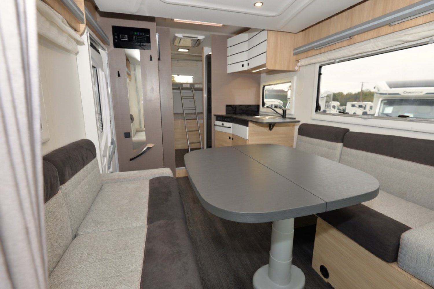 Avec ses dimensions plus qu'acceptables, ce véhicule vous propose un immense salon face-face avec une table modulable électriquement surmonté d'un grand lit pavillon (160 x 200), une belle cuisine fonctionnelle ainsi qu’une salle d'eau avec douche indépendante cloisonnée.