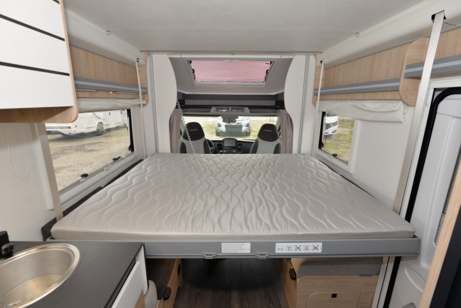 La nouveauté apparaît au niveau du couchage arrière, 2 lits superposés sur soute réglables en hauteur, le lit du dessous est également doté de coffres de rangements, et en variant sa hauteur vous libérerez de l'espace pour votre soute !