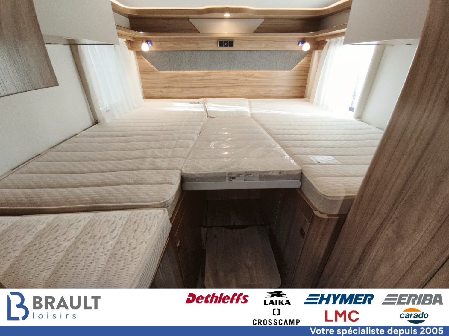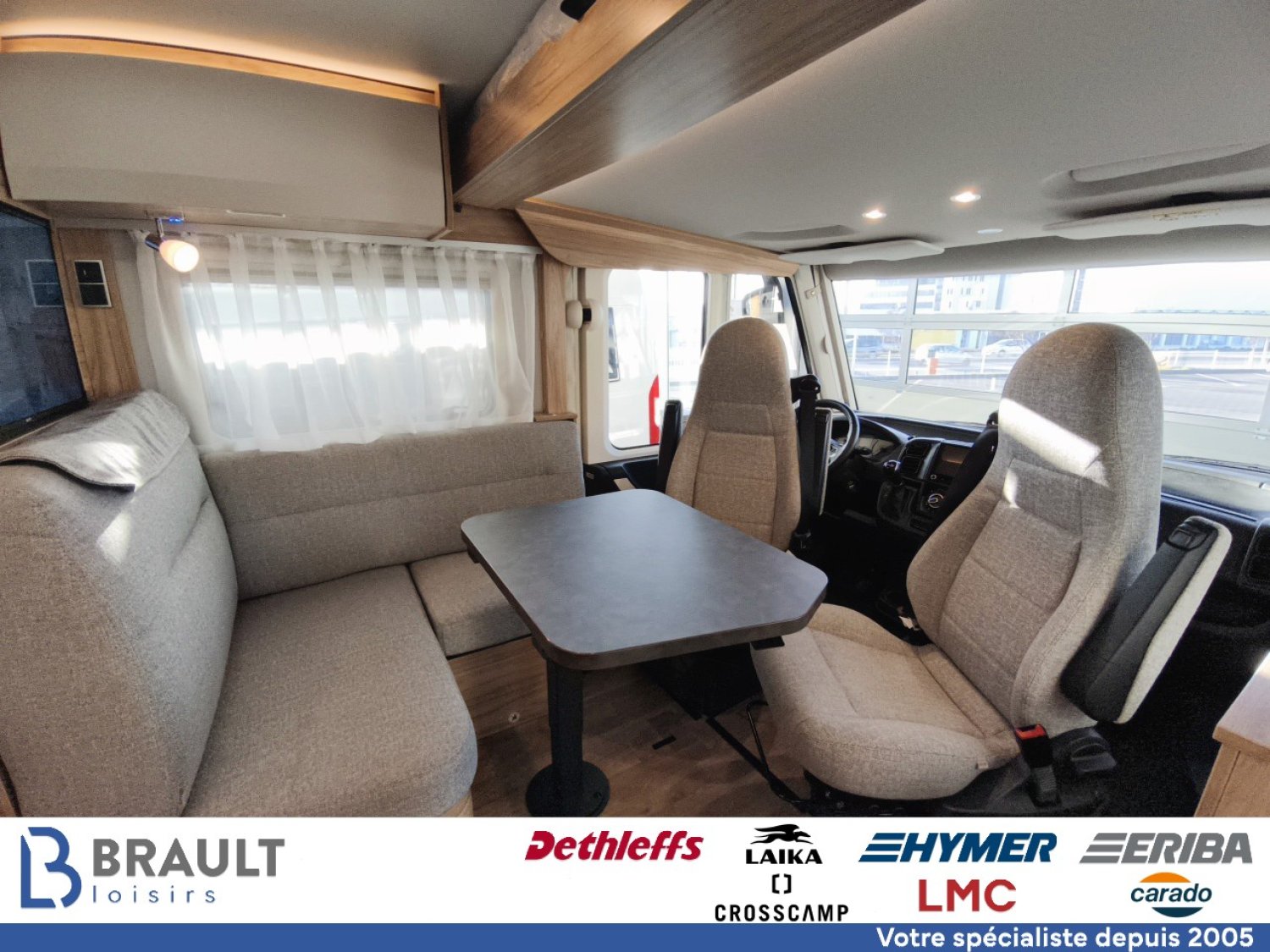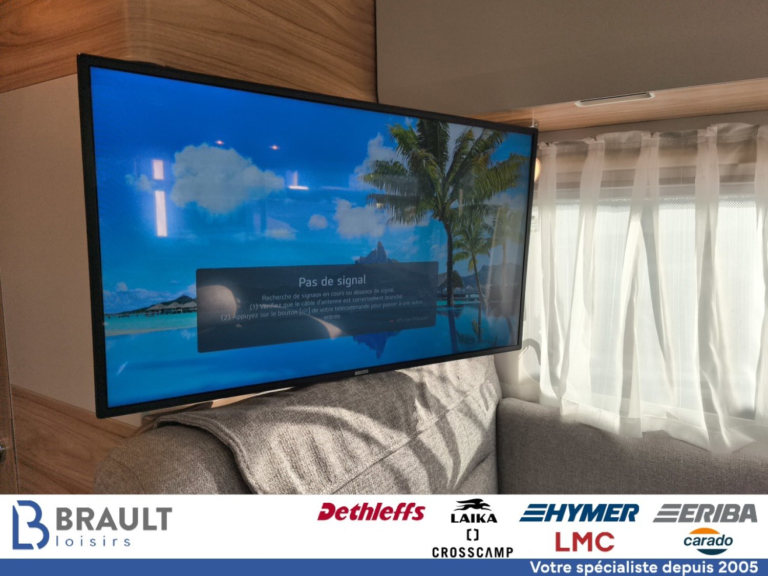 Réservoir carburant 90l, volant et pommeau de levier de vitesse en cuir, jantes alu 16", store extérieur, porte de soute côté conducteur, porte conducteur avec lève-vitre électrique et éclairage d'entrée, porte cellule vitrée avec moustiquaire et poubelle intégrée, transformation de la dinette en couchage, pied de table télescopique, coussin supplémentaire entre lits jumeaux pour maxi couchage, éclairage d'ambiance, inverseur automatique de gaz avec capteur de chocs et résistance anti-givre, filtre à gaz, prises supplémentaires, support TV 32". TV Led 32" avec lecteur DVD, parabole automatique 65cm, caméra de recul)