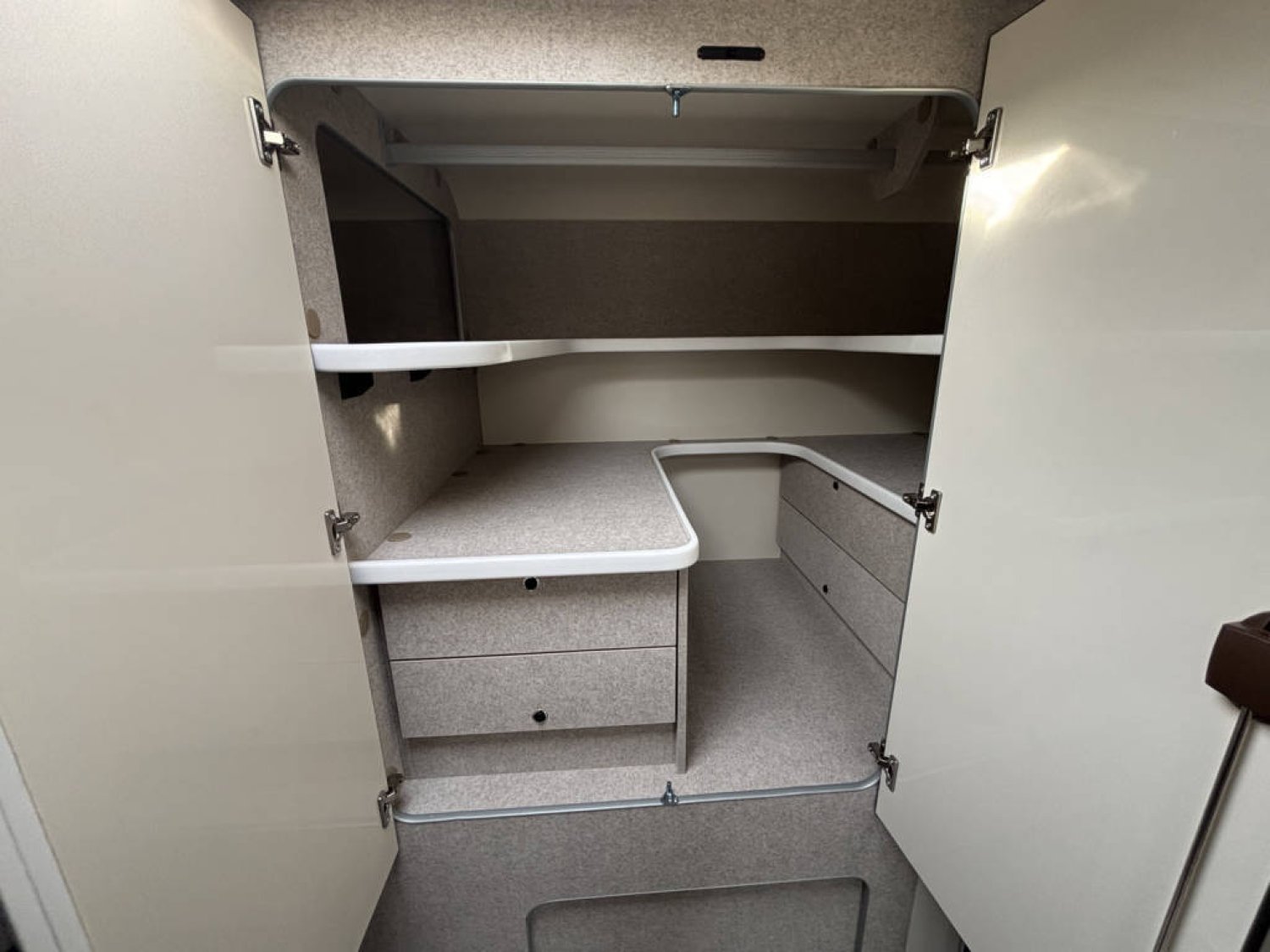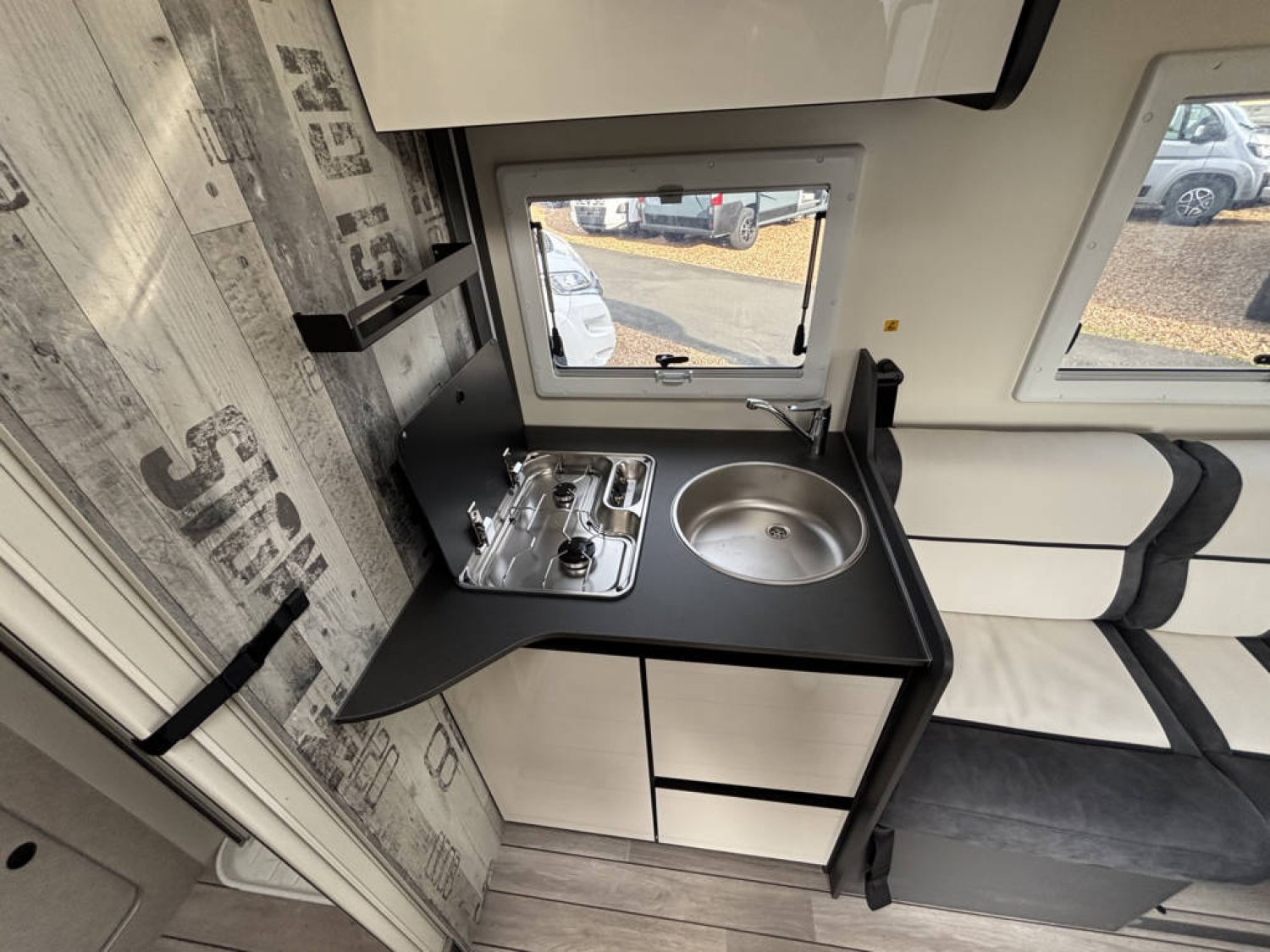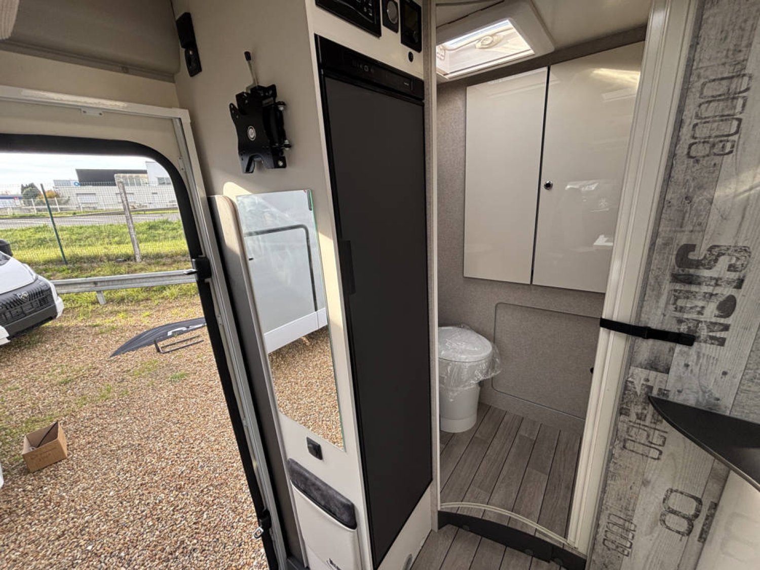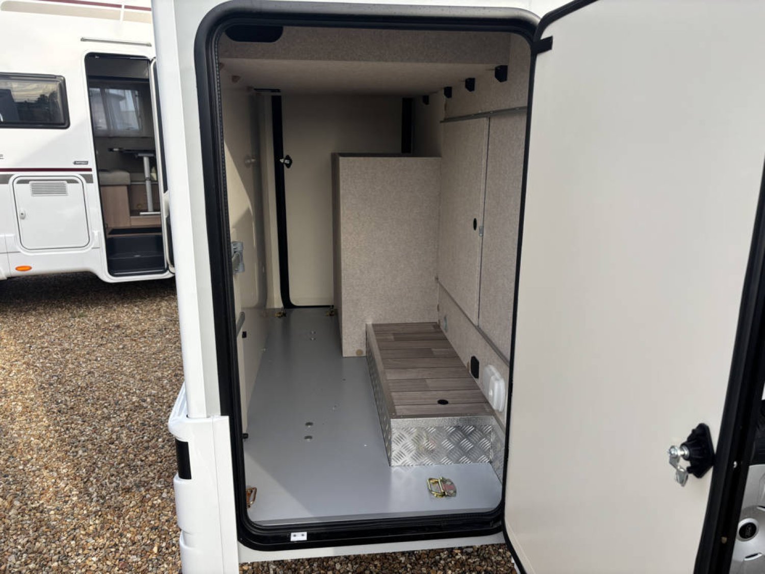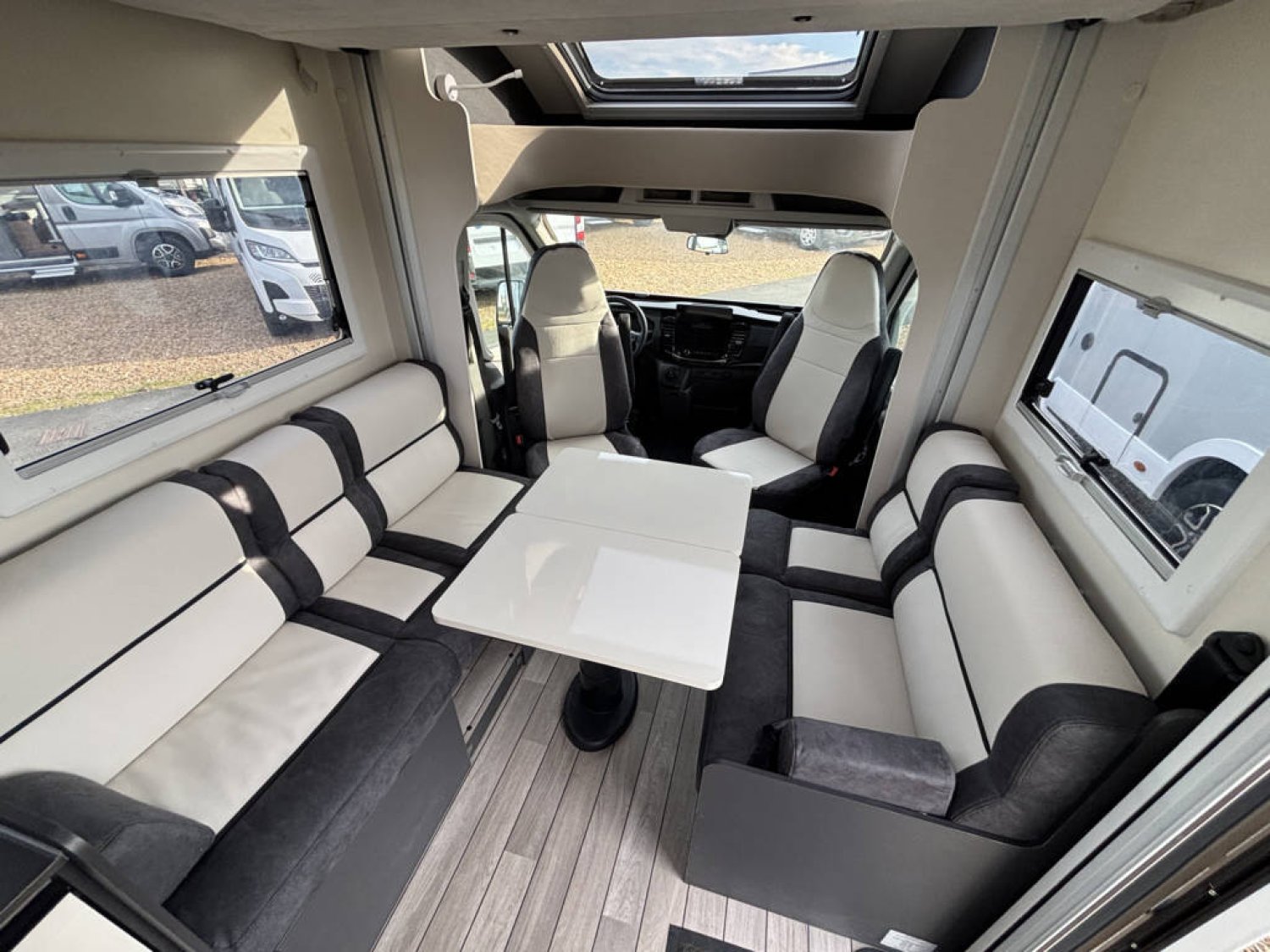 Cuisine en L, Douche indépendante, Lit dînette avant, lit pavillon, Maxi salon, Salon avant banquettes face à face, Salon avant sièges pivotants, Soute, WC Cassette.