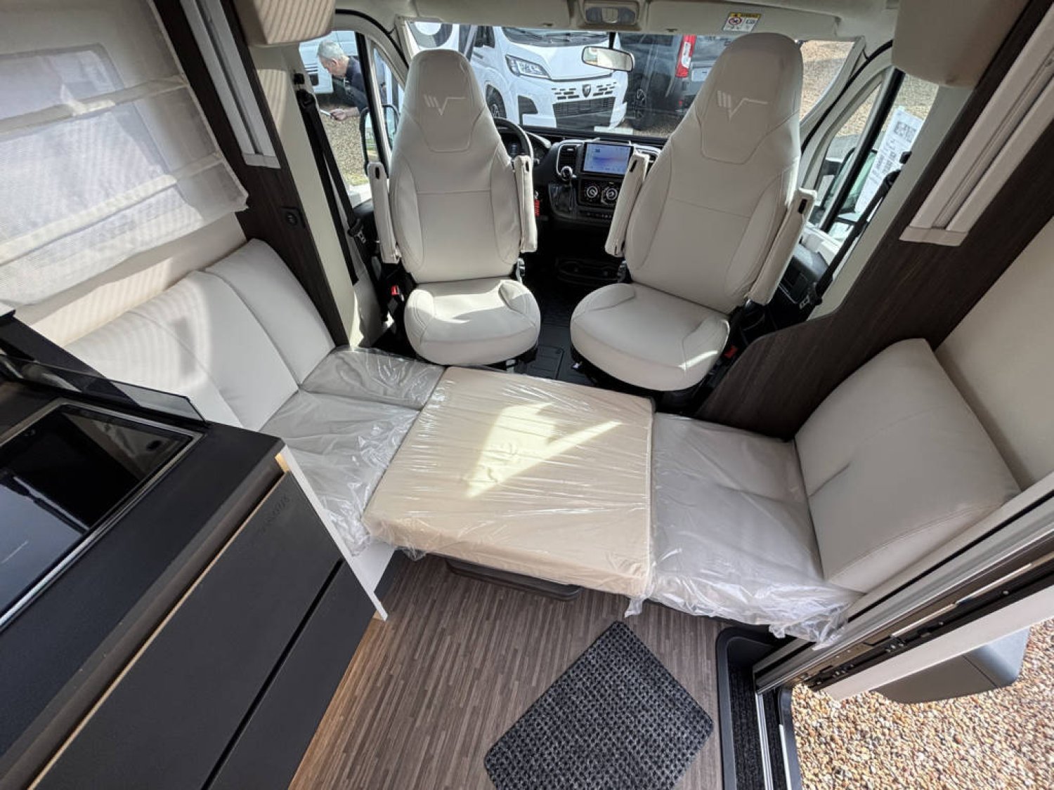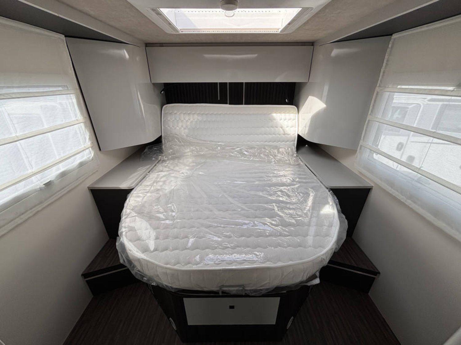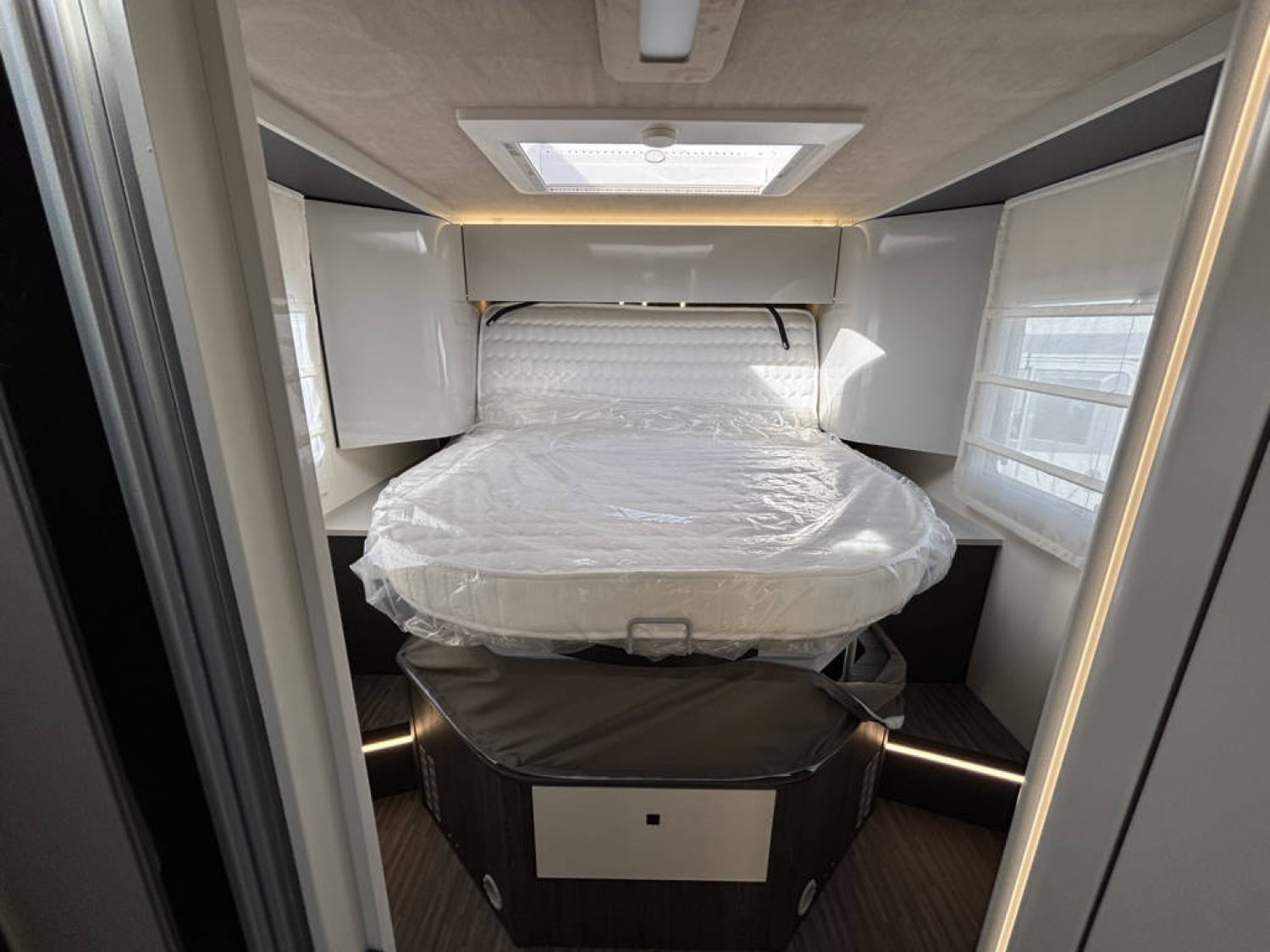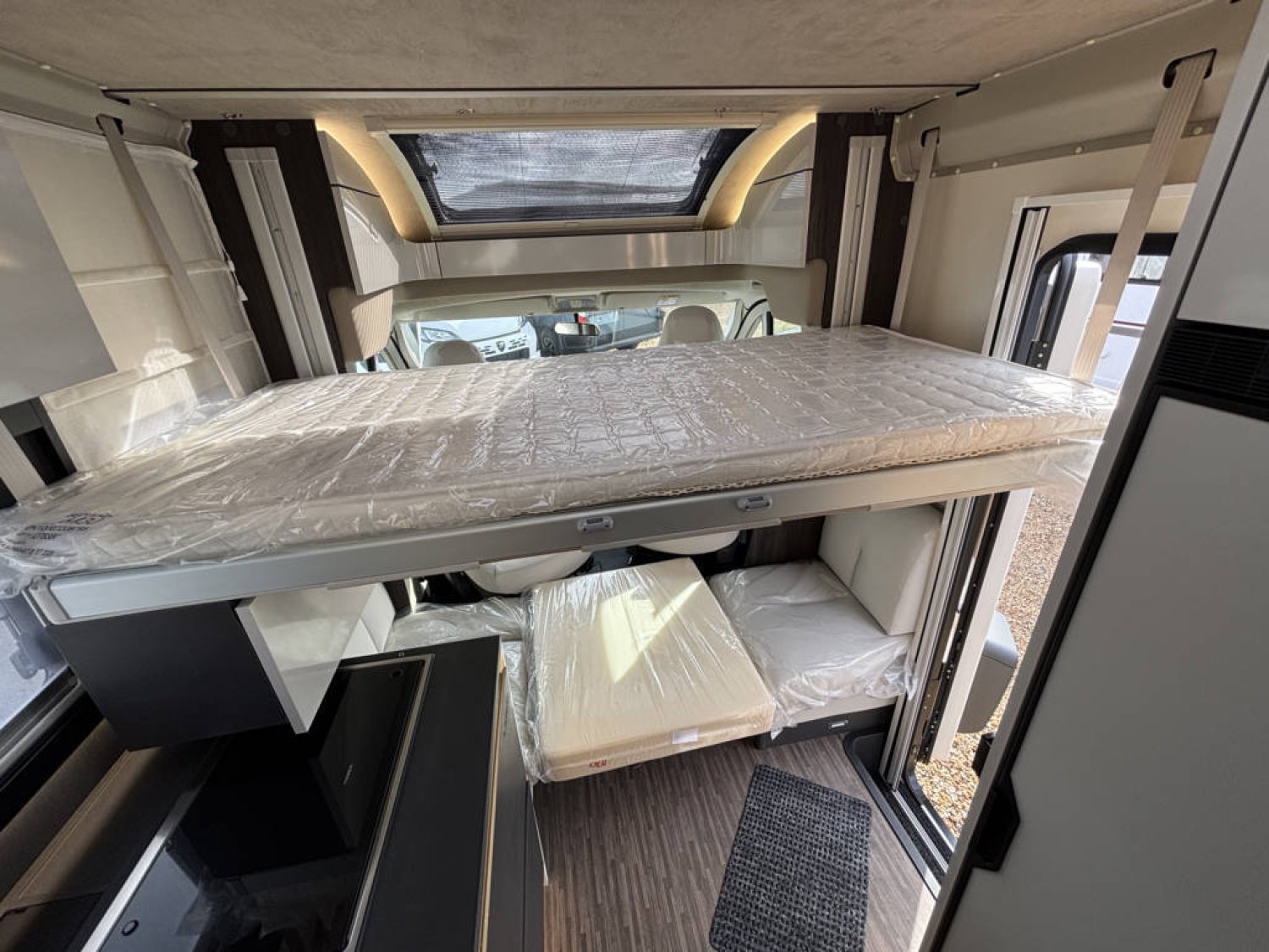 Cuisine en long, Douche indépendante, Lit central, Lit dînette avant, lit pavillon, Salon avant banquettes face à face, Salon avant sièges pivotants, Soute réglable en hauteur, WC Cassette.