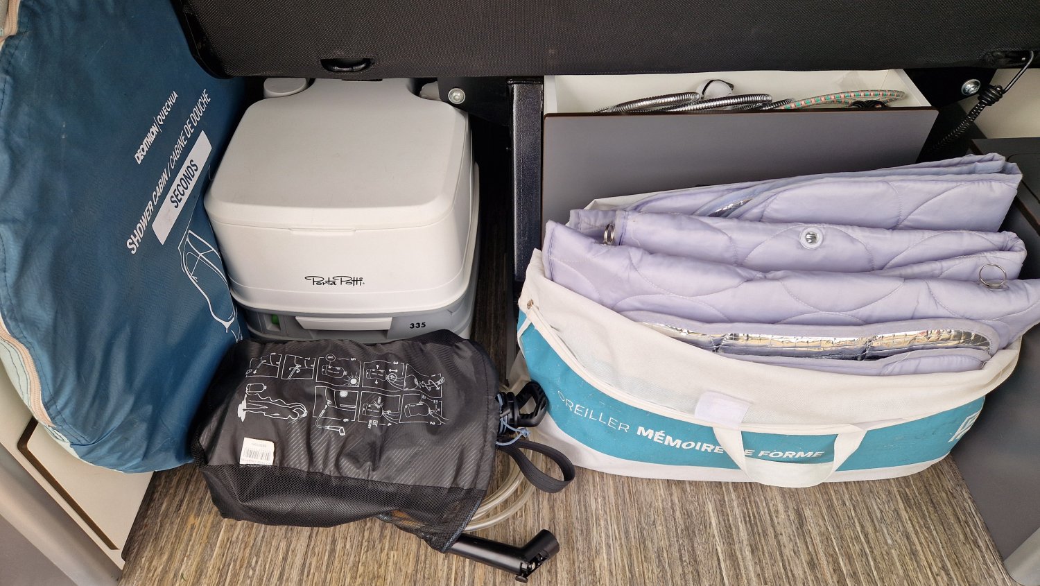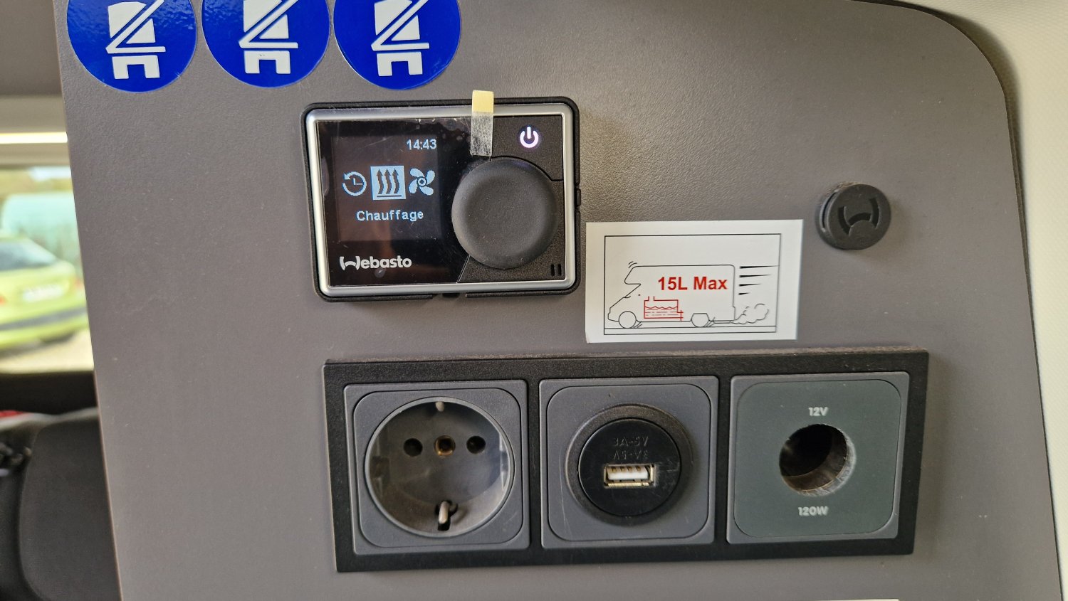 CHAUFFAGE CARBURANT, GAZINIERE 2 FEUX, DOUCHETTE EXTERIEURE, ECLAIRAGE LED, VOLET ISOTHERME INTERIEUR, REFRIGERATEUR 12V A COMPRESSION, STORE EXTERIEUR 2.6m, WC PORTABLE