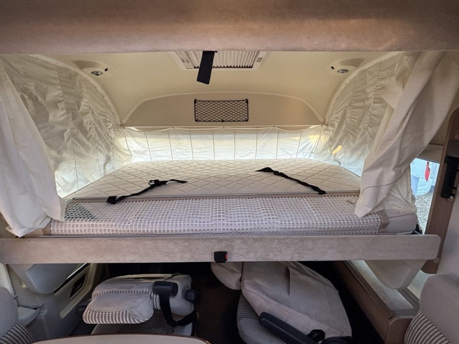 Cuisine en L, Douche indépendante, Lit central, lit pavillon cabine, Salon avant sièges pivotants, Salon en L, WC Cassette.
