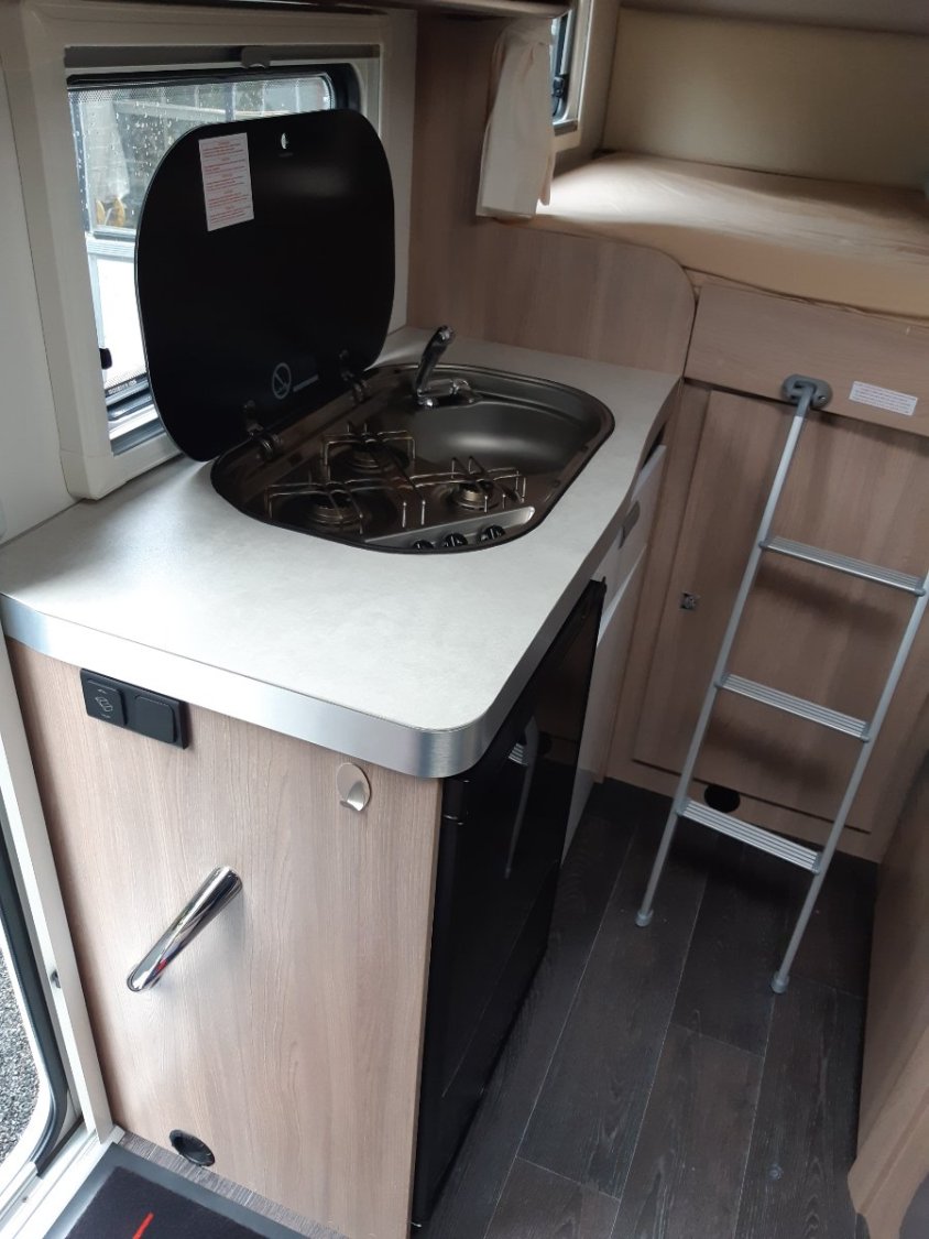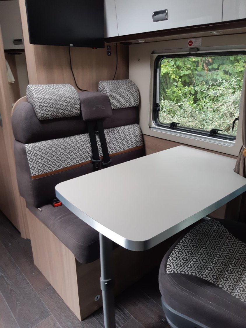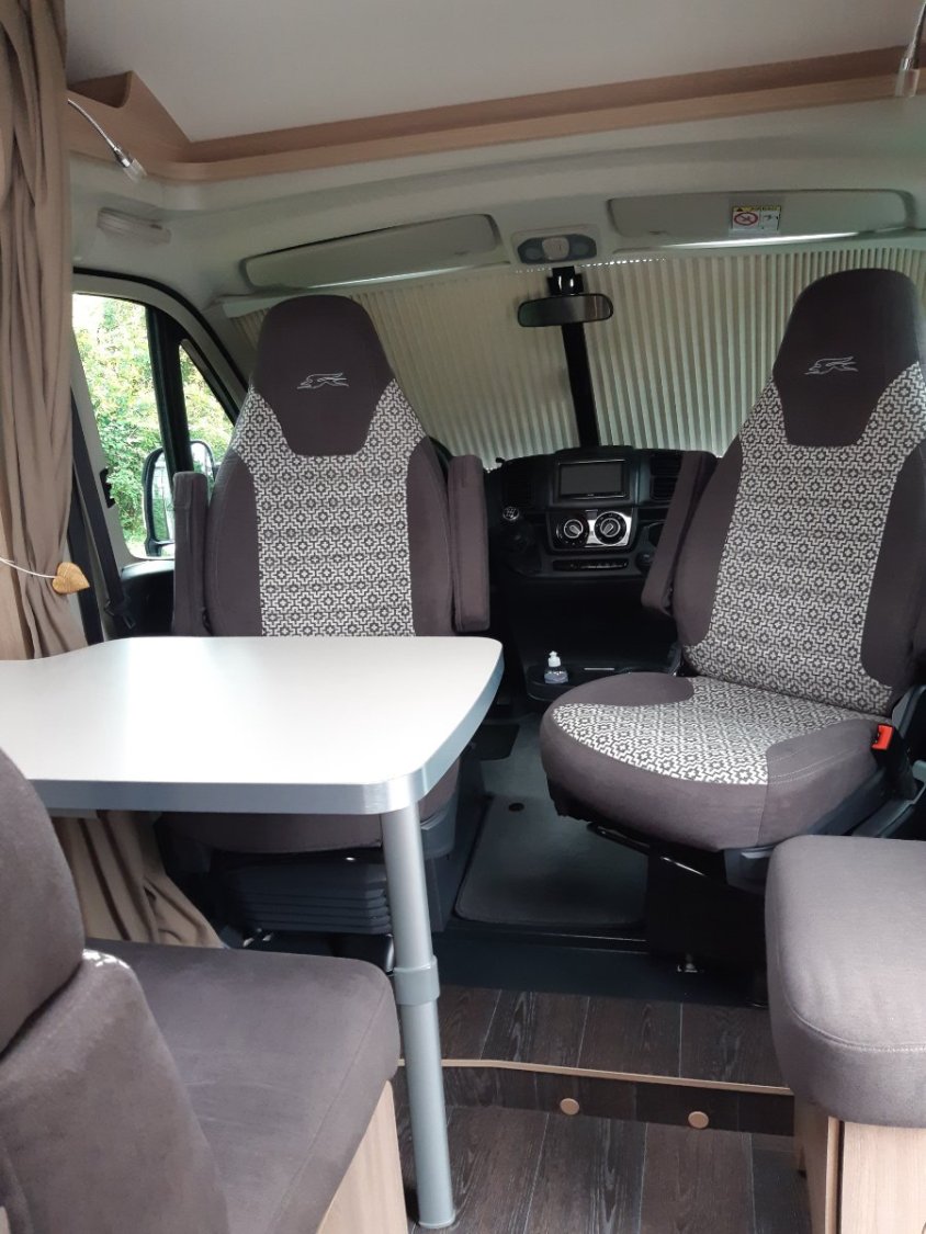 Revêtement des sièges de cabine, Prédisposition pour la camera de recul, Cabine de douche avec rideau, Pieds en bois pour le bac à douche, Tapis de la cabine du conducteur, Moustiquaire, Réservoir d’eaux grises isolé, Lanterneau panoramique 70×50 cm pour le salon