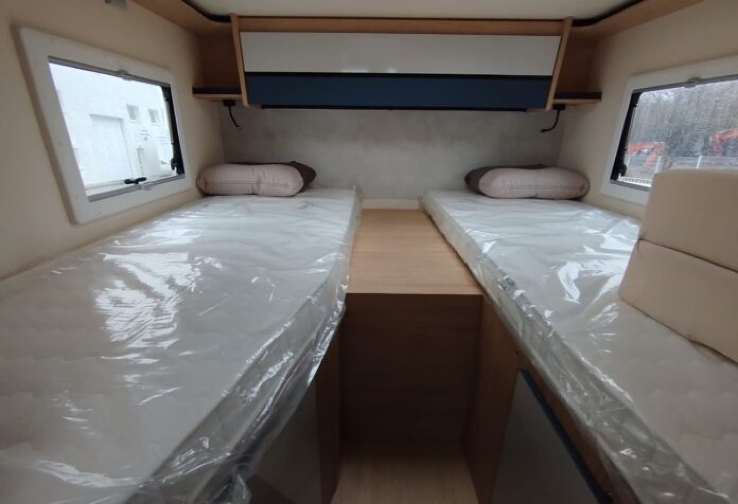 Pack Ford : motorisation 165 CV, feux diurnes, boites à gants avec serrure, habillage intérieur et tableau de bord finition « trend », pare chocs et bas-de-caisse latéraux peints couleur carrosserie, porte xl avec 2 points fermeture, fenêtre et fermeture centralisée, panneau solaire 200W avec régulateur MPPT, panneau de commande CP plus, skyroof, couvercle évier, housses de sièges cabine, store occultants plissées cabine. Lit de pavillon
