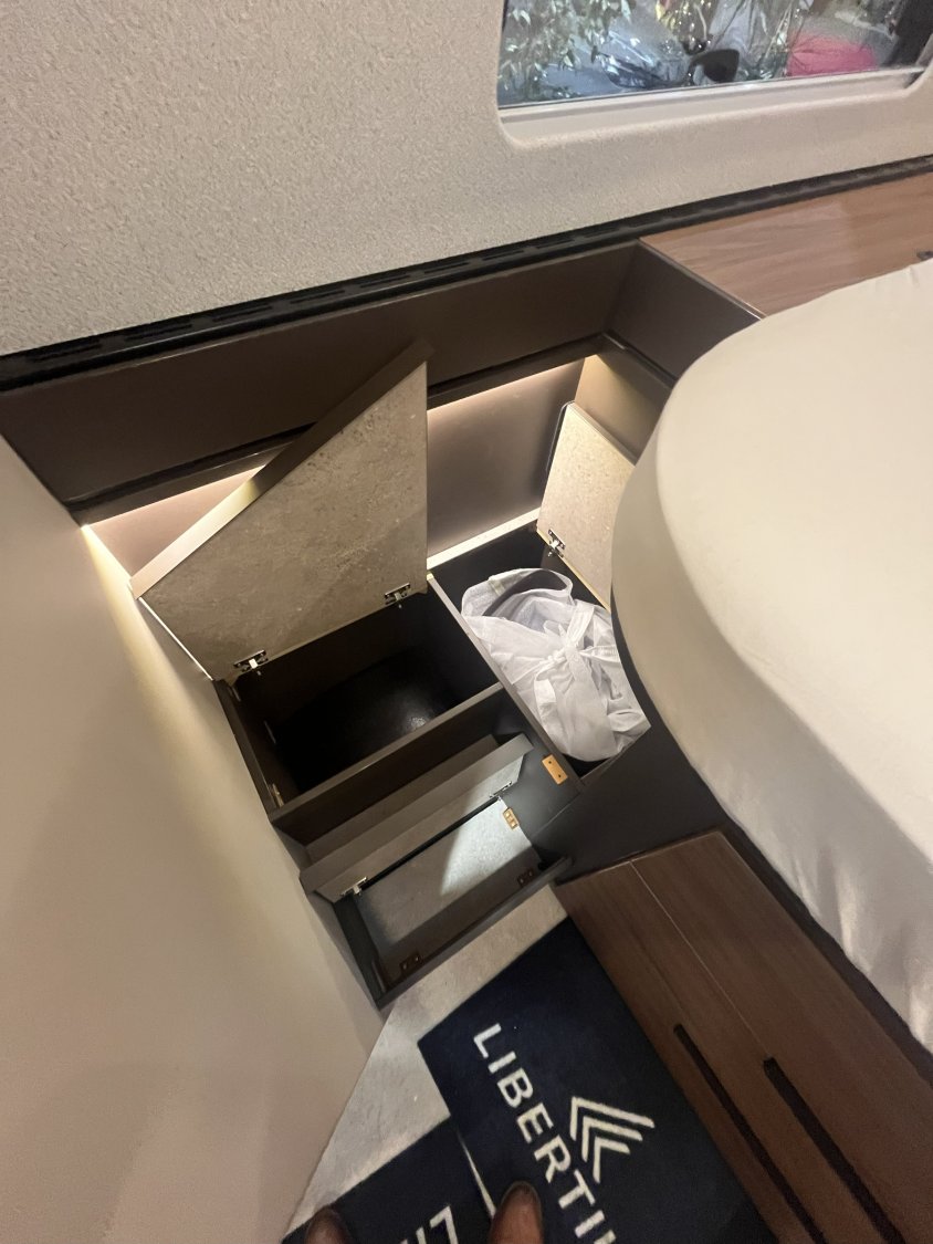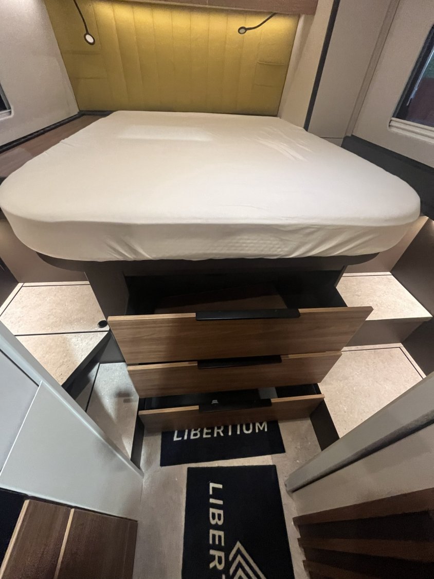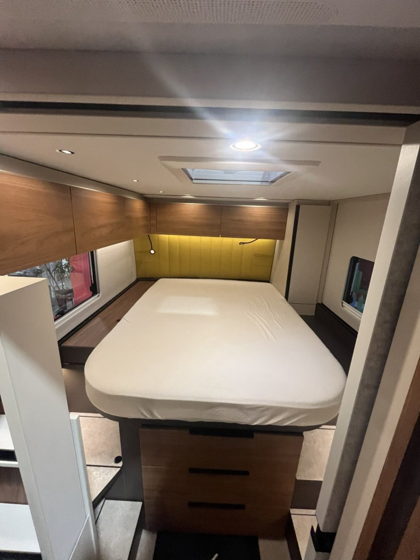 Réservoir diesel 60 L, Rétroviseurs électriques & dégivrants, Rétroviseurs éxtérieurs noir, Sieges cabine pivotants avec rangements sous les sièges, Start & stop, Traction + avec fonction hill descent control, Tête de lit revêtu en tissu, Volant réglable en inclinaison et en hauteur, WC a cassette, Fix & go kit, Habilage des sièges cabine assorti à la cellule, Lit de pavillon électrique, Peinture ext; cabine & cellule SIGNATURE WHITE, Porte gobelets, Portes de placard PINE, Régulateur de vitesse avec limiteur de vitesse, Climatisation manuelle en cabine, Corps de meuble JURA, Douche spacieuse avec étagères rétroéclairées