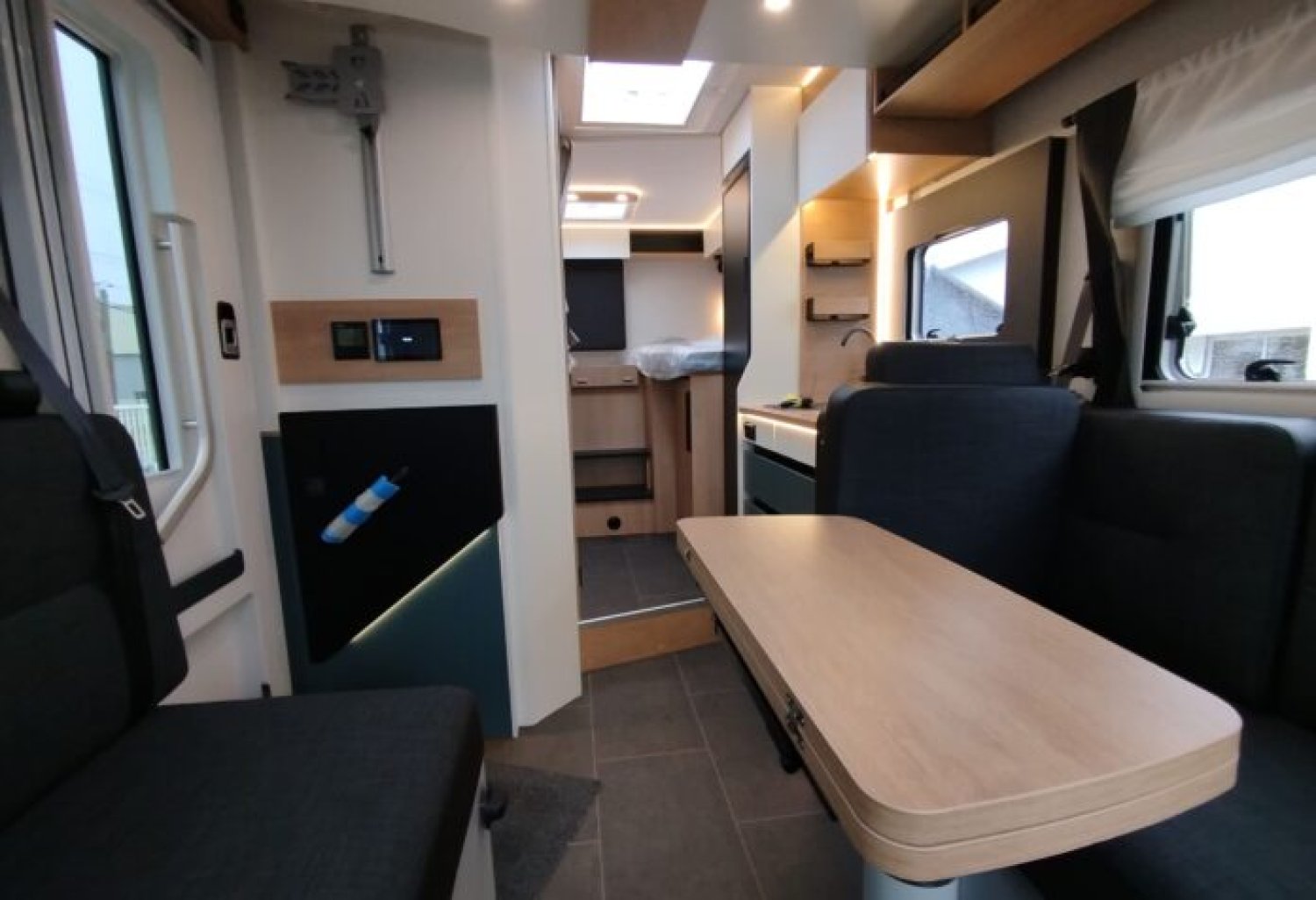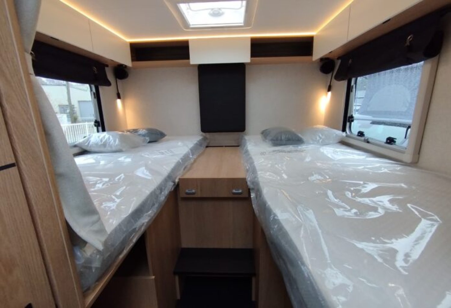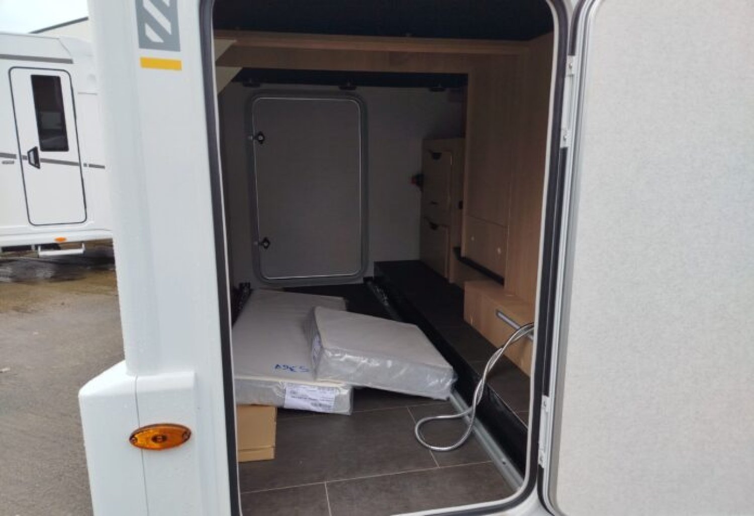 Soit : éclairage, prise 230V et rails en soute, douchette, store banne, caillebotis, inverseur automatique, crash sensor, réservoir eaux usées hors-gel, poubelle intégrée et porte-serviette