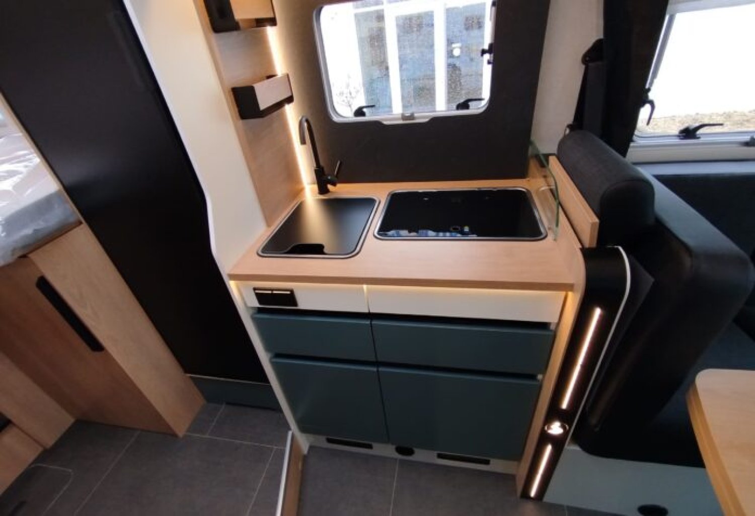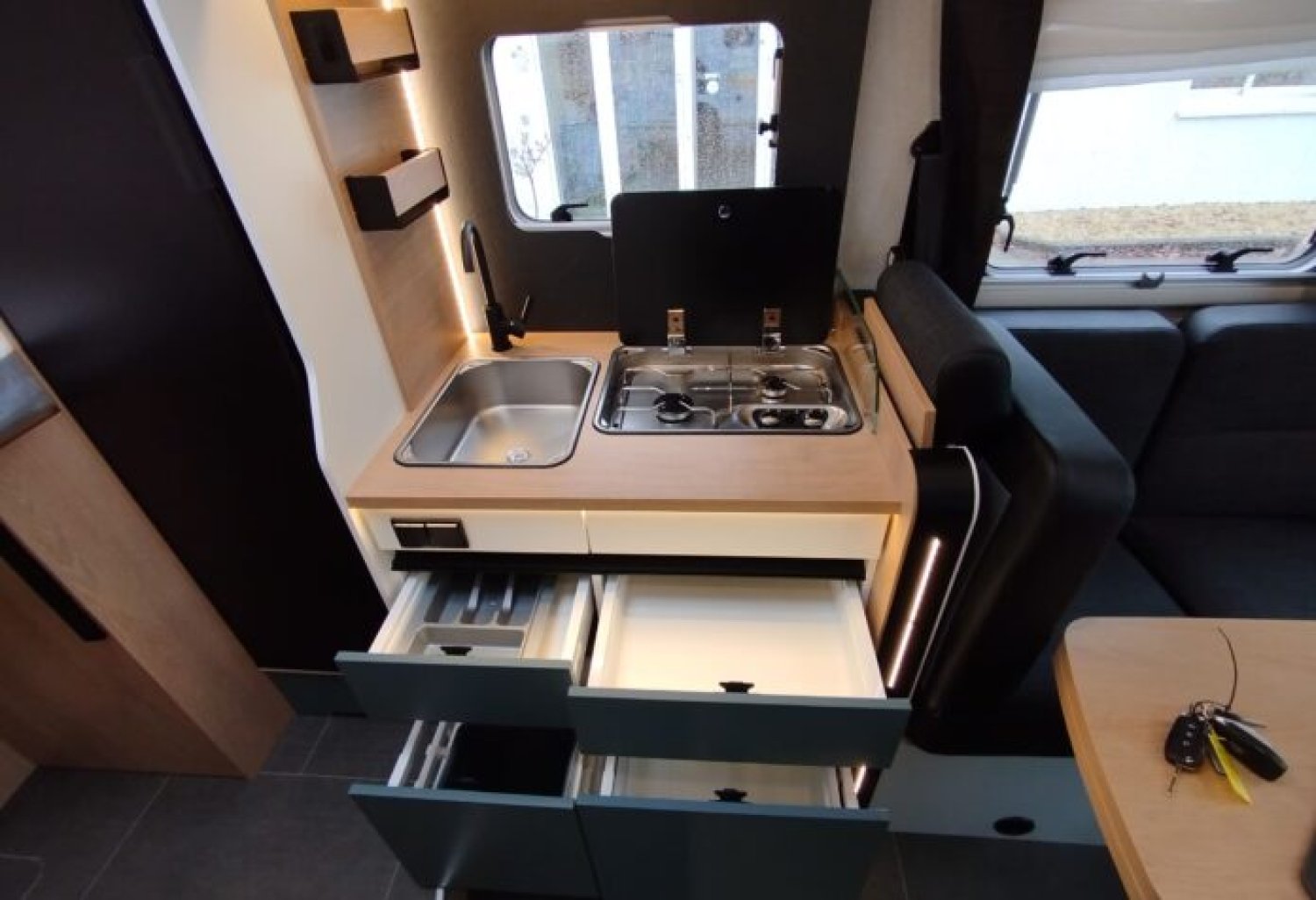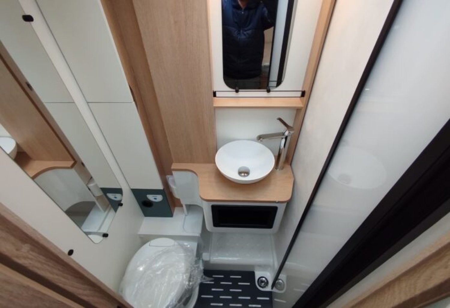 Soit : éclairage, prise 230V et rails en soute, douchette, store banne, caillebotis, inverseur automatique, crash sensor, réservoir eaux usées hors-gel, poubelle intégrée et porte-serviette