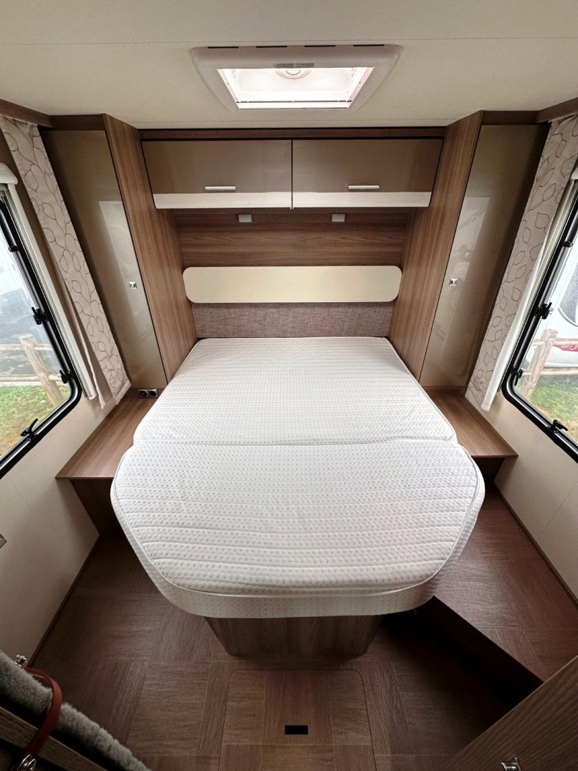 Profilé LMC, 4 couchages, lit central sur soute garage (plusieurs vélos), salle de bain avec grande douche entièrement séparée, double fermeture chambre arrière, cuisine spacieuse et toute équipée, vaste salon avant avec sièges pivotant et table centrale + lit pavillon électrique pour deux adultes.