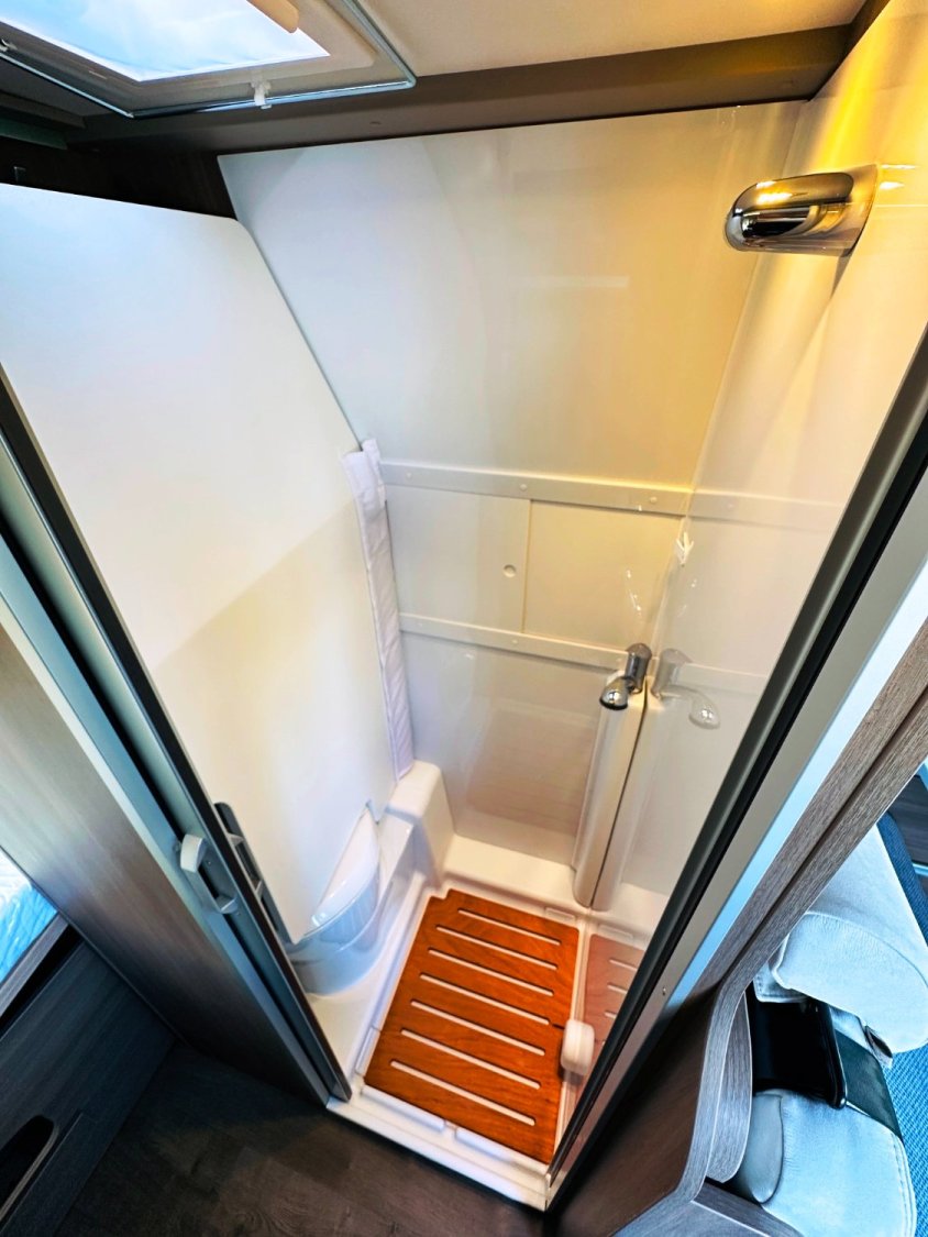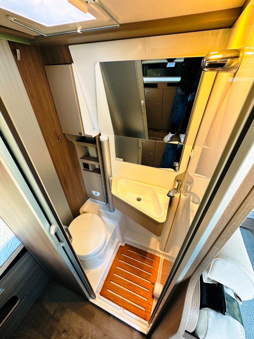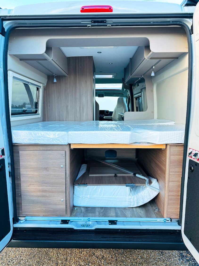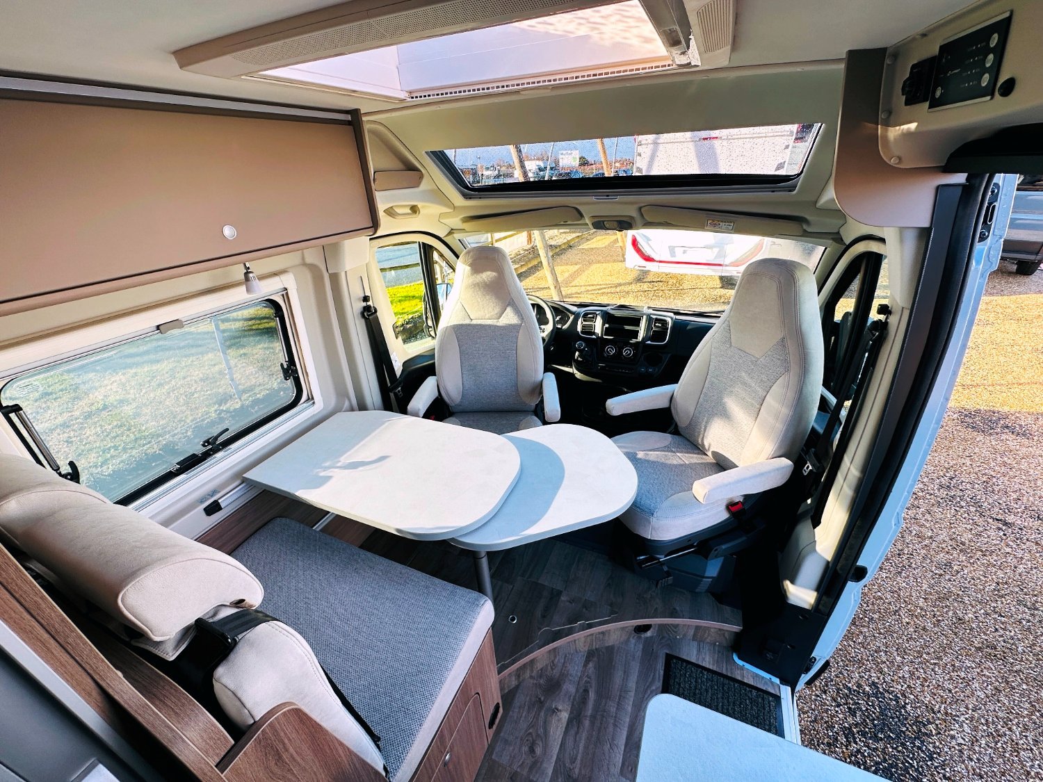 CARADO CV 600 PRO +, collection 2026, 5.99 M, 3 couchages, lit permanent arrière modulable (possibilité de dégager un vaste couloir), salle de bain vario convertible en vaste douche, salon avant avec sièges pivotant. Cuisine droite équipée de nombreux rangements et d’un vaste plan de travail.