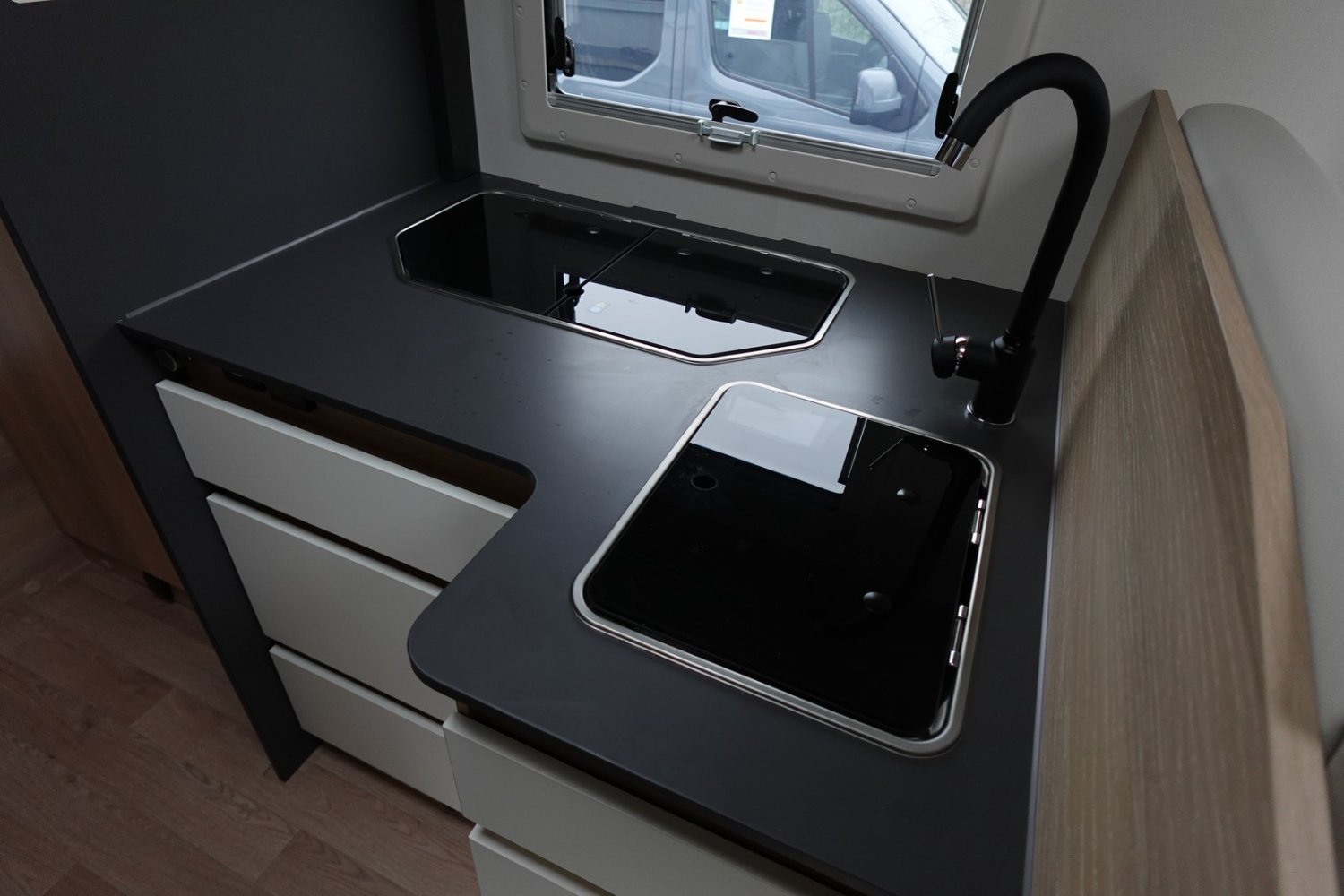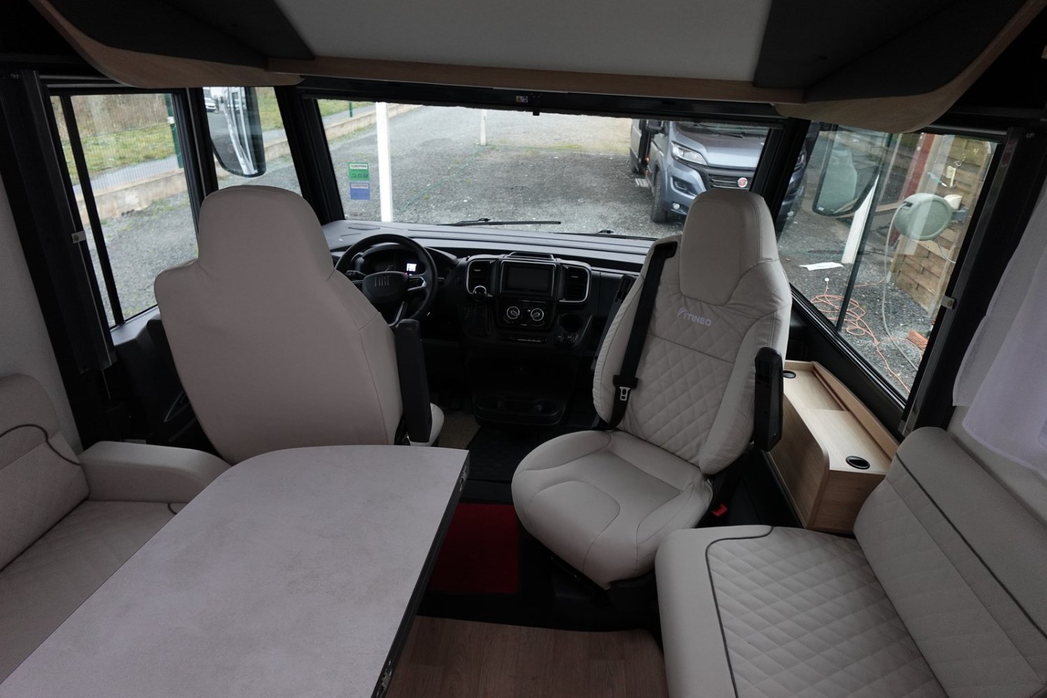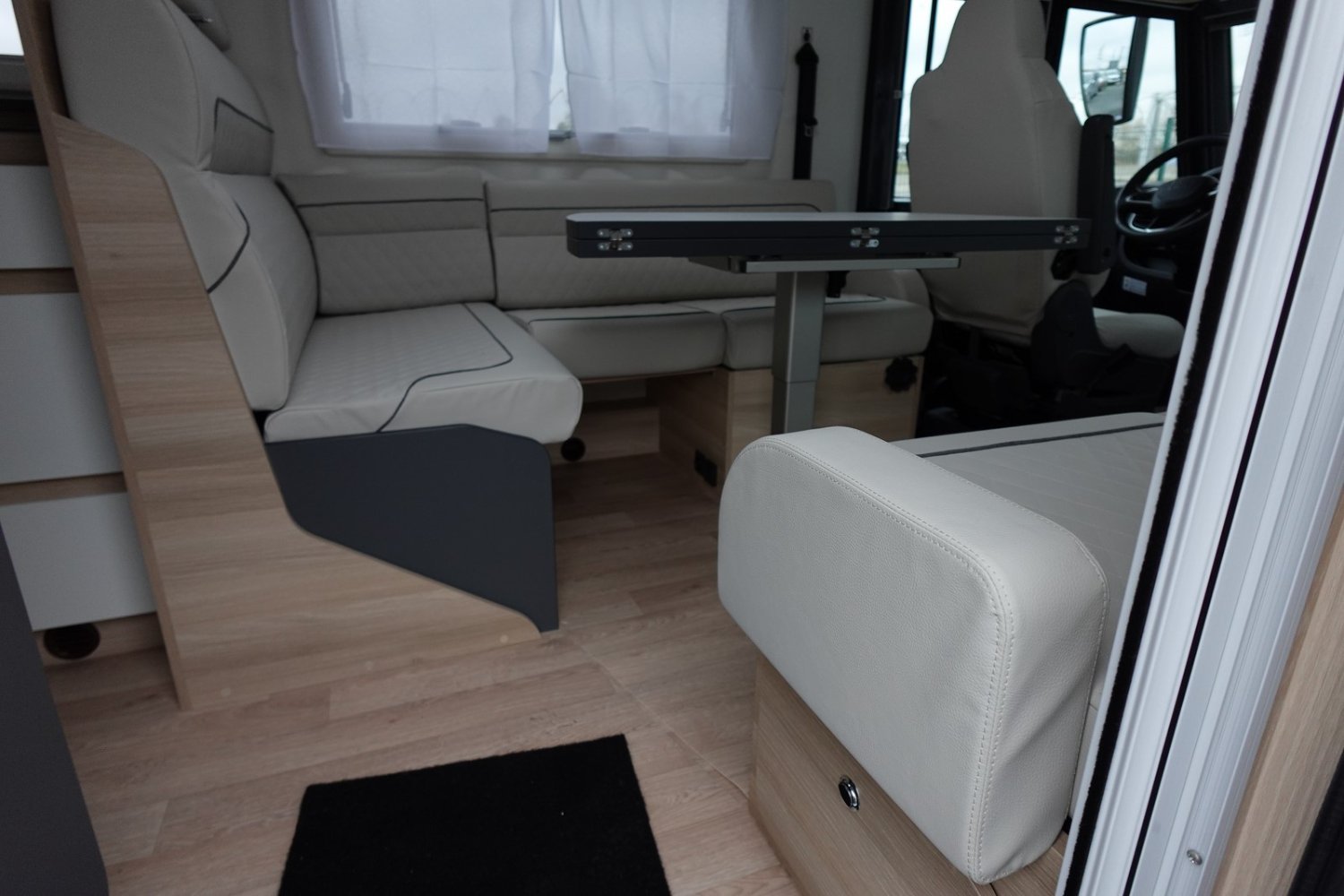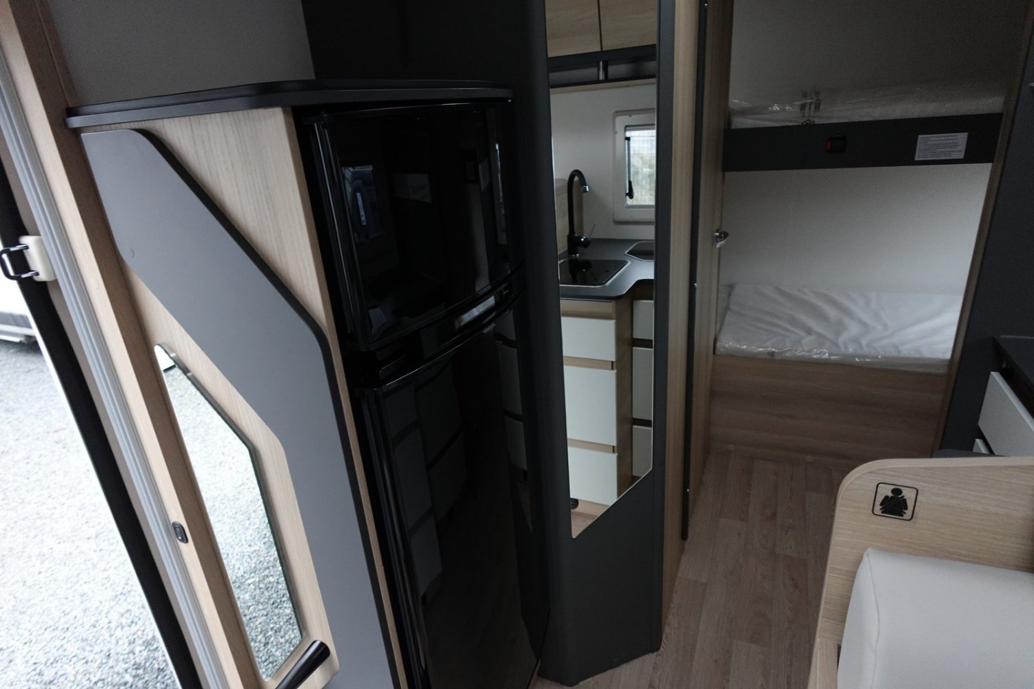 Intégral familial comprenant un grand salon avant panoramique, une salle d’eau avec douche séparée, des lits superposés, un lit de pavillon 2 places et une cuisine en L avec de nombreux rangements. Le tout en 6 places carte grise et couchage.