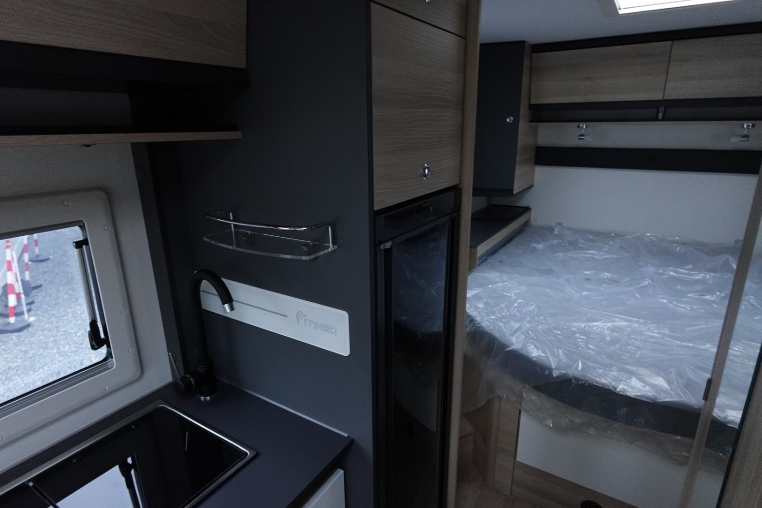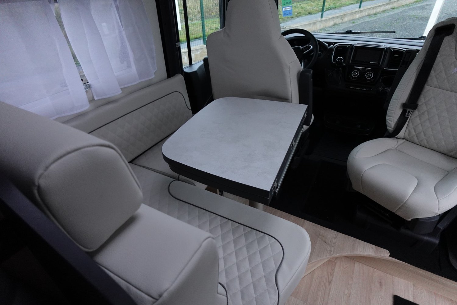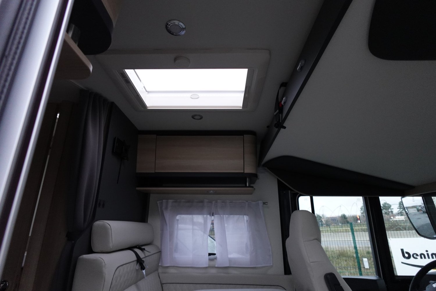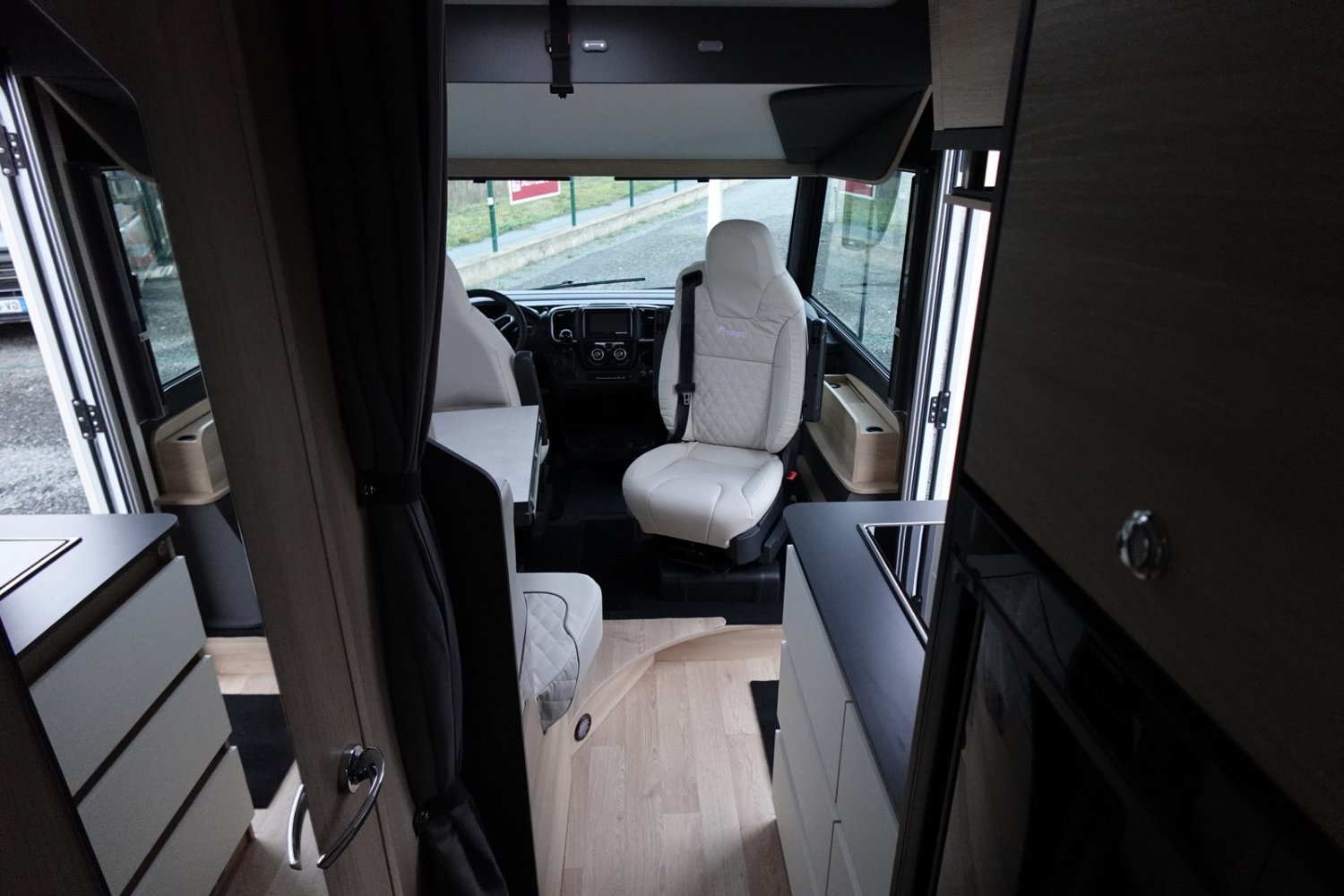 Intégral compact de 6.61m comprenant un salon avant panoramique, une salle d’eau DUO’SPACE avec paroi de douche pivotante, un lit central, un lit de pavillon 2 places et une cuisine avec de nombreux rangements.