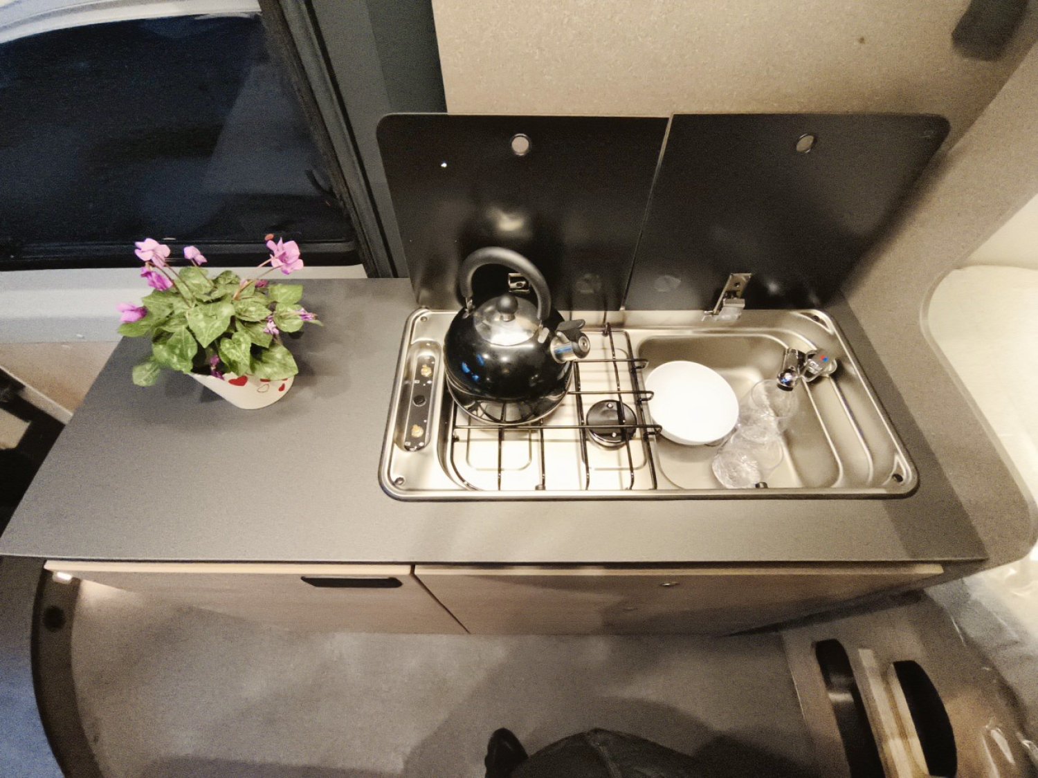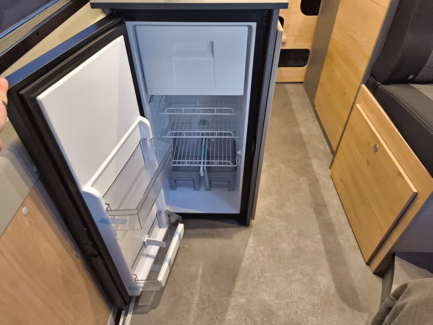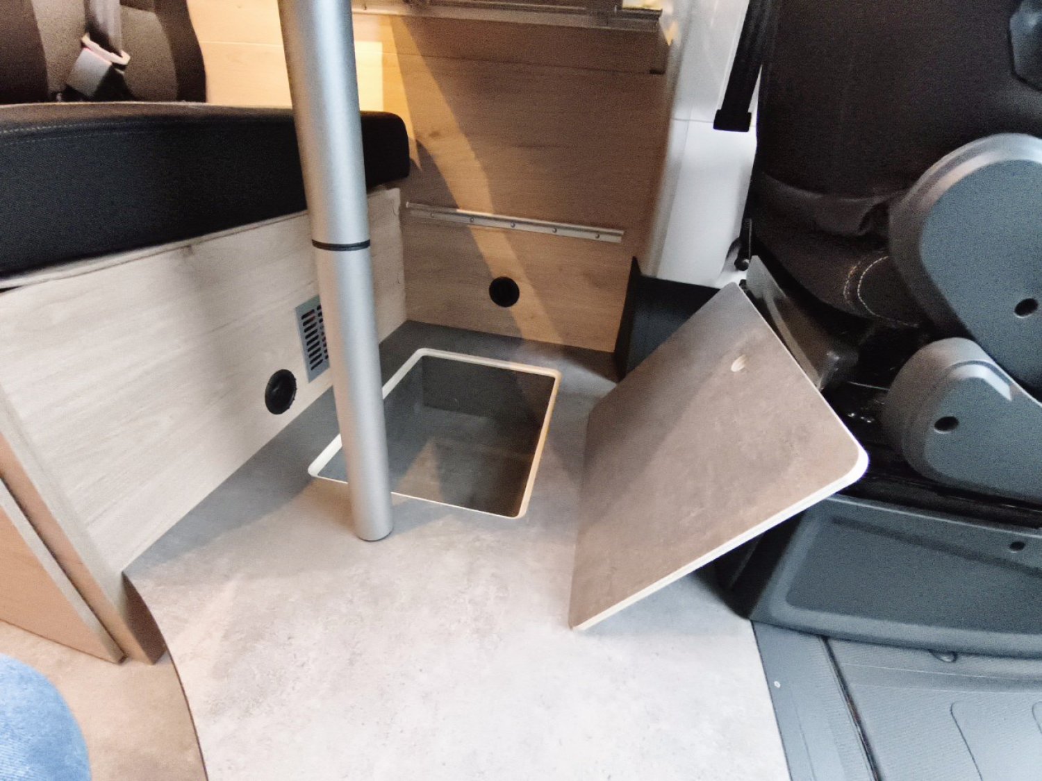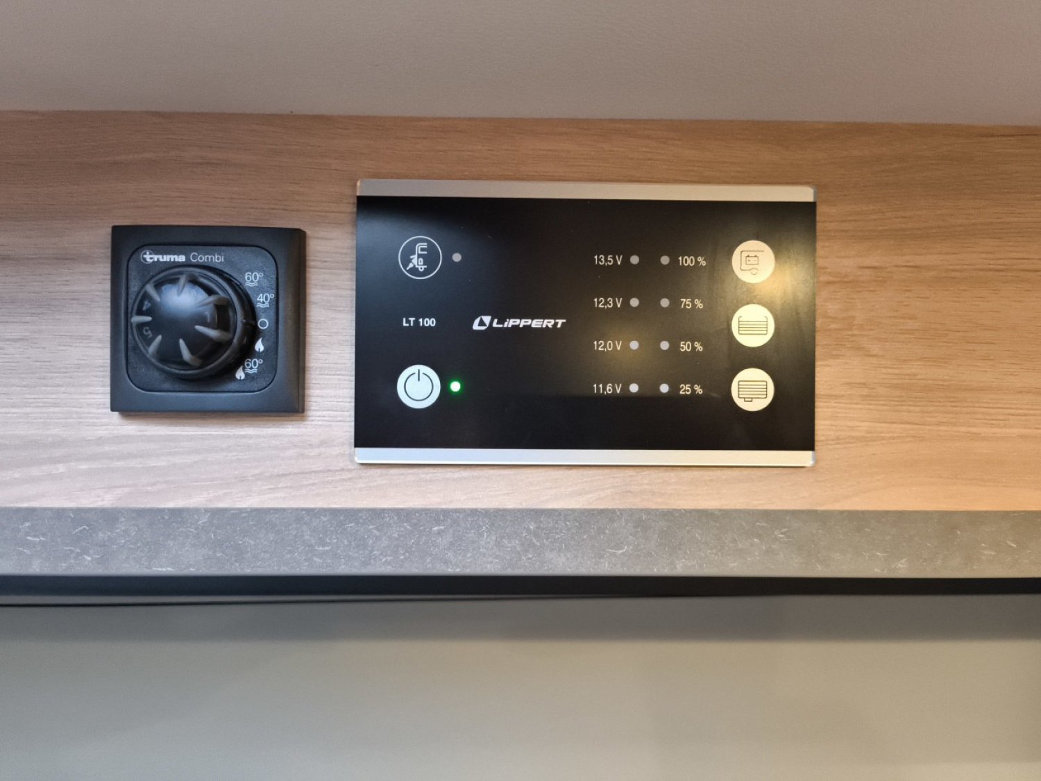 Prise 230V dans le meuble haut avant gauche (dînette), Prise 12V à l'arrière, en bas à gauche