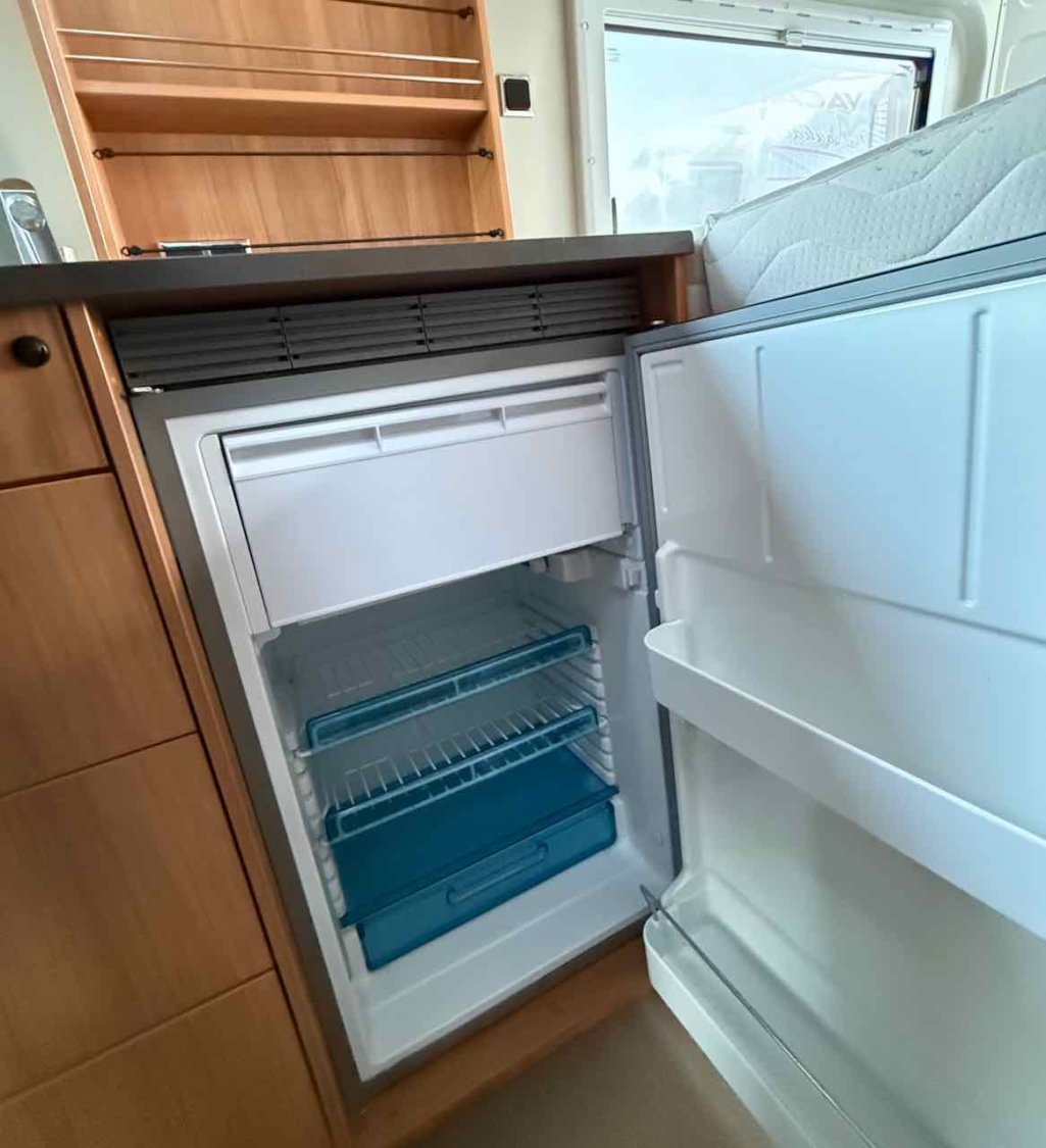 Cuisine fonctionnelle avec plan de travail agréable, nombreux rangements, réchaud 2 feux et réfrigérateur à compression 100 L avec freezer