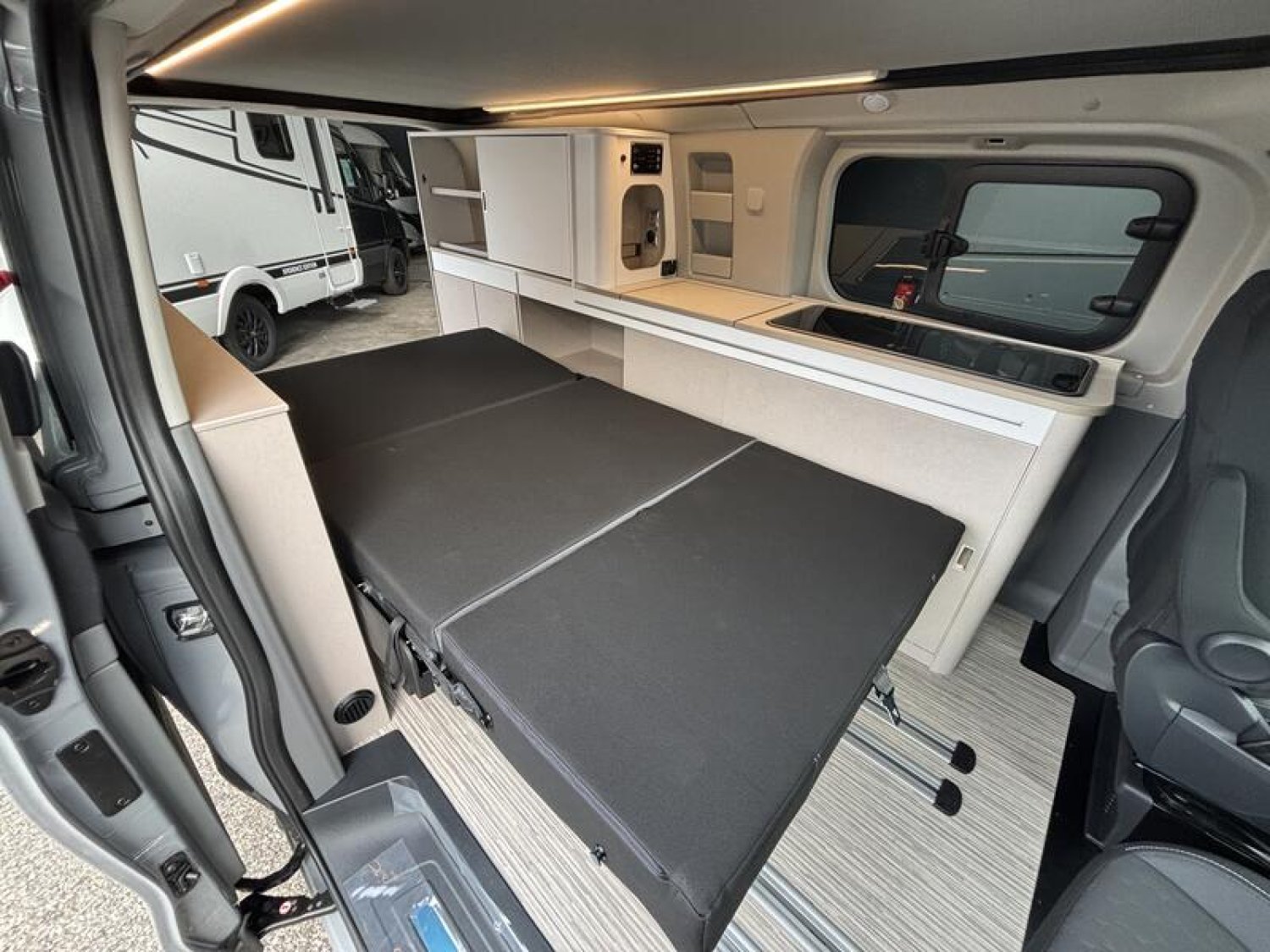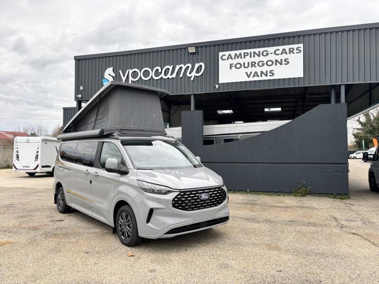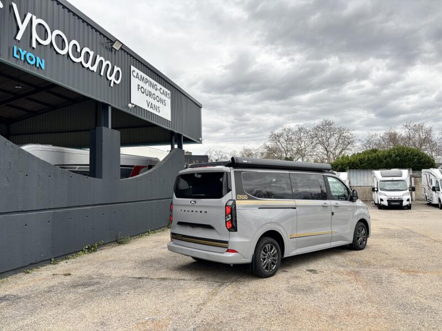 SERIE LIMITEE B66 Ford Tourneo Custom V 710 - 170 ch – Titanium / Boîte automatique / Peinture extérieure Gris Matter avec toit relevable anthracite / Réservoir carburant 70 litres / Climatisation bi-zone (zone conducteur et passager) / Pré-équipement attelage / Jantes alu 17’’ avec pneus 4 saisons / Store extérieur anthracite 3,0 m / OEillets d'arrimage pour le système de rails coulissants /Chauffage stationnaire Diesel 2 kW/Régulateur de vitesse adaptatif et système Stop & Go / Système de navigation intégré écran 13‘‘ / Caméra de recul / Avertisseur d’angle mort / Système de reconnaissance des panneaux de signalisation / Assistance au freinage d'urgence / Projecteurs LED / Volant chauffant / Stores occultants cabine et habitation : 0 €