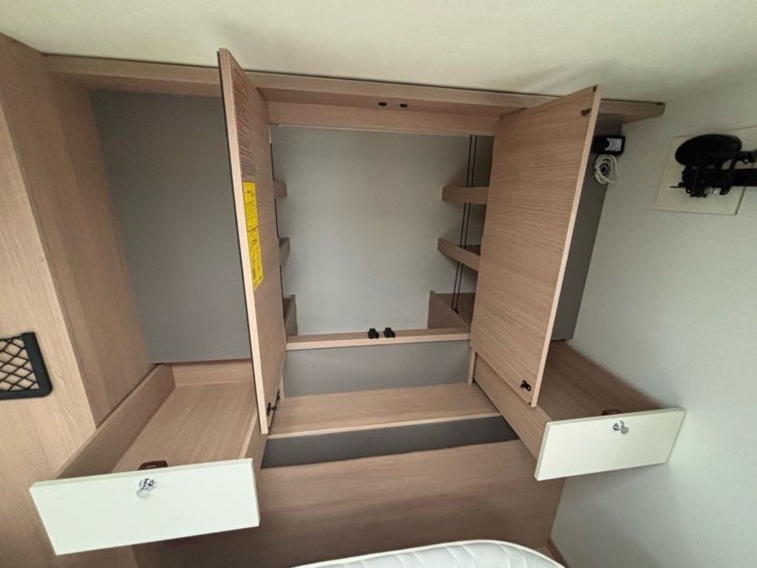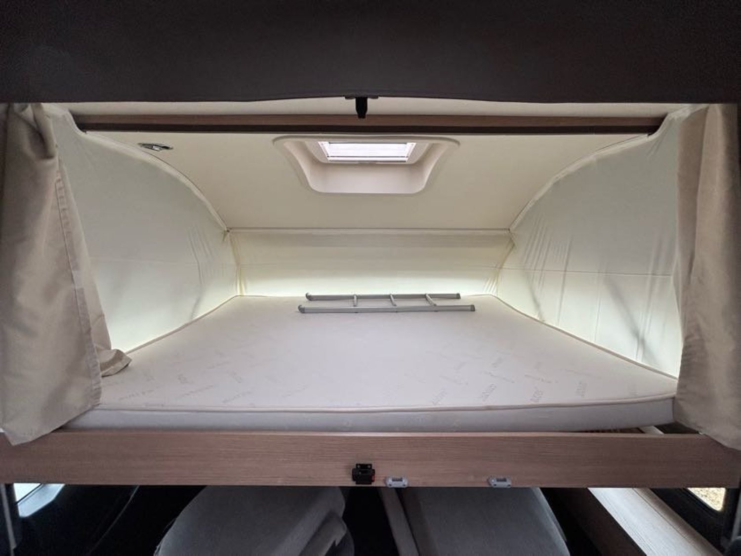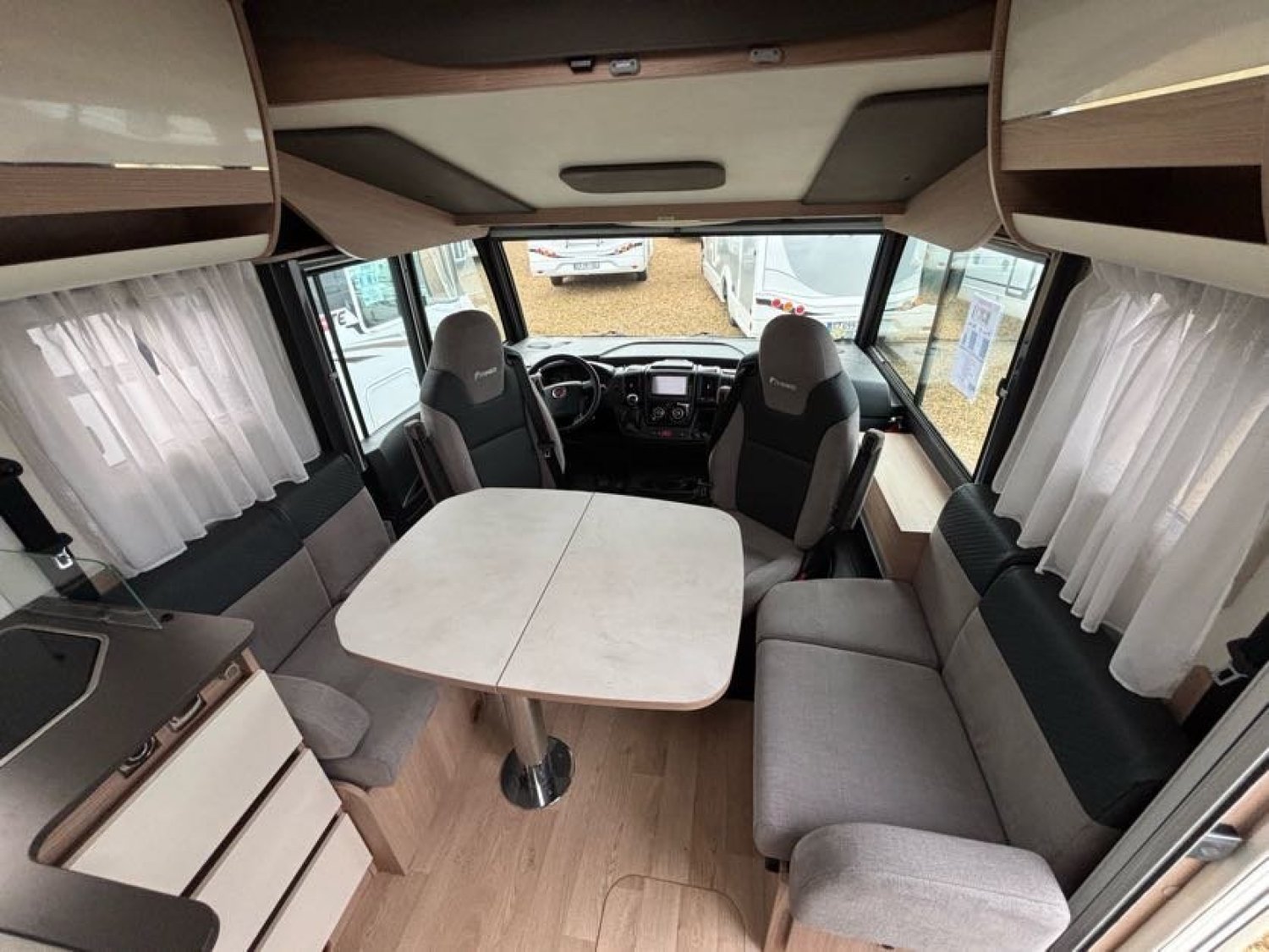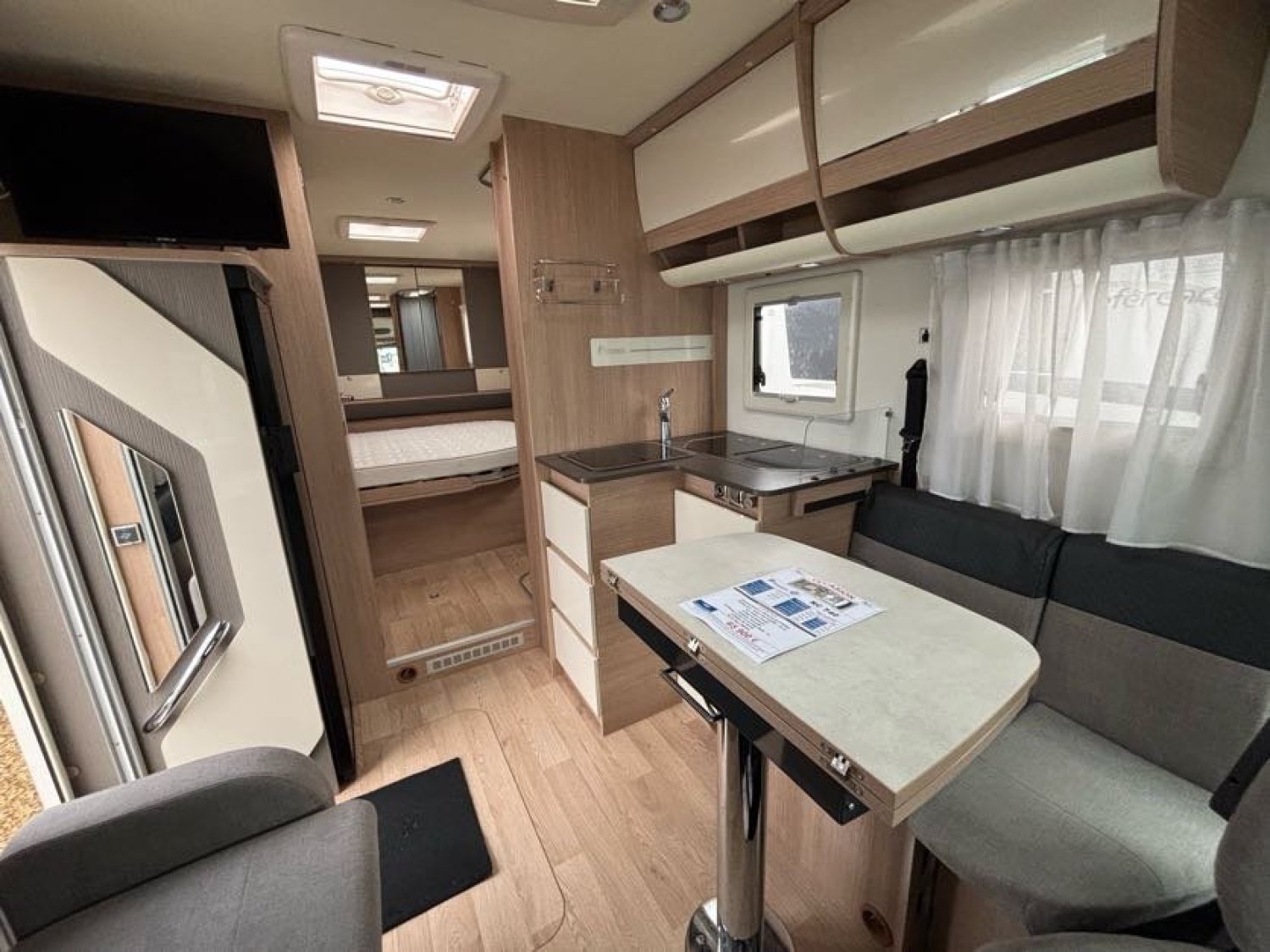 Cuisine en L, Lit central transversal, lit pavillon cabine, Salon avant banquettes face à face, Salon avant sièges pivotants, WC Cassette.