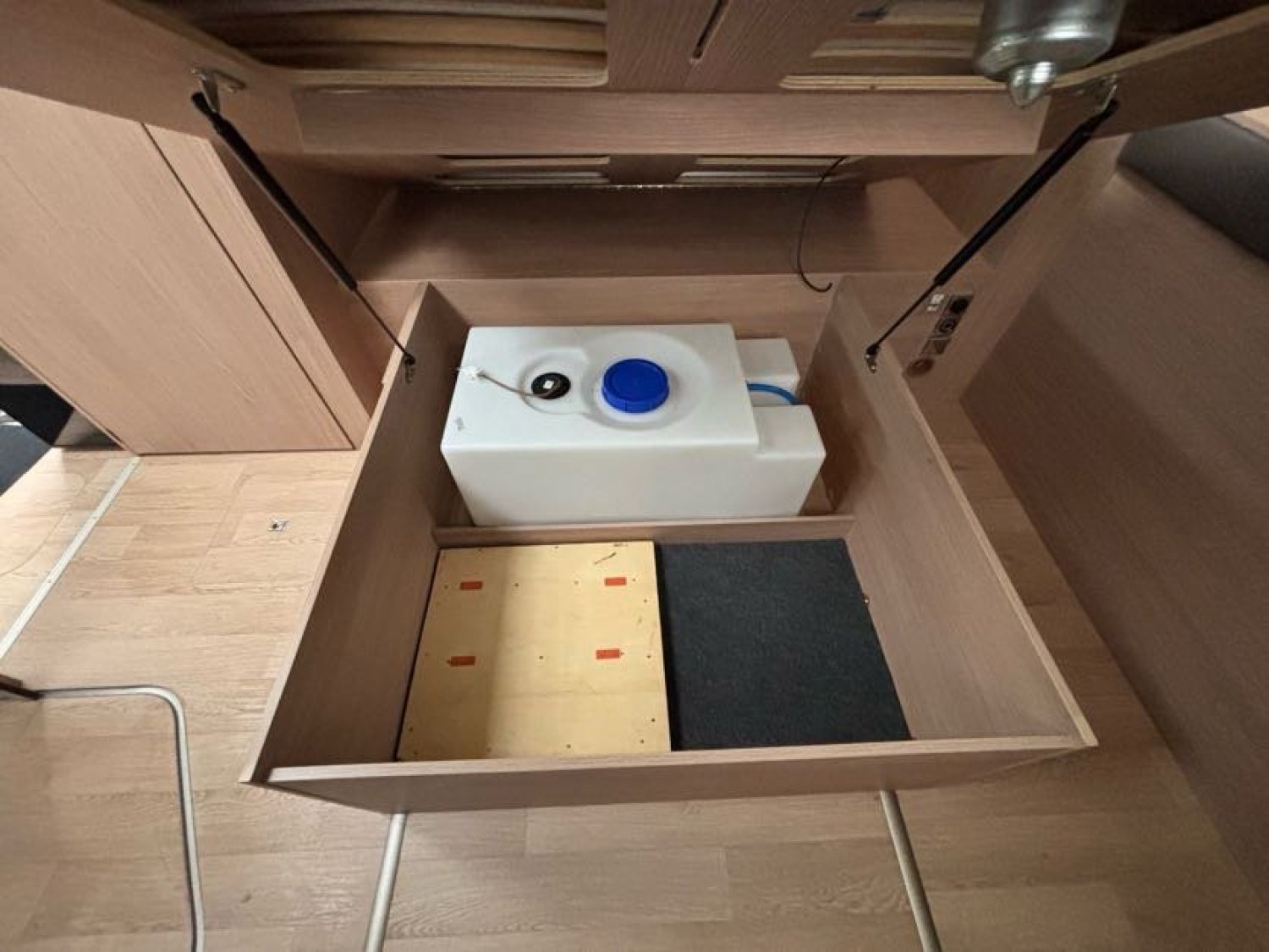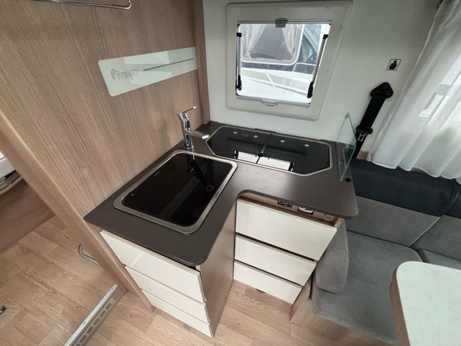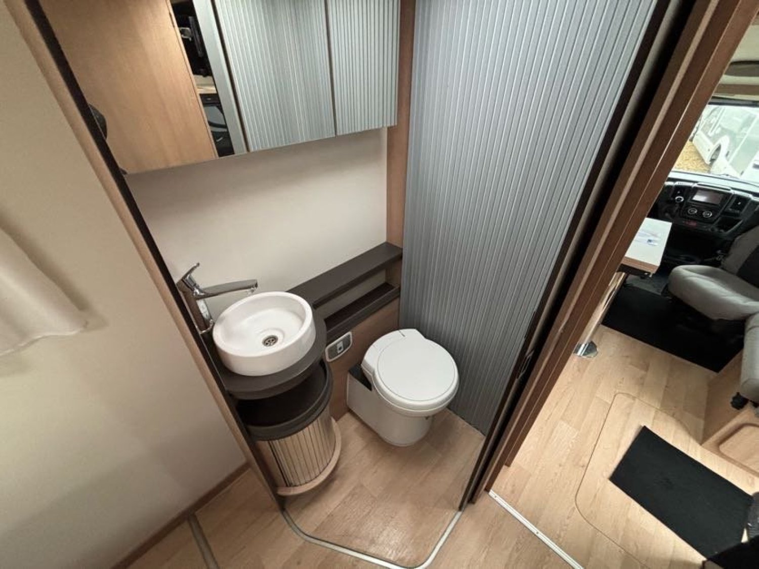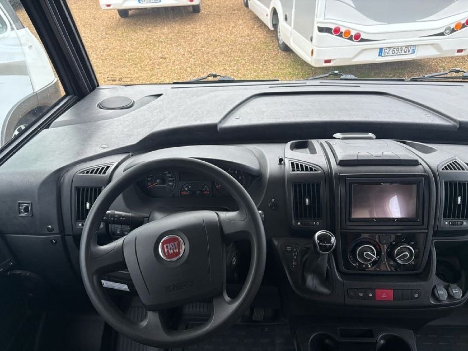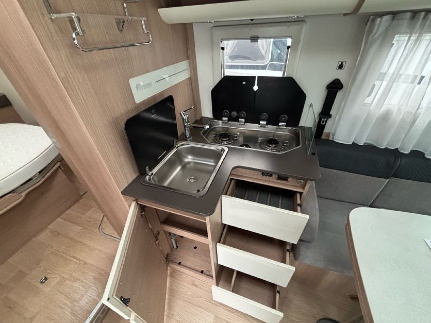 Cuisine en L, Lit central transversal, lit pavillon cabine, Salon avant banquettes face à face, Salon avant sièges pivotants, WC Cassette.