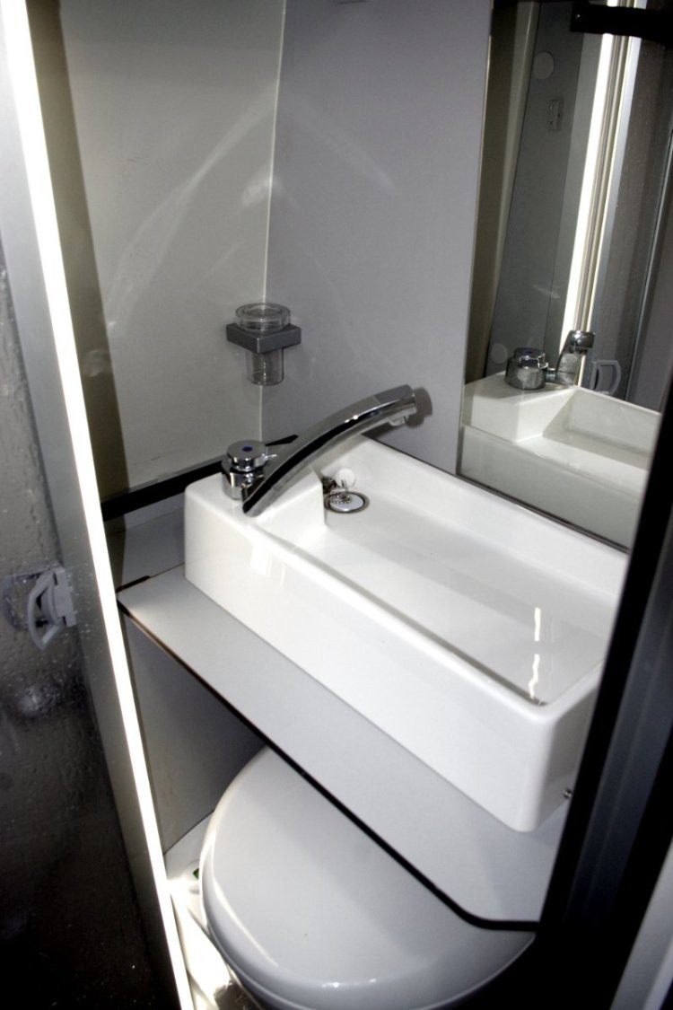 - Salle de bain, 3 en 1TB Concept, fermée par porte coulissante, avec douche, lavabo, rangements et WC entretien par cassette extractible 18 litres à l’extérieur,