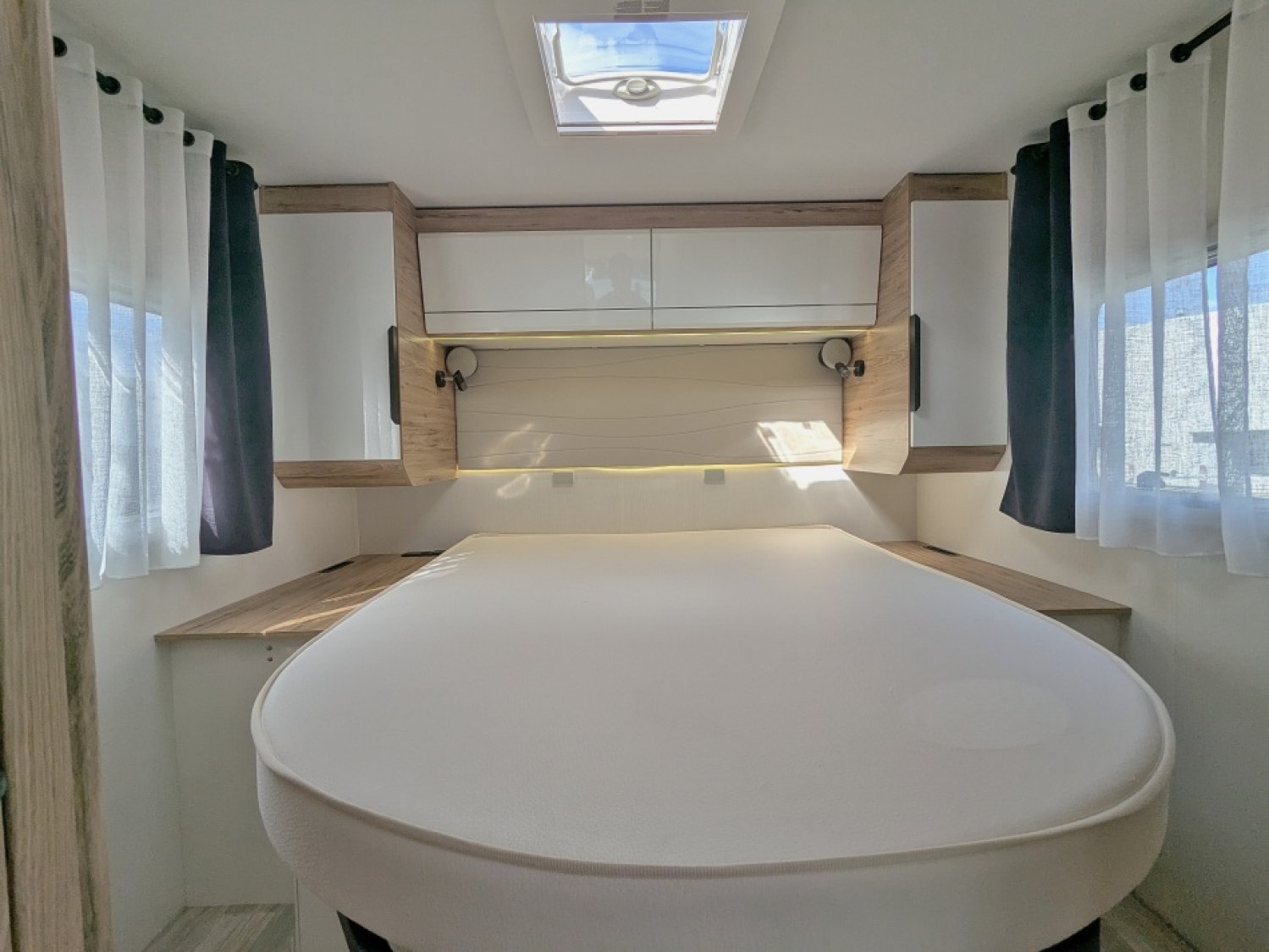 Camping-car intégral en très bon état sur Fiat 2,2 JTD 160 cv boîte automatique avec lit central, salle d'eau/WC, douche indépendante, cuisine équipée de frigo conservateur de 150 L, plaque gaz et de nombreux tiroirs fonctionnels, et salon avant avec sièges pivotants. Lit de pavillon de deux persoinnes au-dessus des sièges conducteur et passager.