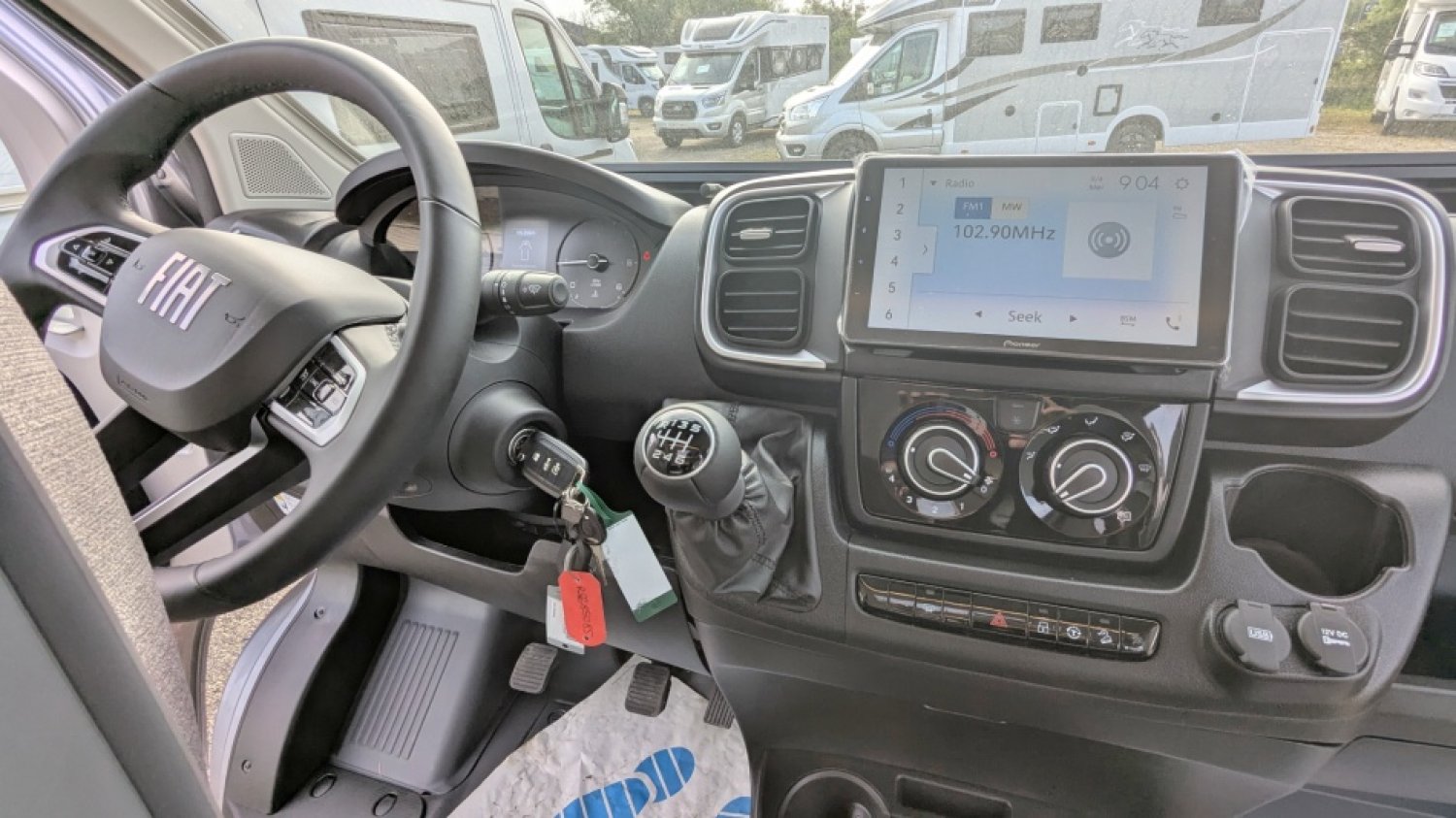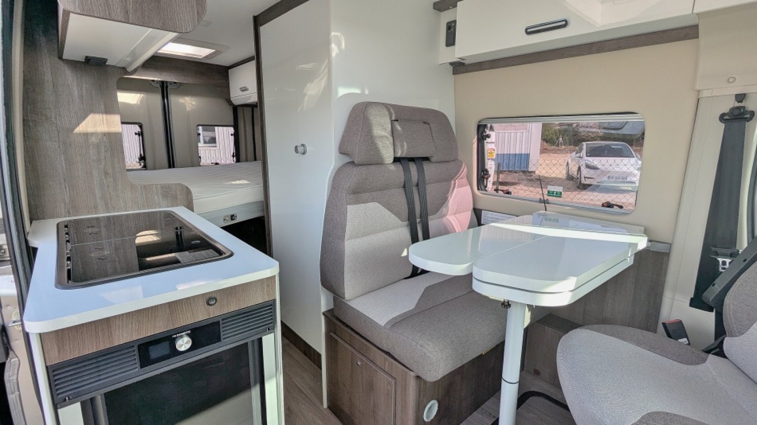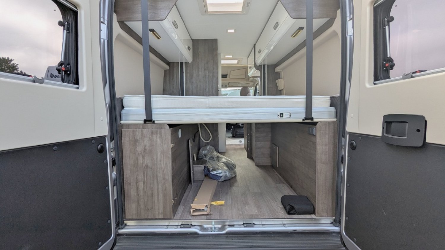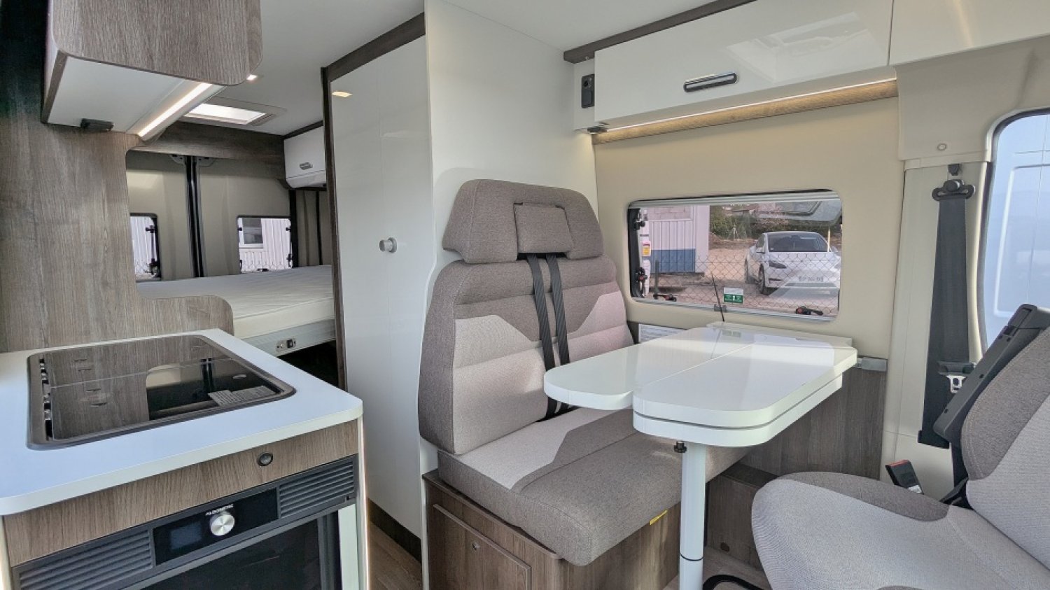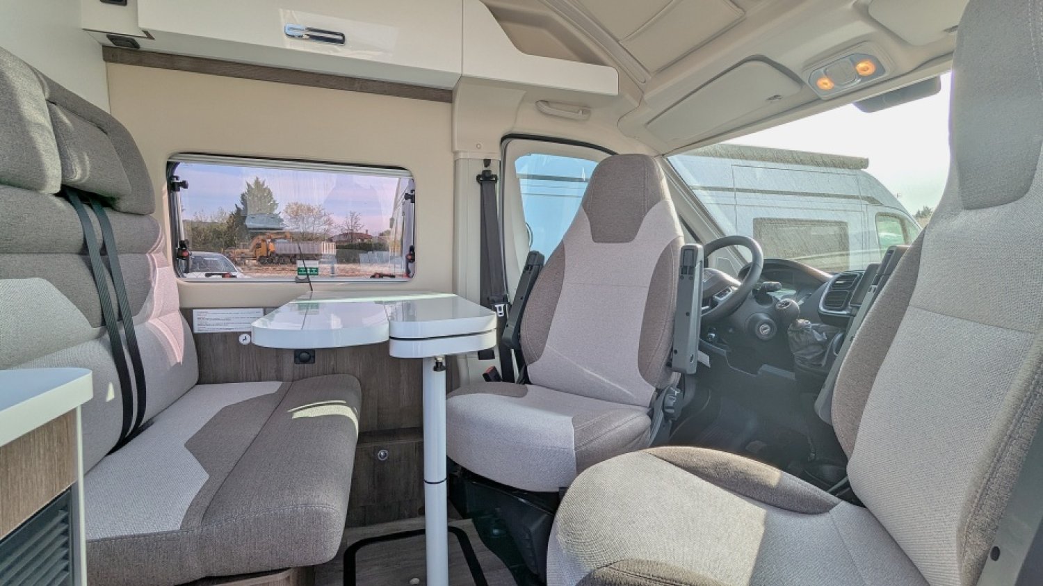 Benivan 191 Plus sur Fiat 2,2 140 cv, fourgon aménagé avec lit transversal réglable en hauteur électriquement, salle d'eau/WC avec douche, cuisine avec frigo à compression et maxi salon avec sièges pivotants.
