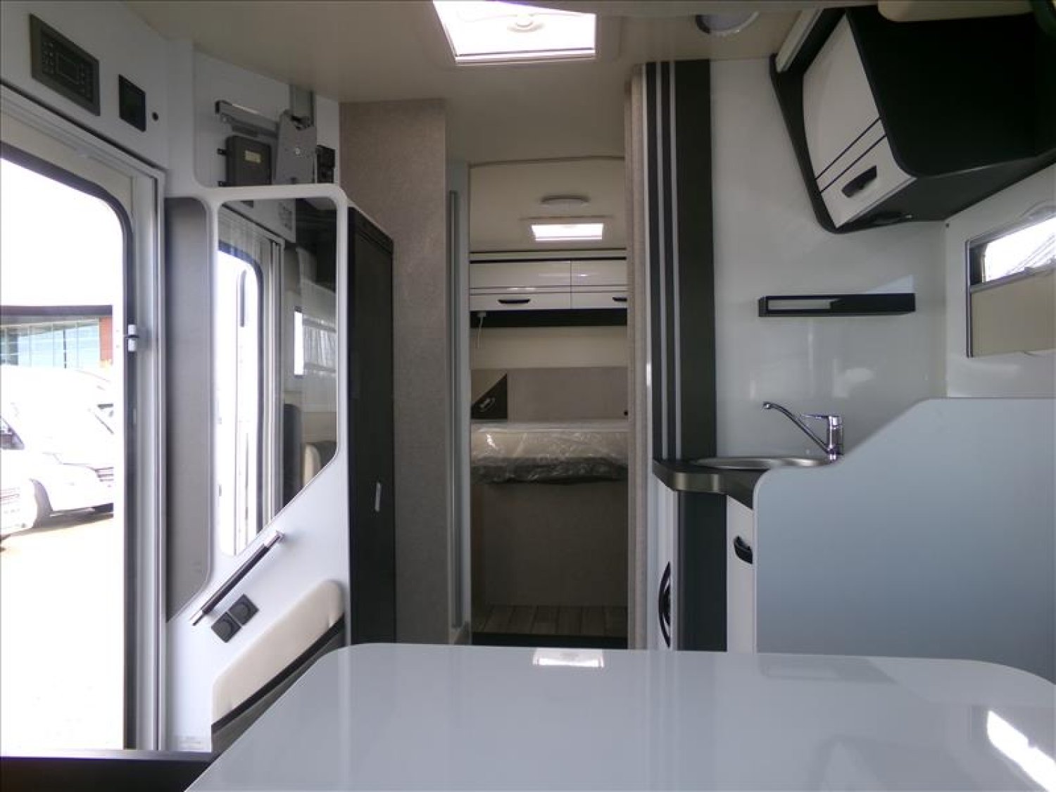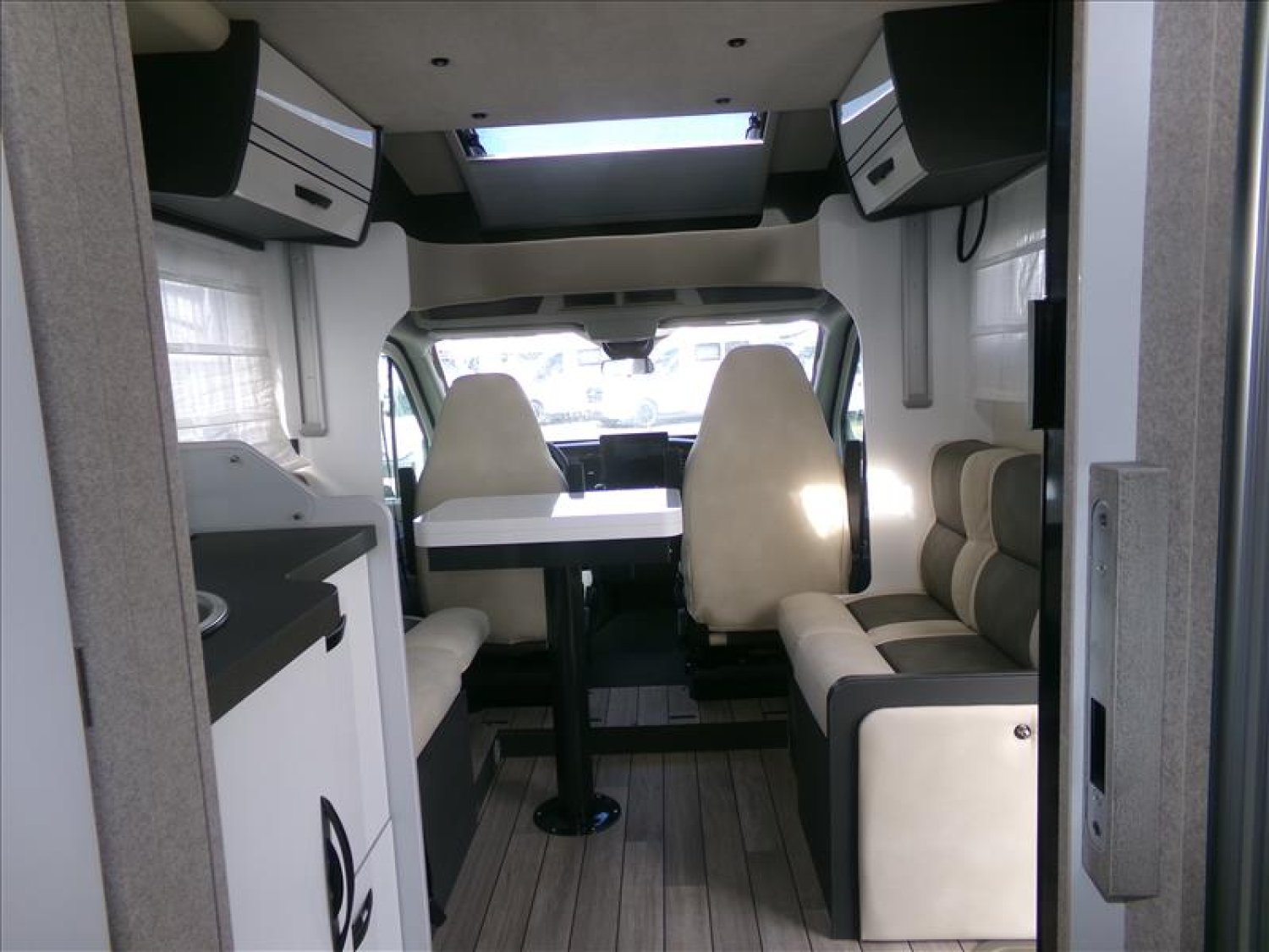 Activation auto des phares, Ecran tactile 12" système d'infodivertissement SYNC4modem5g, Tableau de bord semi-numérique 8", Store cabine thermique, Lit pavillon, Garage XXL jusqu'à 300kg, Prise 220v garage, Fenetre seitz, Essuie-glaces automatique, Fein à main électrique, Caméra de recul, TPMS, Régulateur de vitesse avec assistant de vitesse, Commandes radio volant, Clim auto cabine, Feux antibouillards