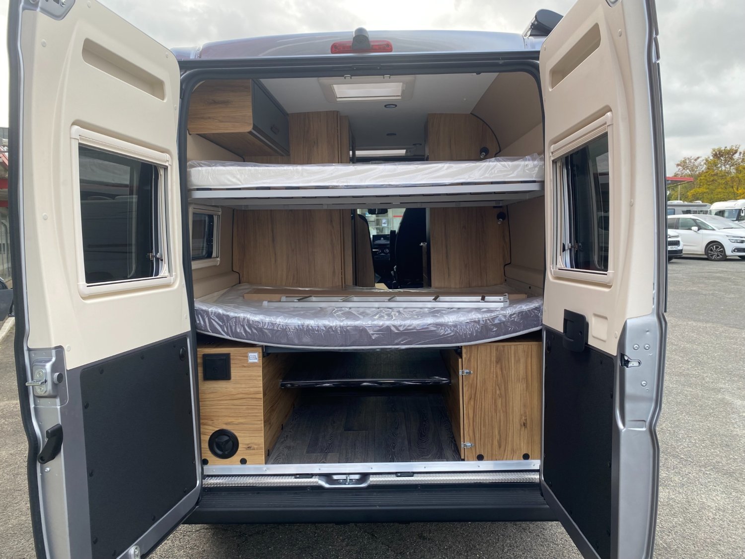 Rétroviseurs à commande électrique et dégivrants, Sonde de réchauffage du réservoir des eaux usées, Store auvent, Suspension renforcée, Airbags conducteur et passager, Alerte de franchissement de ligne, Batterie Lithium 120 Ah, Système de prévention de collision, Douchette extérieure eau froide, Essuie-glaces avant automatiques avec détecteur de pluie, Jantes Alu 16", Limiteur de vitesse, Moustiquaire de porte latérale, Pack Safety, Pack multimédia avec Apple CarPlay Android Auto, Panneaux solaires, Reconnaissance des panneaux de vitesse, Réfrigérateur à compression 138 L, Régulateur de vitesse, Rétro-camera de recul, Chargeur de batterie DC-DC, Climatisation avant de cabine, Combiné chauffage - chauffe-eau Truma D4 gasoil avec kit alt, Boîte de vitesse automatique, Caillebotis de douche