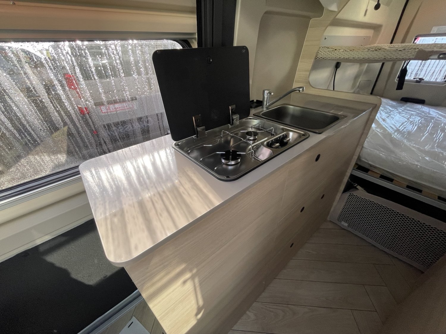 Jantes acier avec enjoliveurs 15'' gris, Pré-équipement TV, Régulateur/limiteur de vitesse, Traction +, Hill descent control, Chauffage au gaz, Sièges de cabine pivotants réglables en hauteur + accoudoirs, Climatisation manuelle de cabine, Rétroviseurs électriques dégivrants, Extension table dinette, Marchepied électrique, Fenêtres double-vitrage avec combiné stores moustiquaire, Lanterneau panoramique