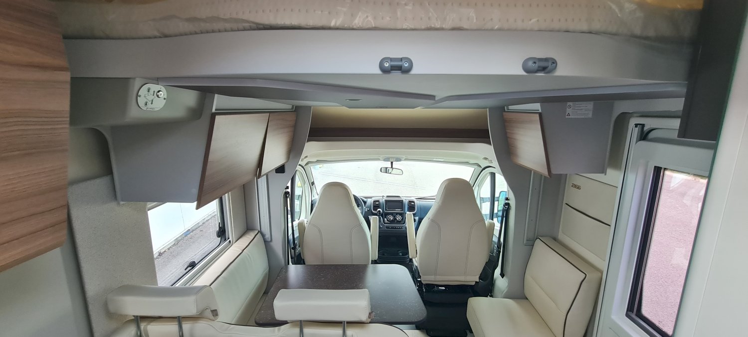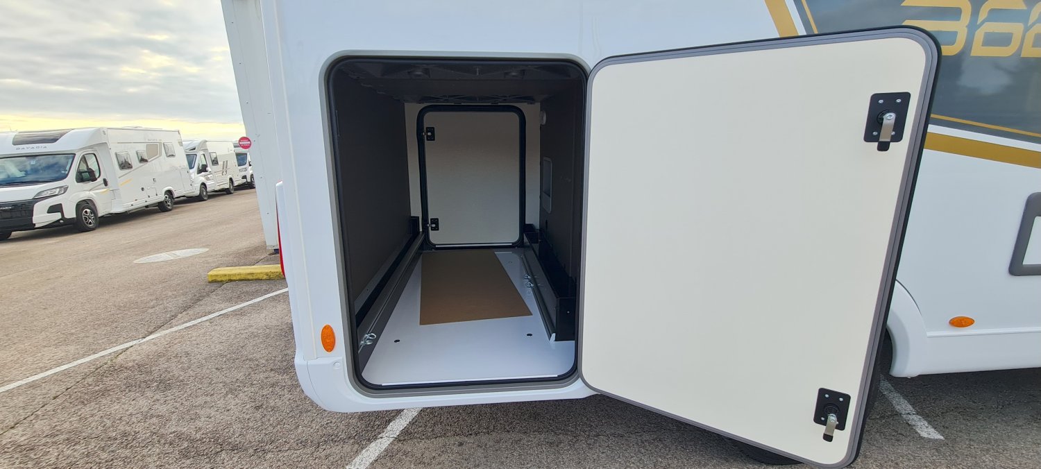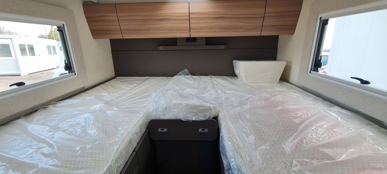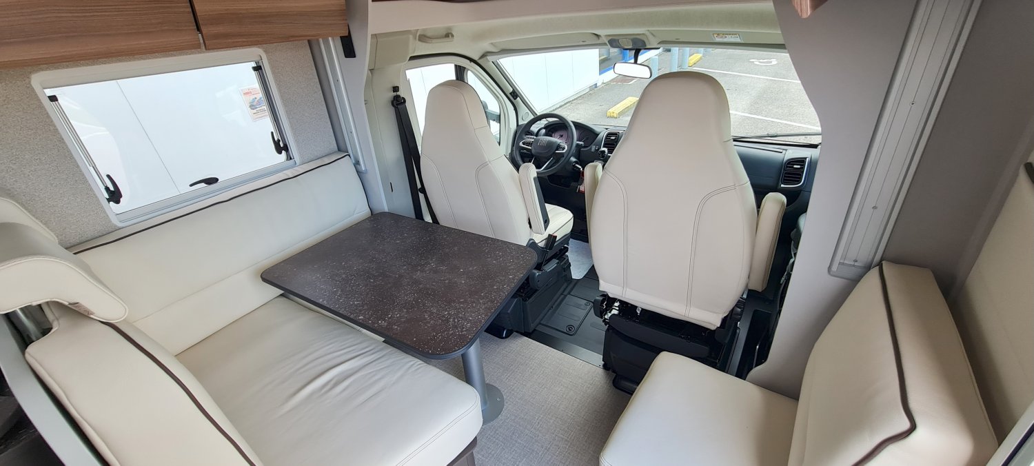 Boîte automatique 140 ch, Jantes aluminium 16’’ bicolores, Station multimédia avec caméra de recul, Batterie lithium, Réfrigérateur à compression 131,5 l, Double plancher technique Thermo-Floor isolé et chauffé, Dînette en L + table monopode et plateau de table orientable, Porte d’entrée XL avec baie et moustiquaire