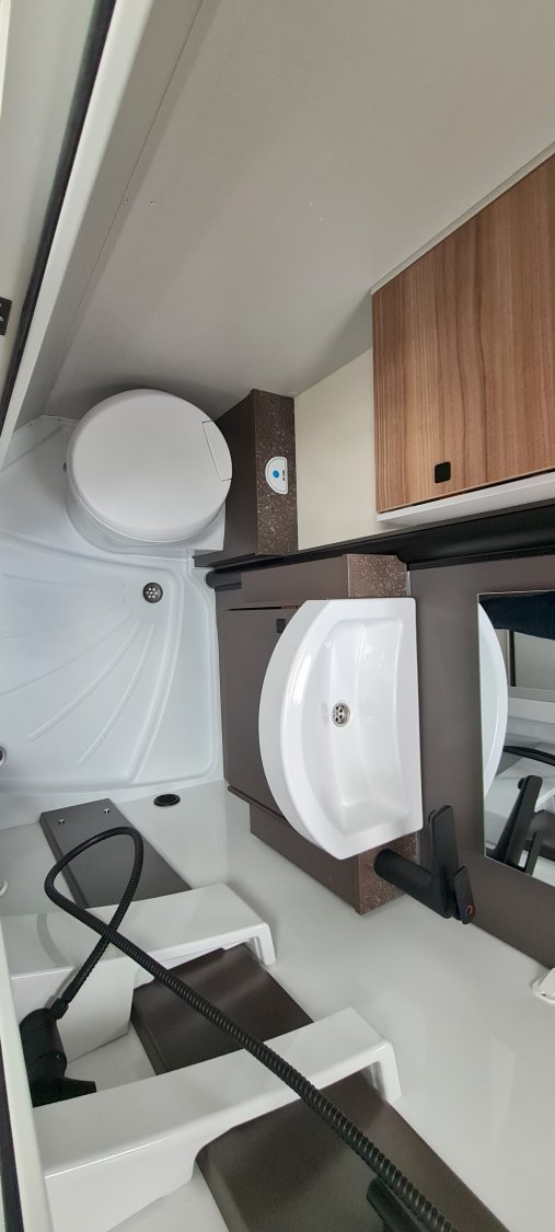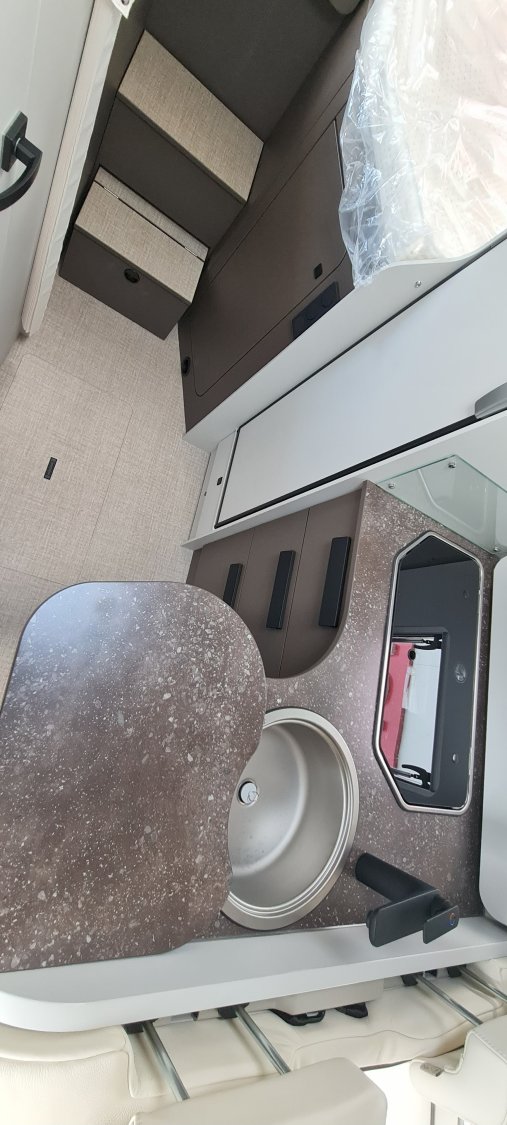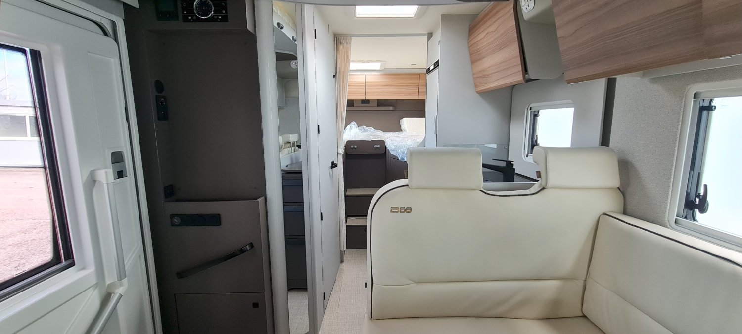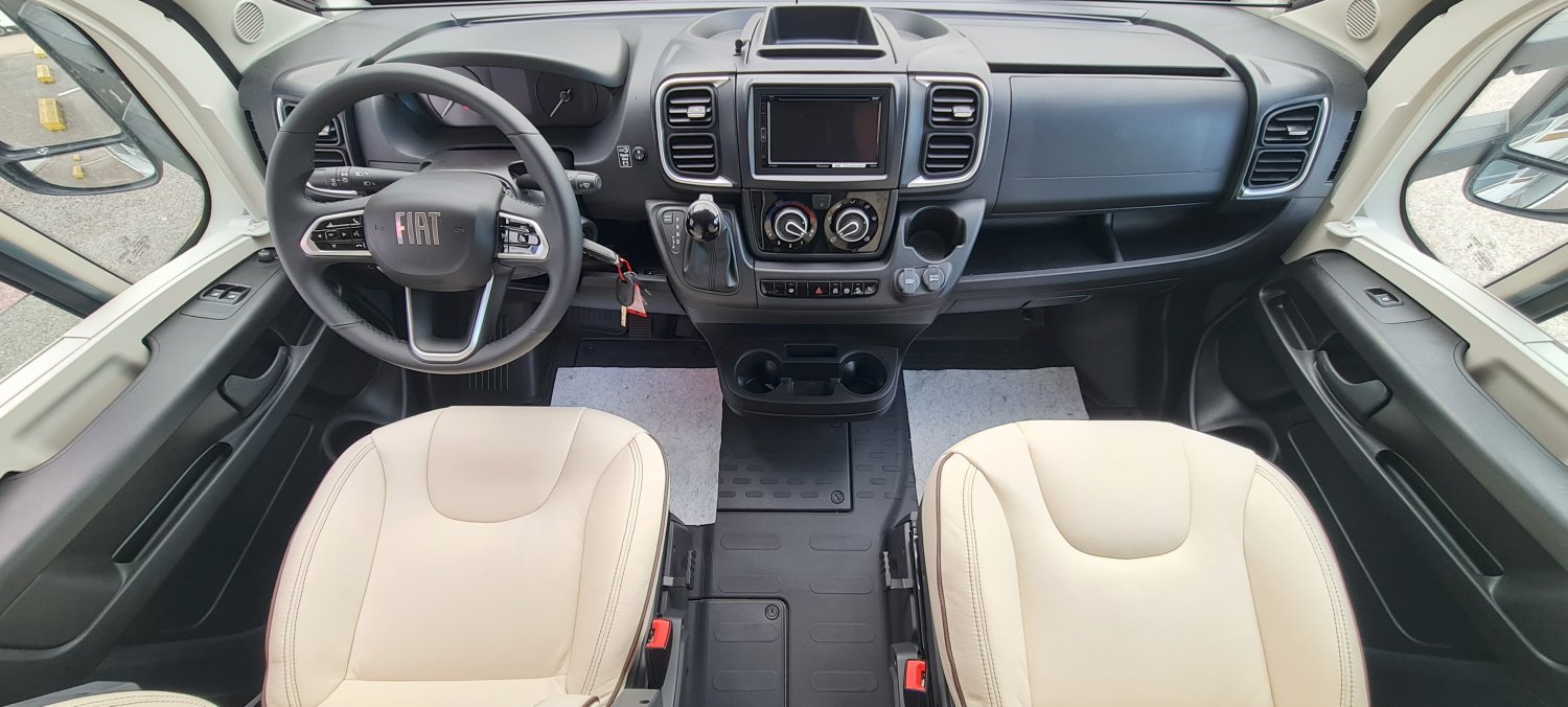 Boîte automatique 140 ch, Jantes aluminium 16’’ bicolores, Station multimédia avec caméra de recul, Batterie lithium, Réfrigérateur à compression 131,5 l, Double plancher technique Thermo-Floor isolé et chauffé, Dînette en L + table monopode et plateau de table orientable, Porte d’entrée XL avec baie et moustiquaire